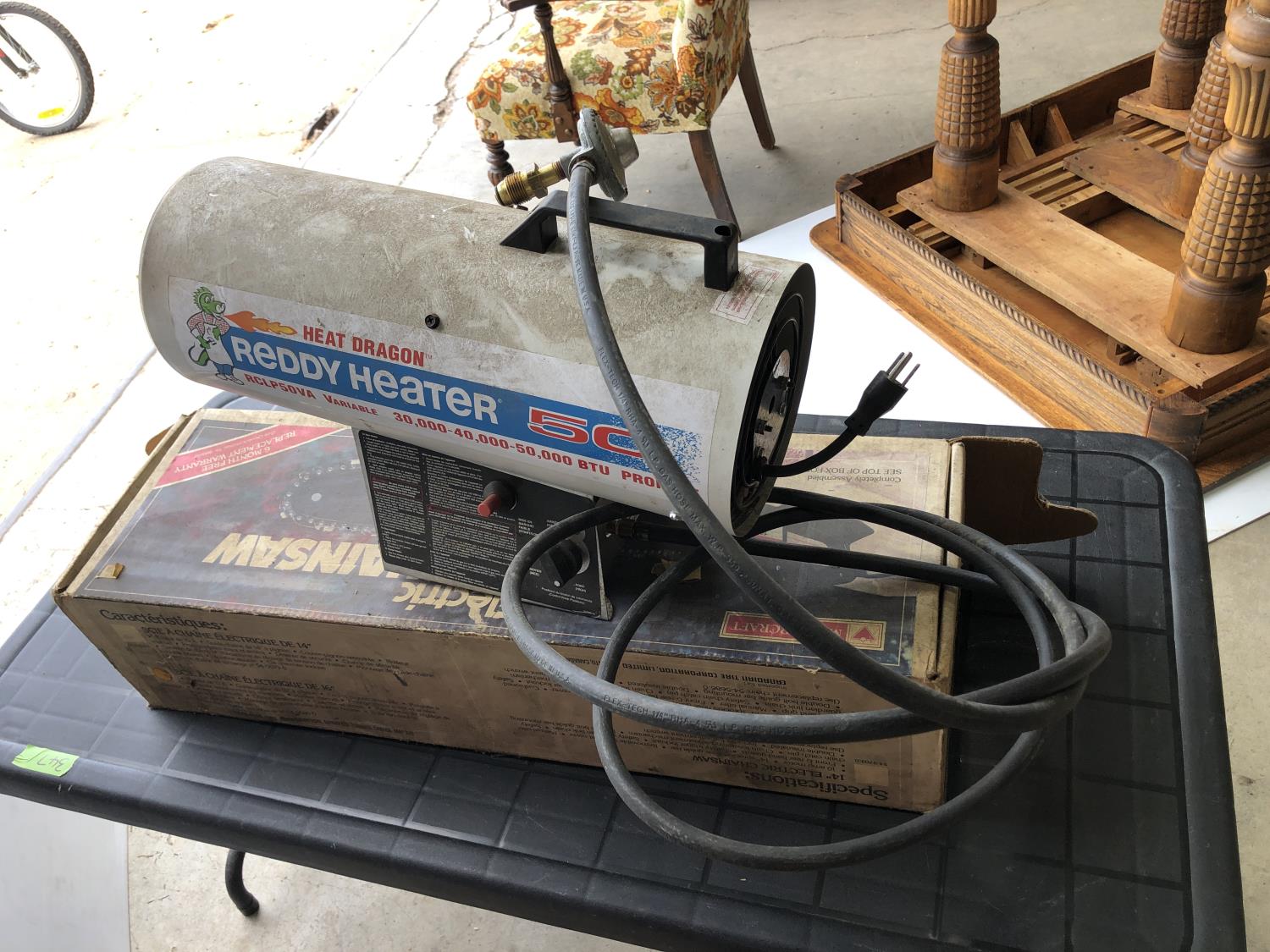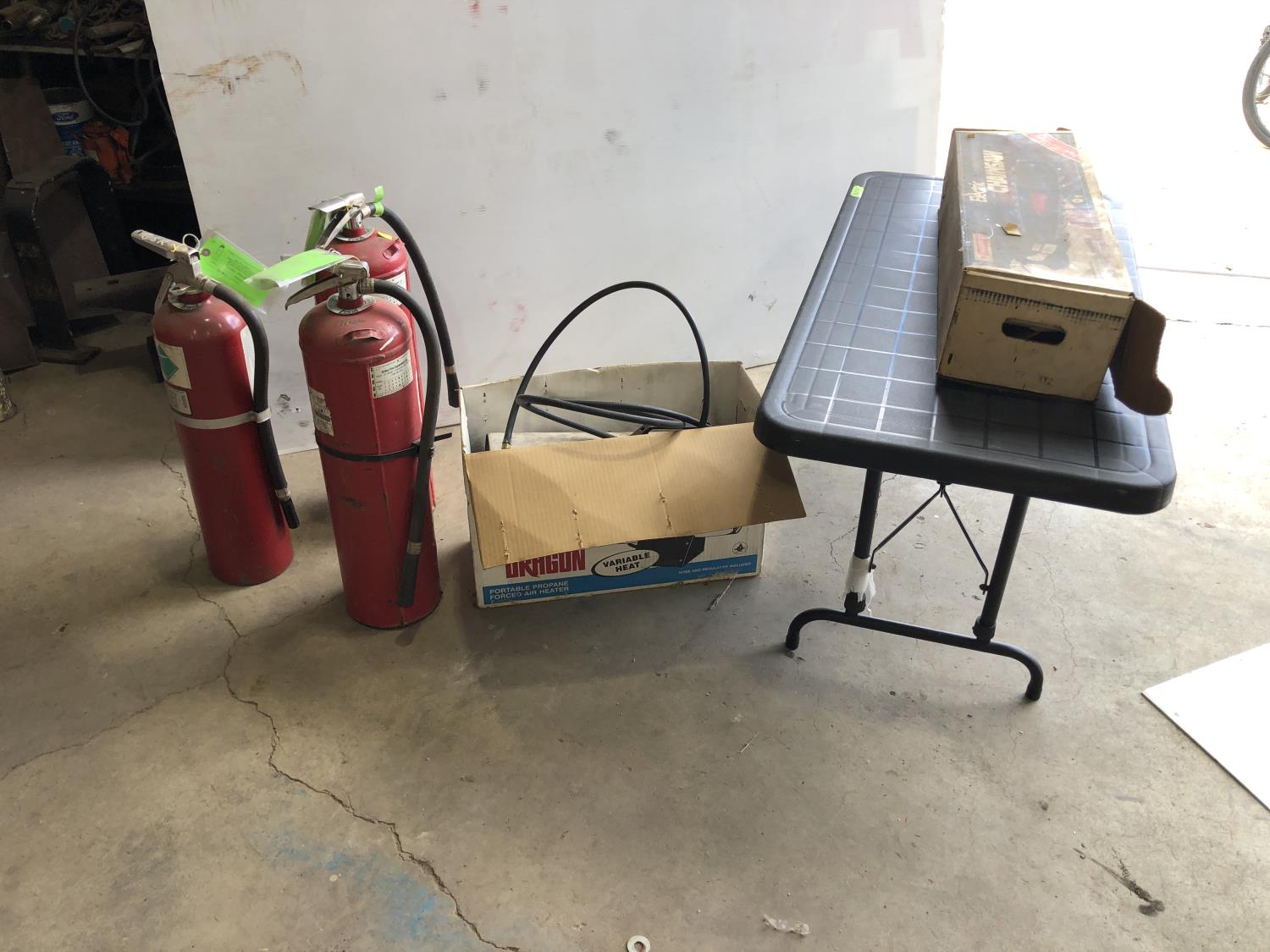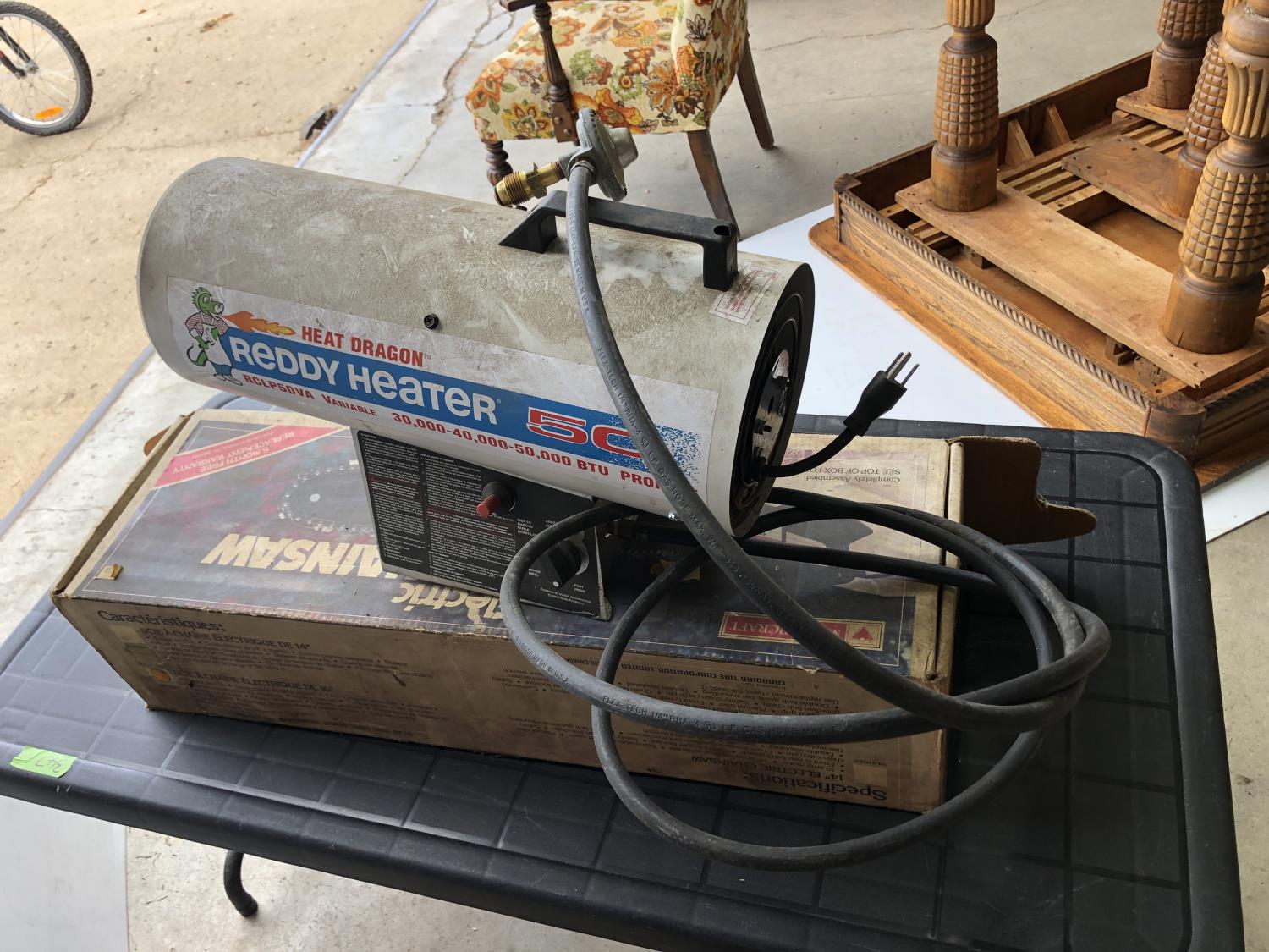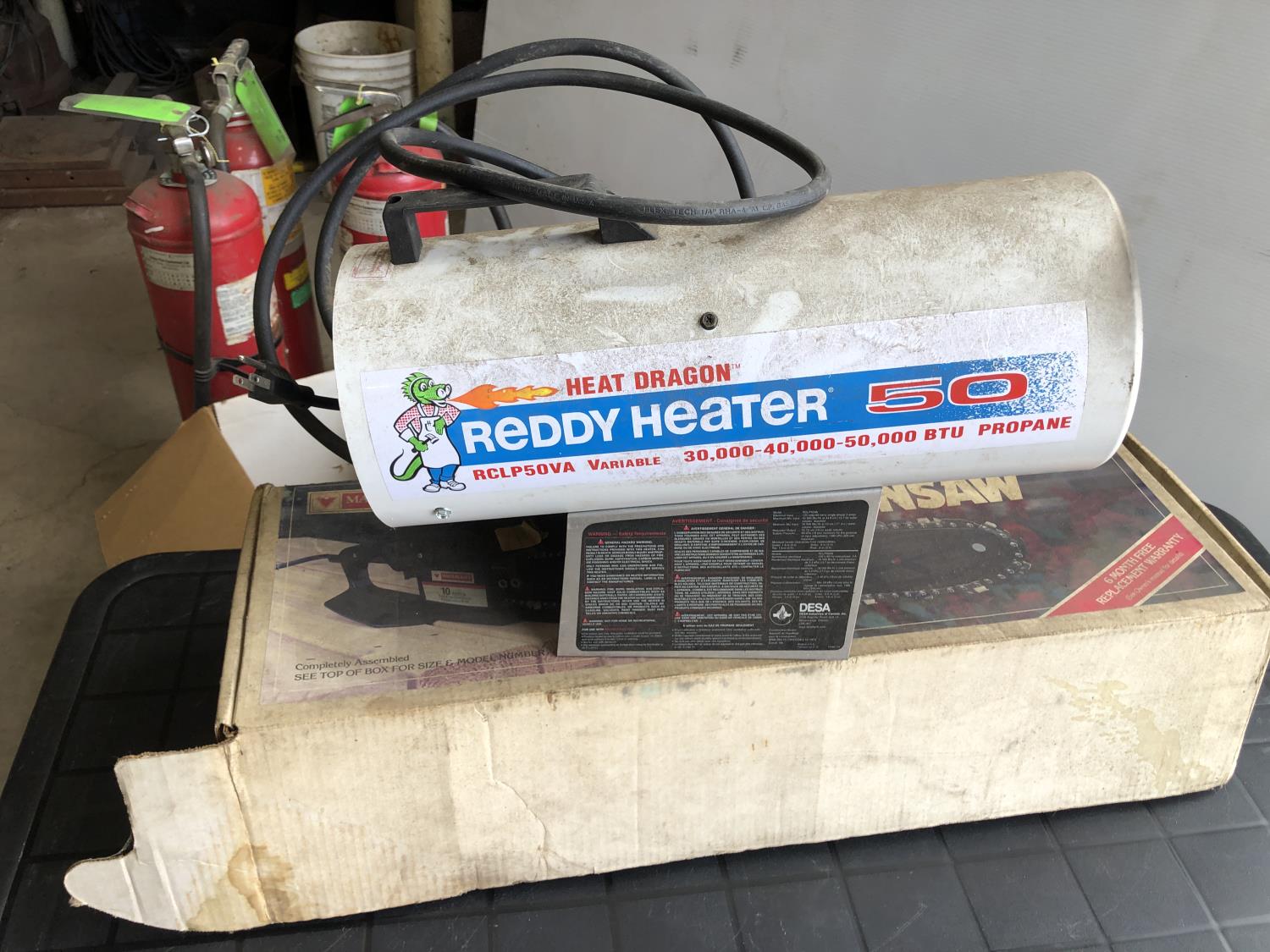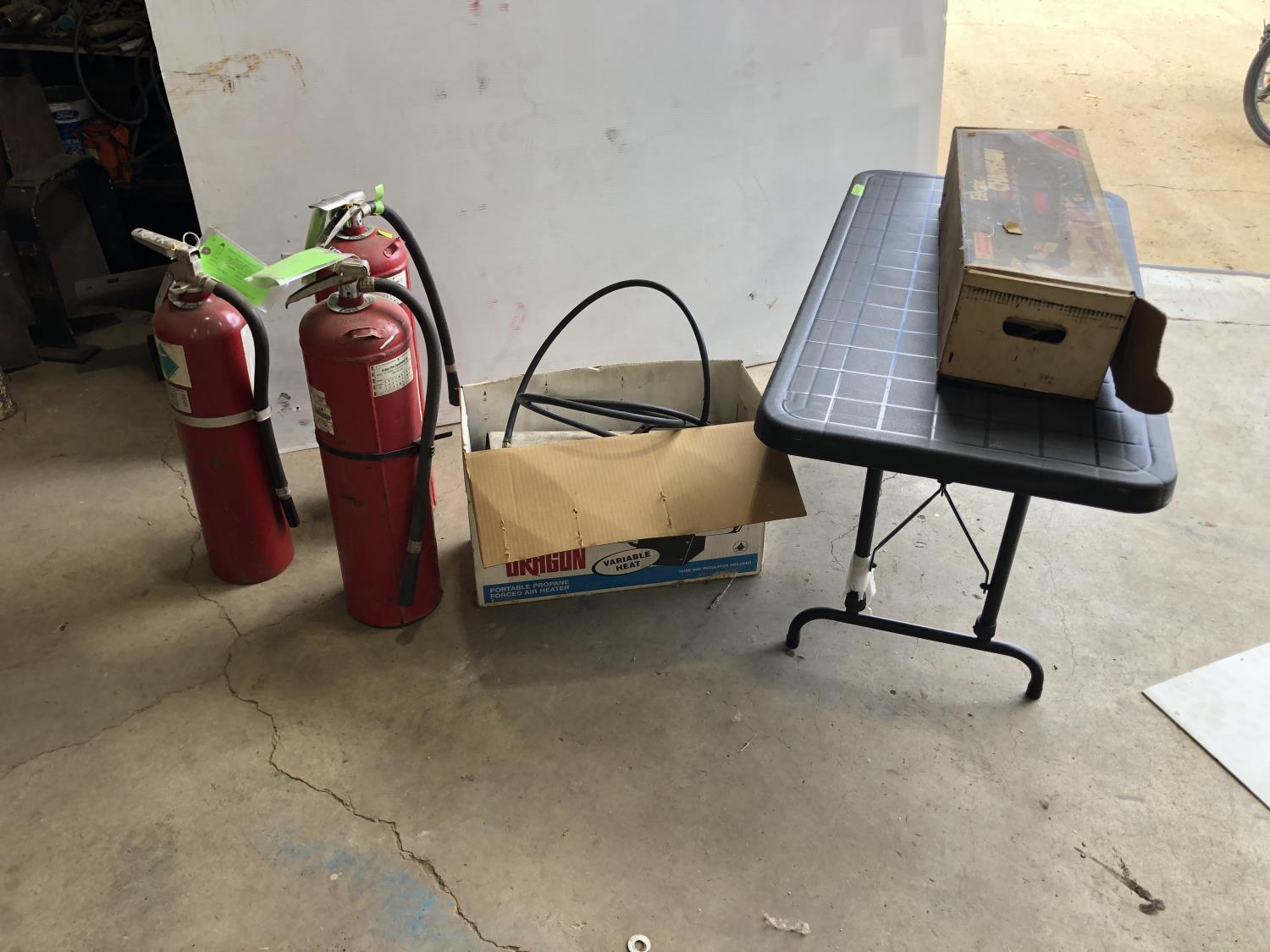 (3) fire extinguishers (full), Mastercraft electric chainsaw 16" bar/chain, 48" x 24" x 21" h folding table, Reddy Heater Heat Dragon shop heater variable 30,000, 40,000 and 50,000 BTU propane
