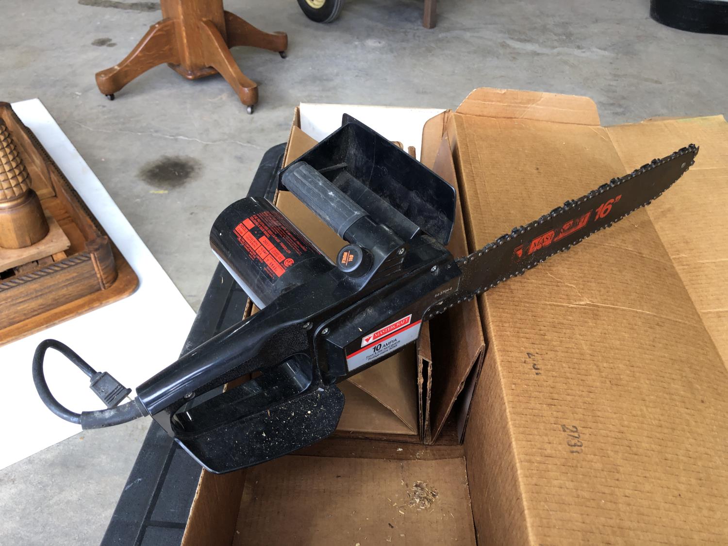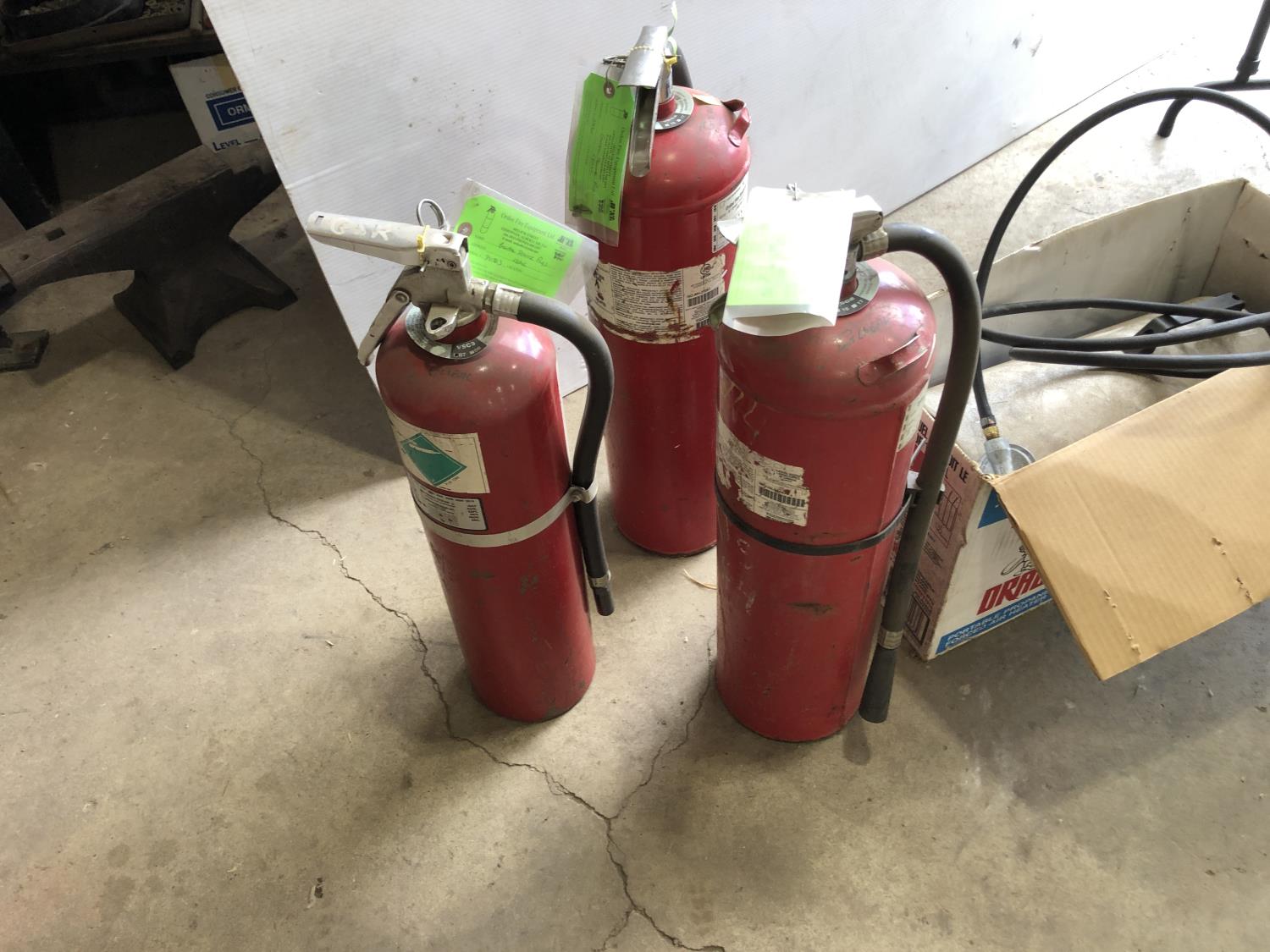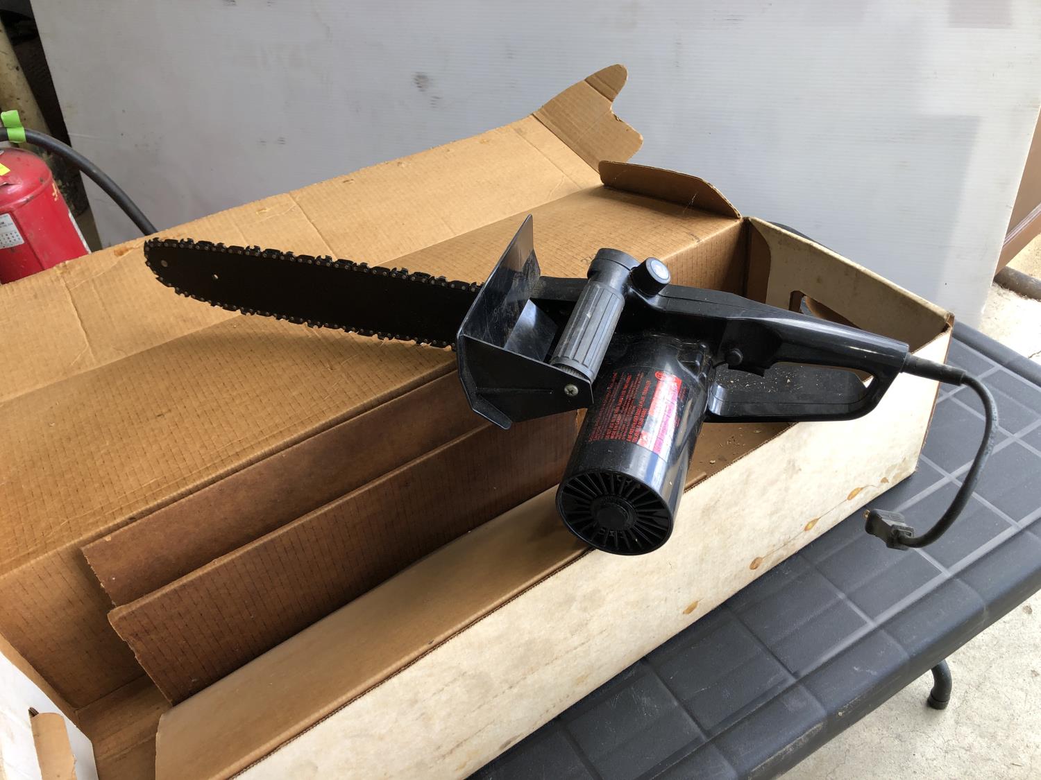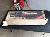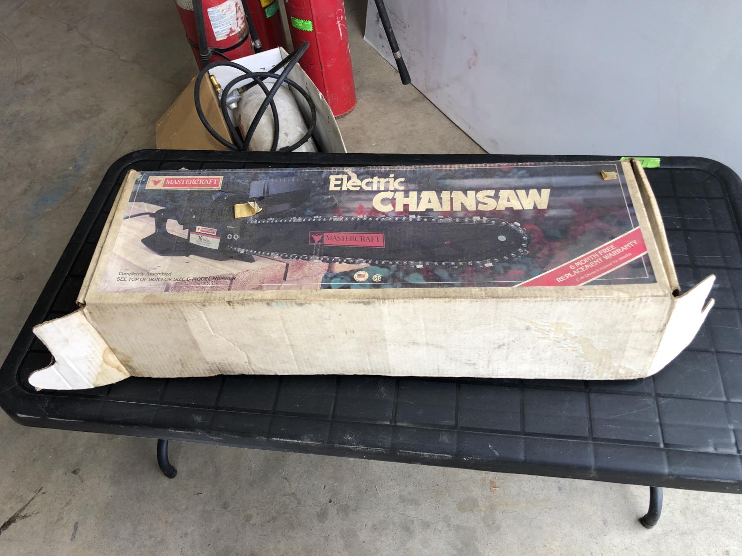 (3) fire extinguishers (full), Mastercraft electric chainsaw 16" bar/chain, 48" x 24" x 21" h folding table, Reddy Heater Heat Dragon shop heater variable 30,000, 40,000 and 50,000 BTU propane