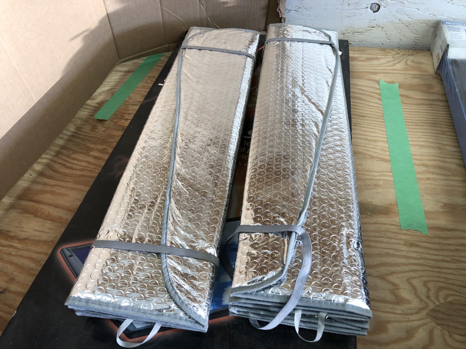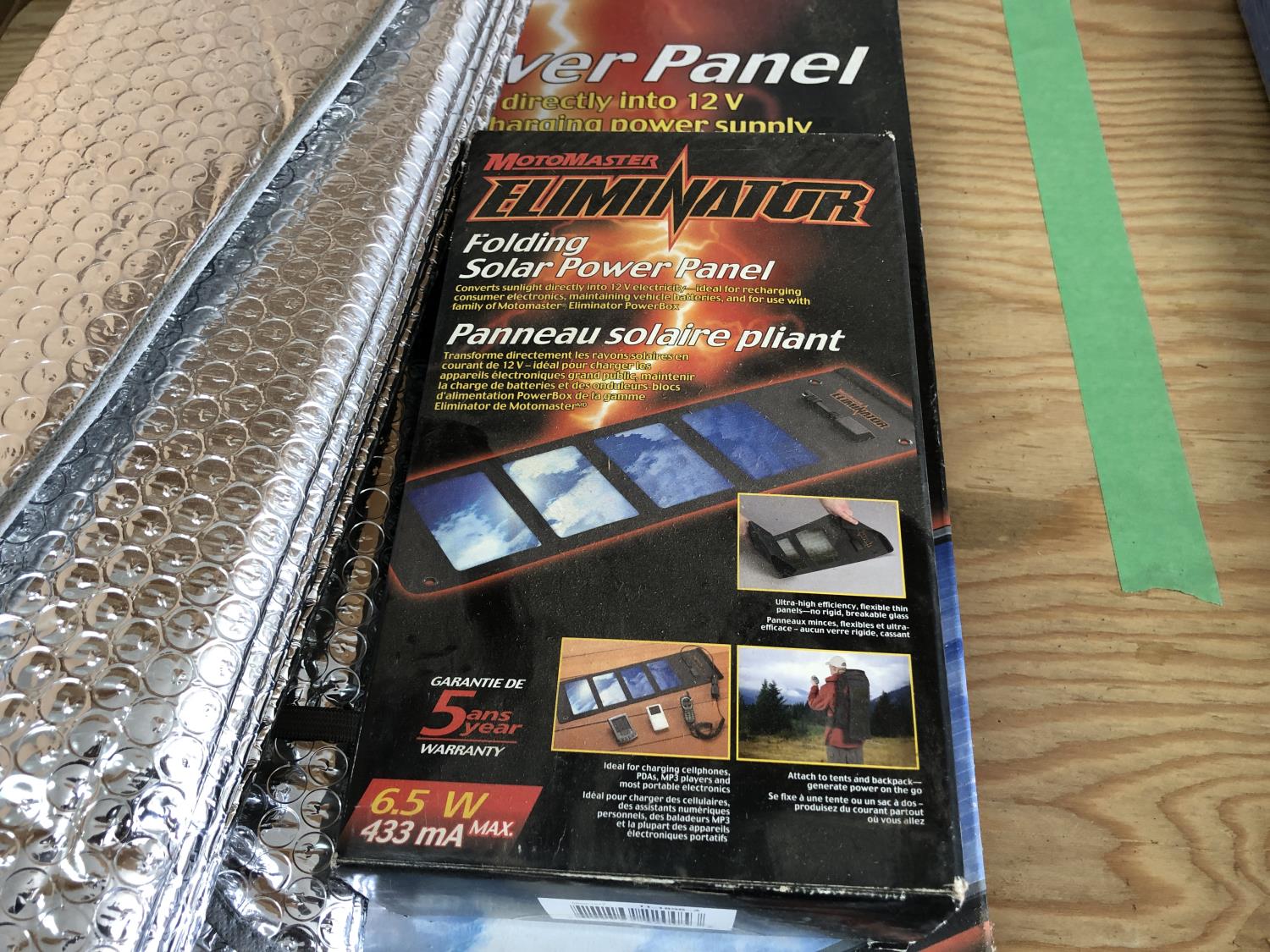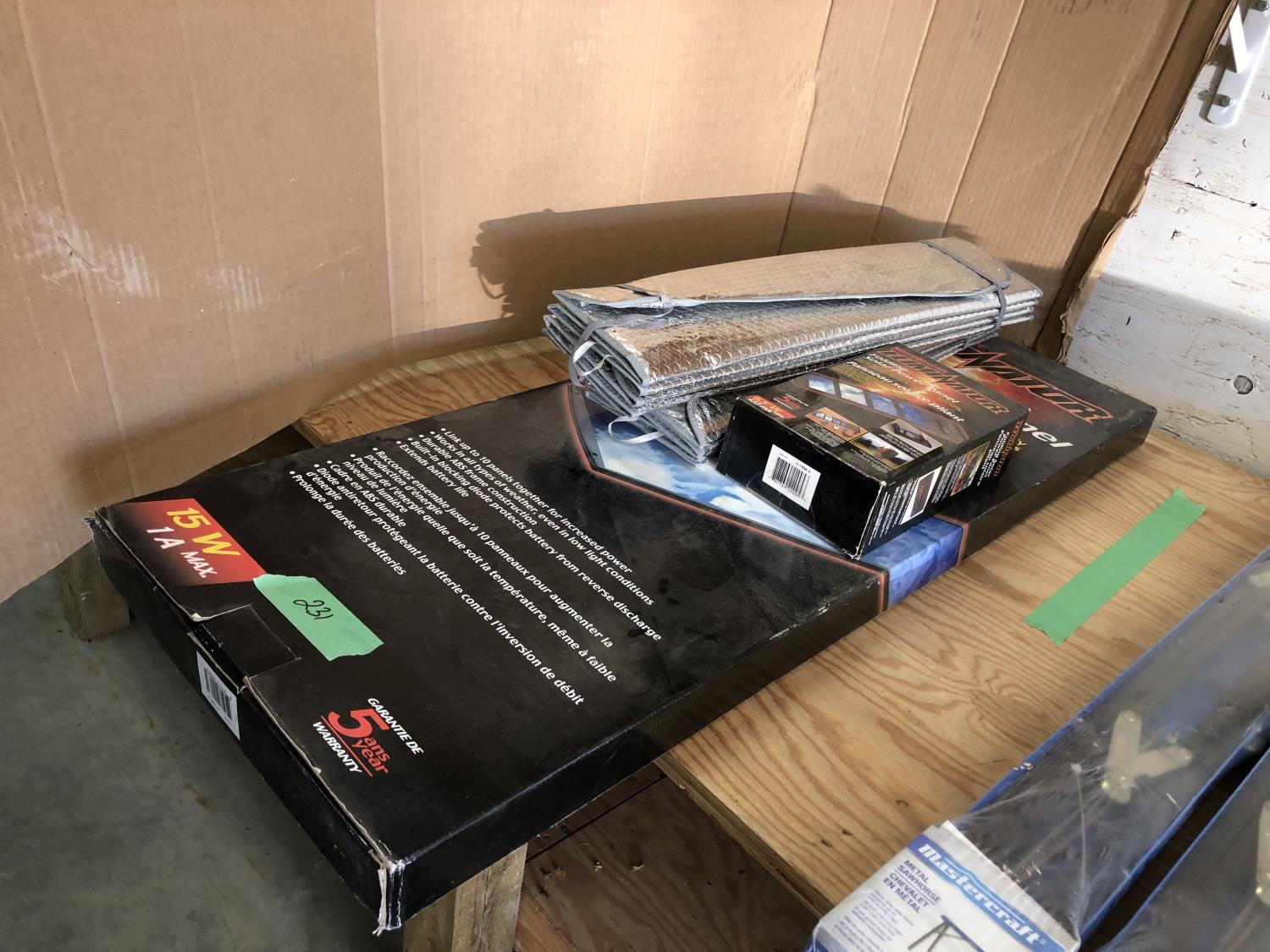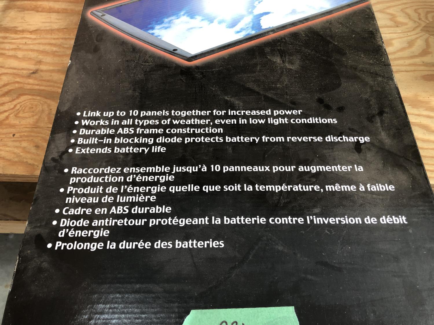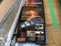 Motomaster Eliminator solar power panel (unused), (2) reflective windscreen sun shields, Motomaster folding solar power panel (unused)