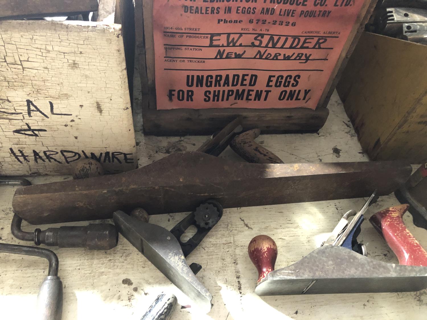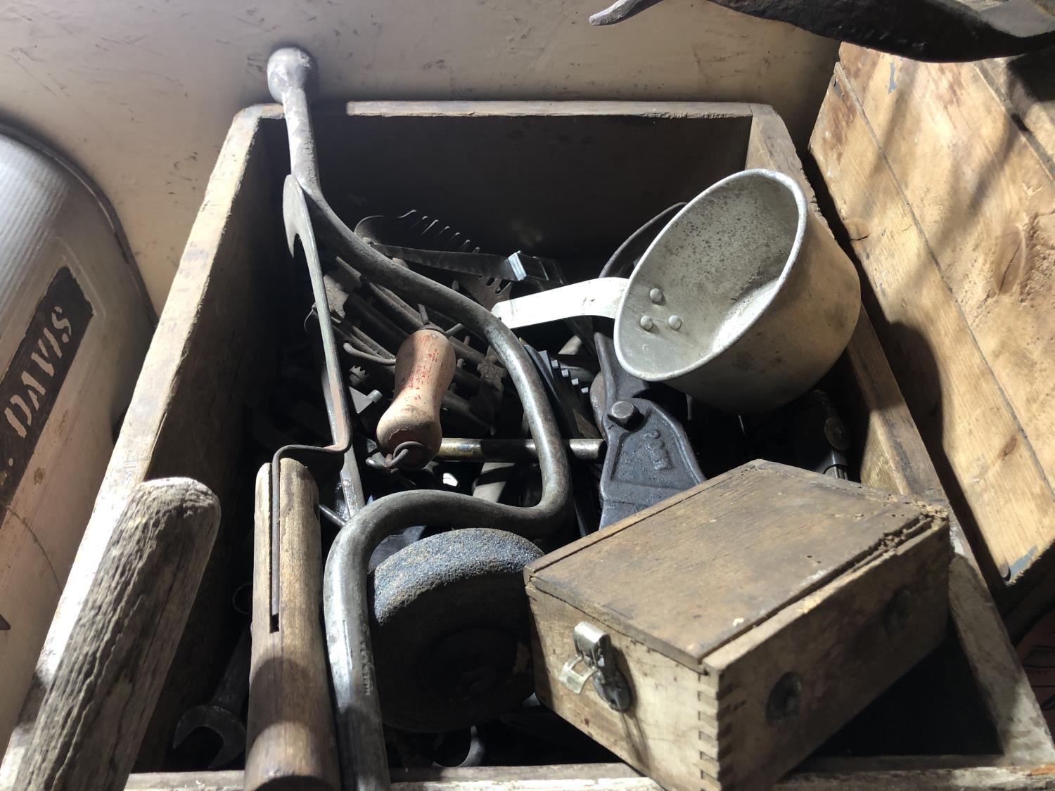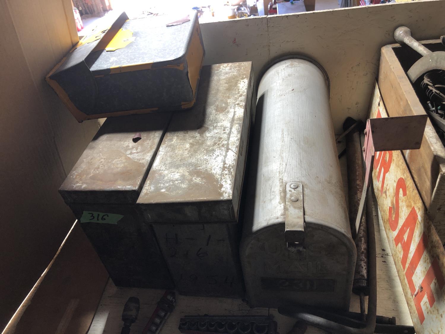 Various vintage tools, vintage egg box, vintage mail box, (3) vintage metal boxes