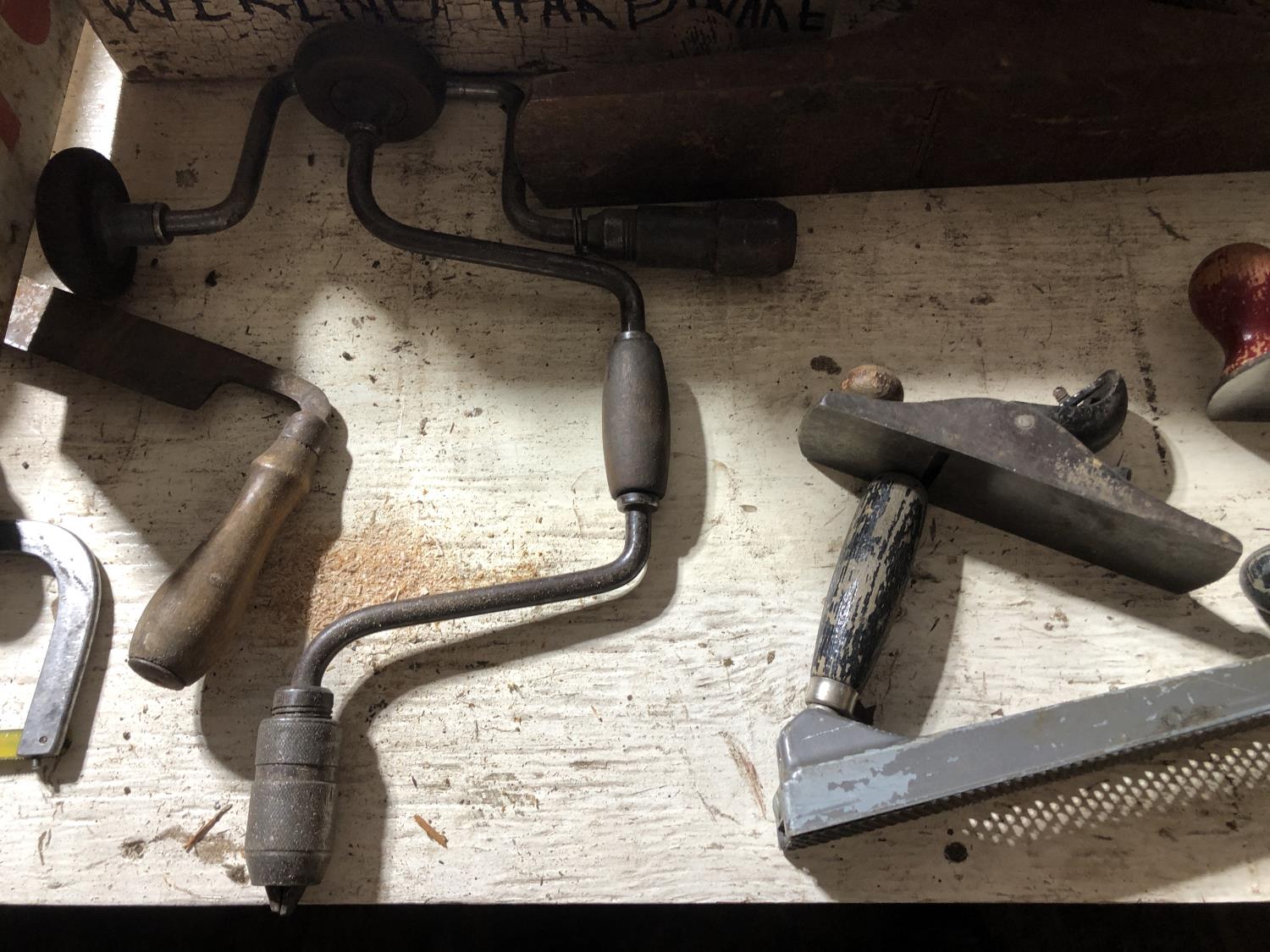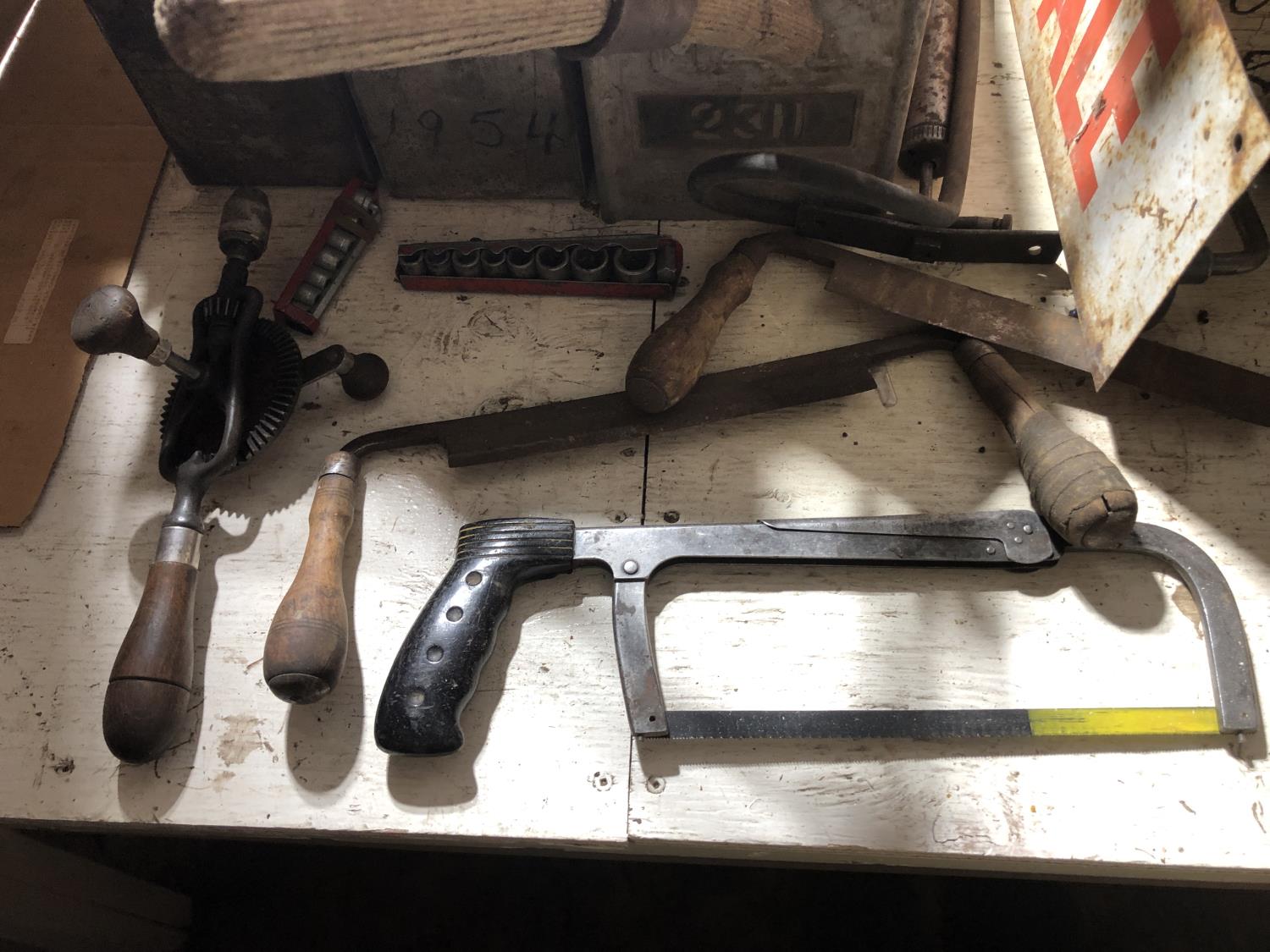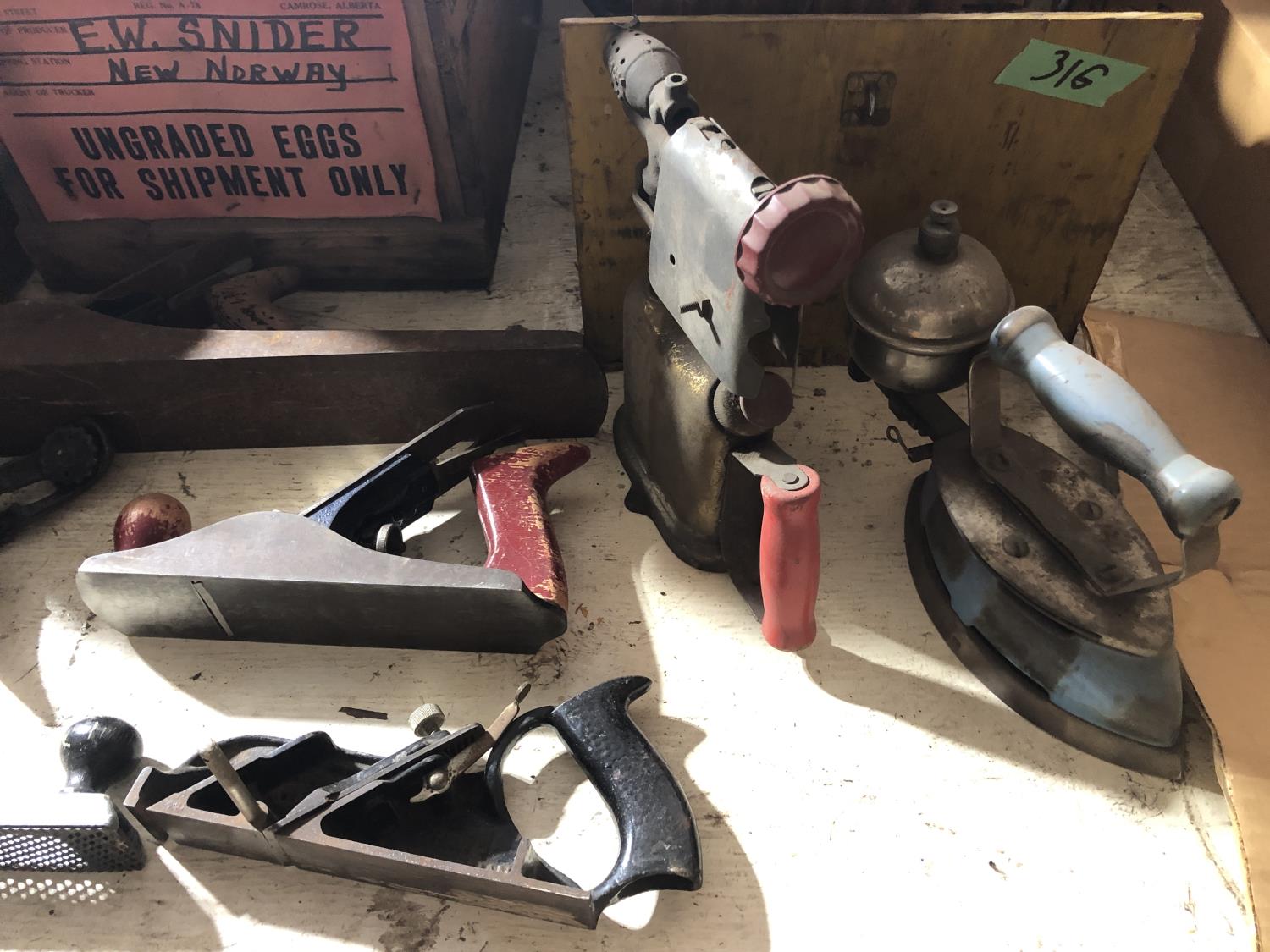 Various vintage tools, vintage egg box, vintage mail box, (3) vintage metal boxes