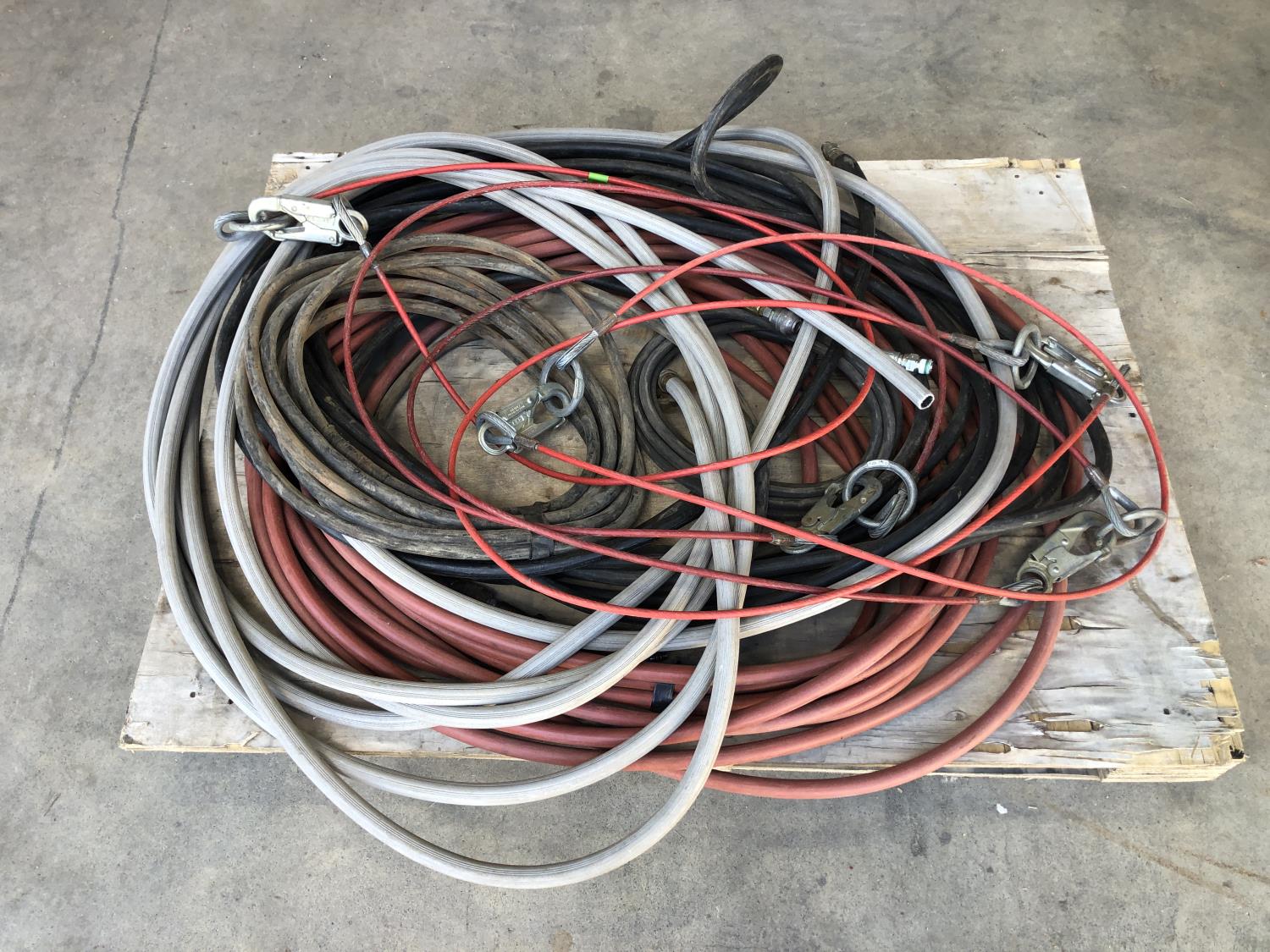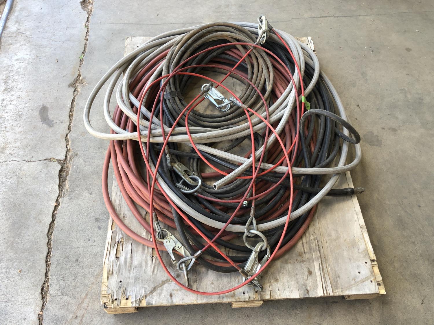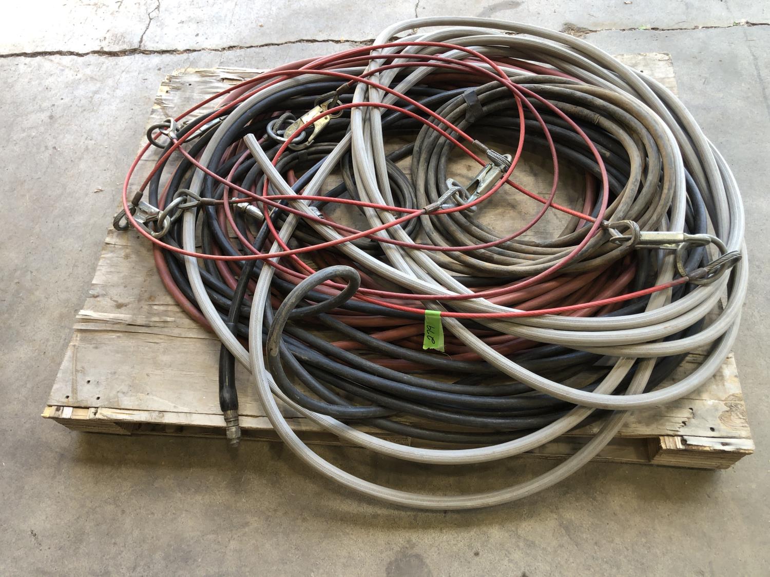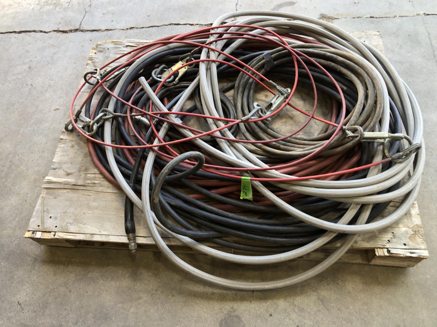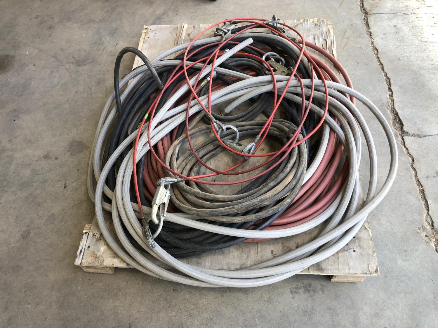 hose pipe, (5) plastic coated wire rope with clasps 6 ft long, quantity of hydraulic hose, quantity of air hose