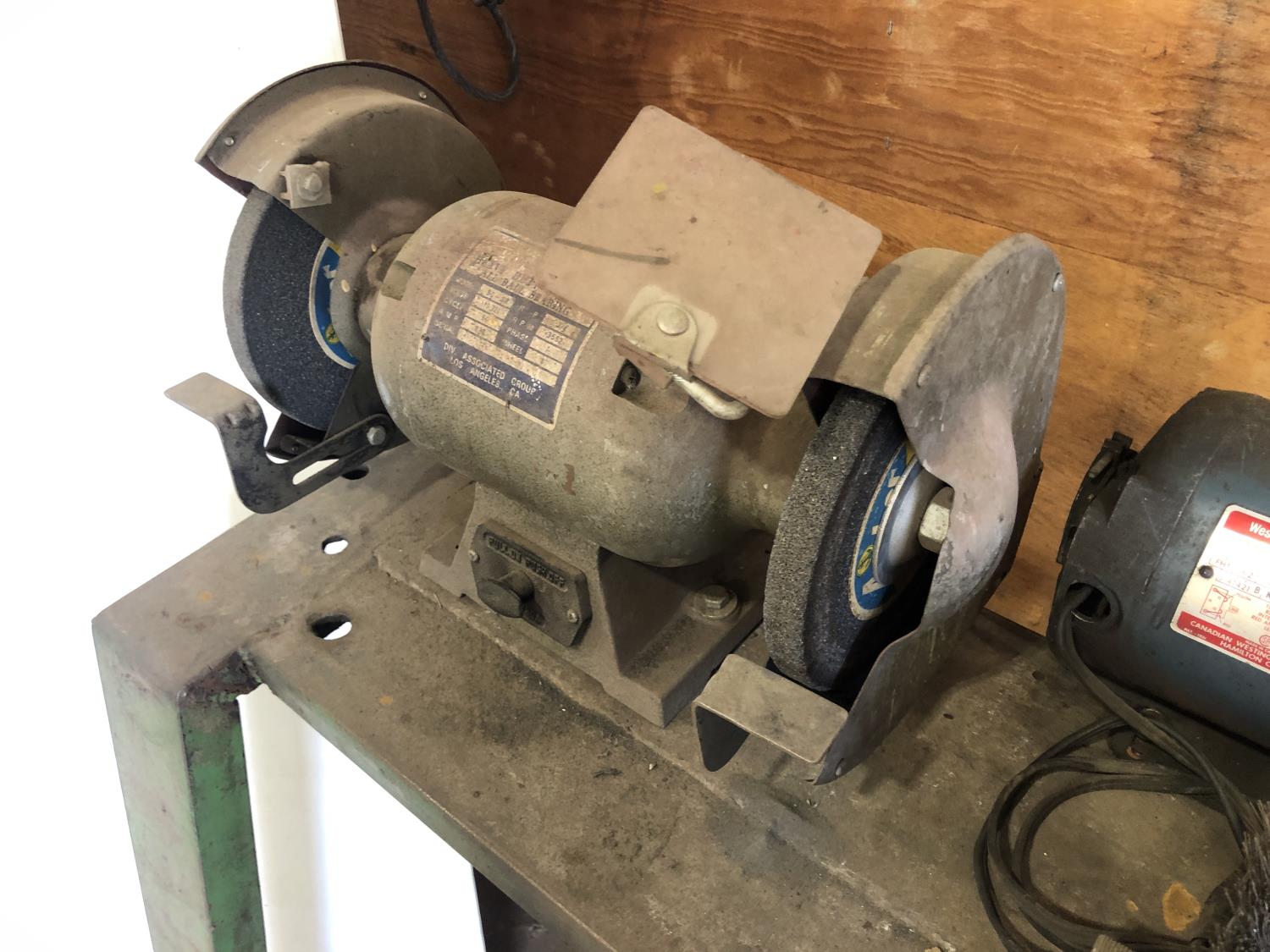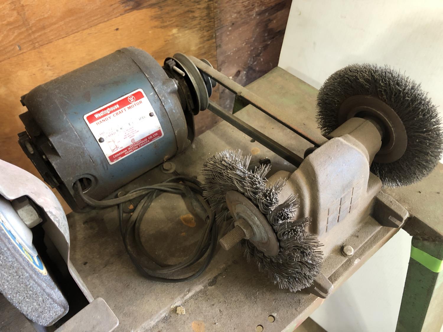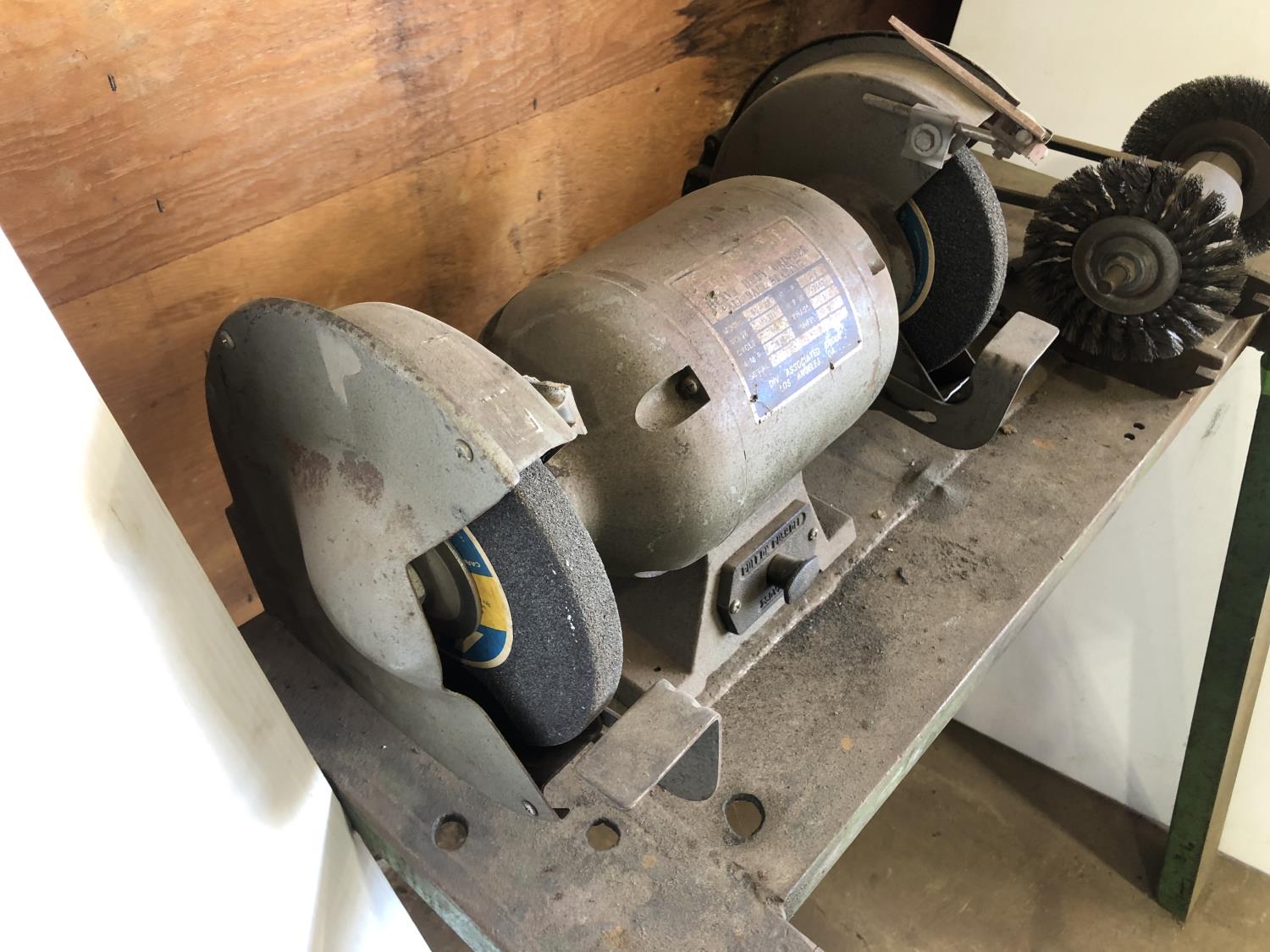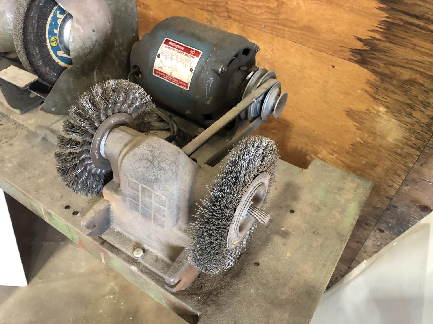 heavy duty bench grinder with 2 discs, bench buffer with 2 wire discs on a shop built stand