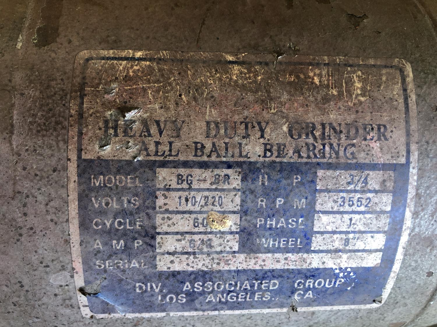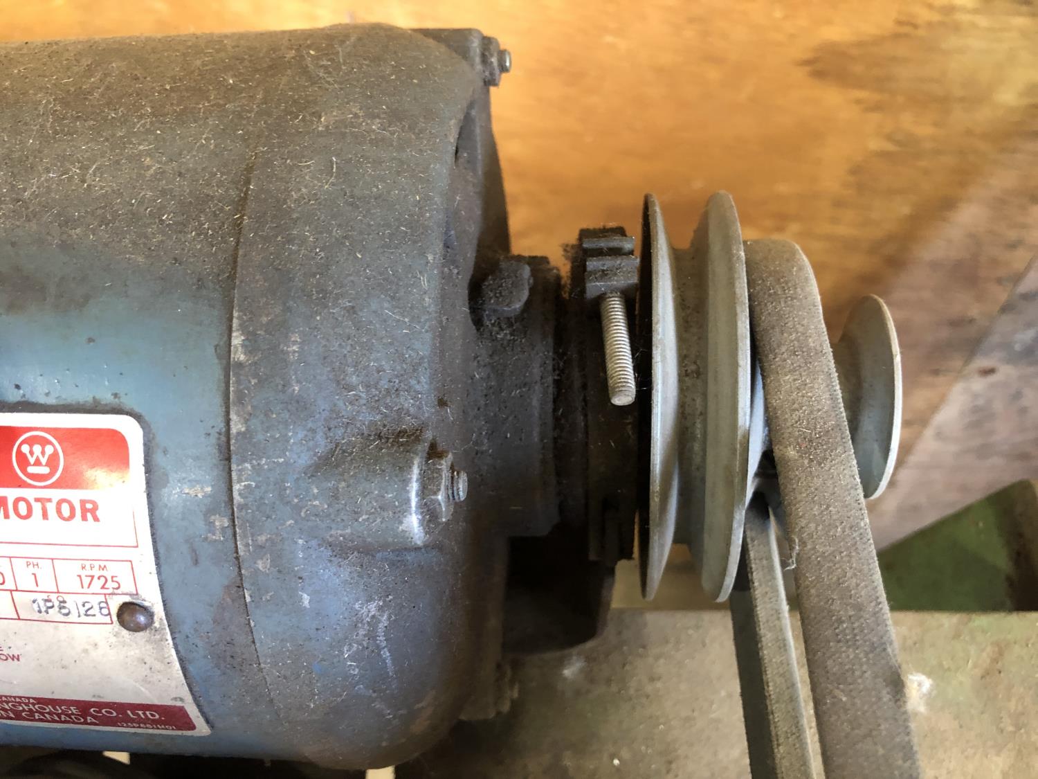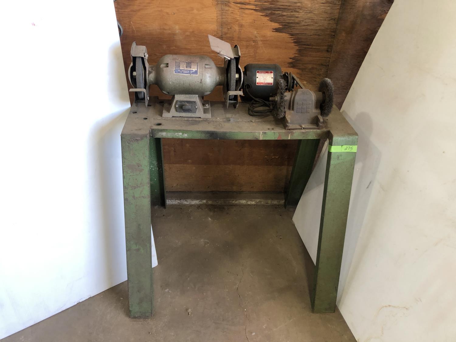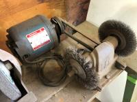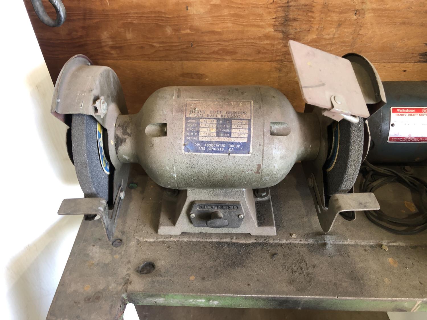 heavy duty bench grinder with 2 discs, bench buffer with 2 wire discs on a shop built stand