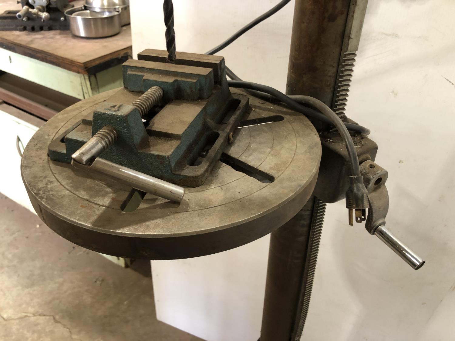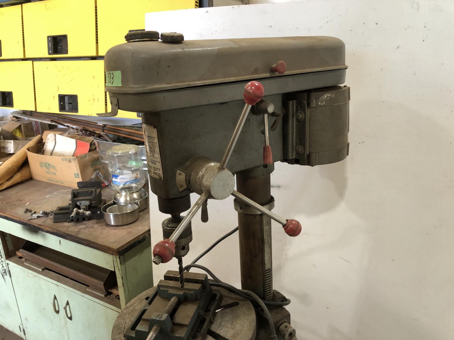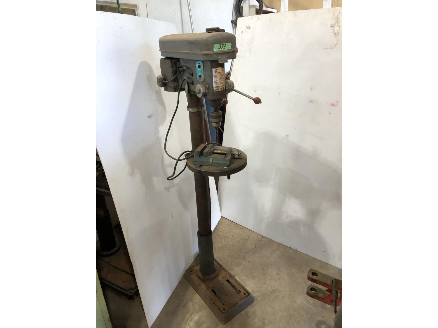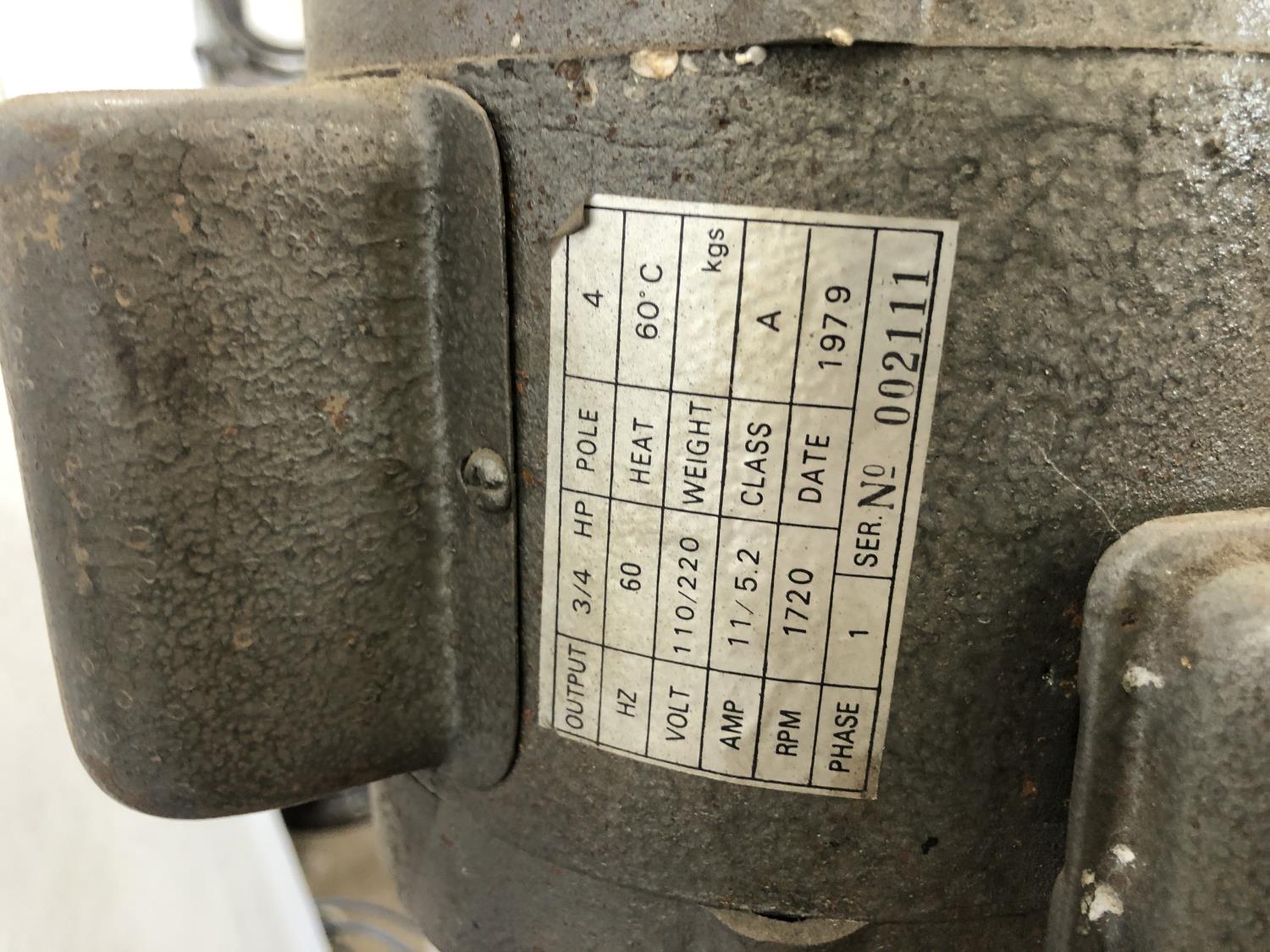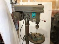3/4 HP, 5/8: chuck, phase 1, mfg date 197, 13 inch w x 18 inch d x 65 inch h, drill press vise