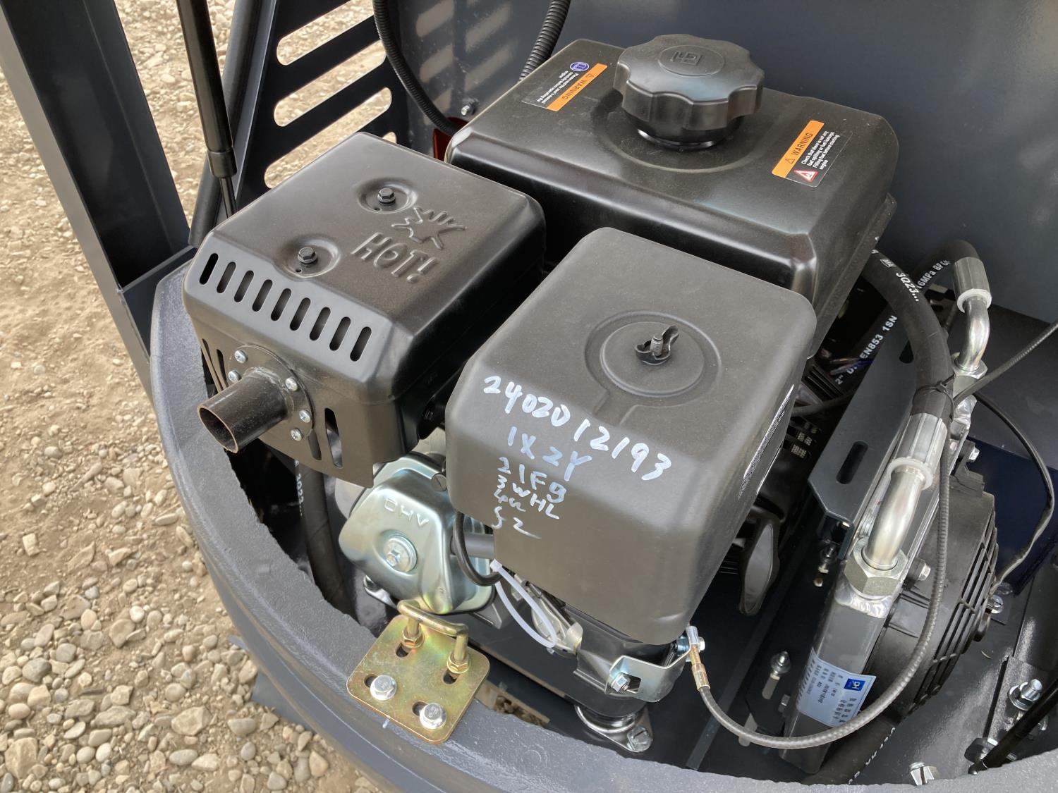 Open station, gas engine, 15 inch dig bucket, manual coupler, manual thumb, 31 inch stick, backfill blade, 7 inch rubber tracks