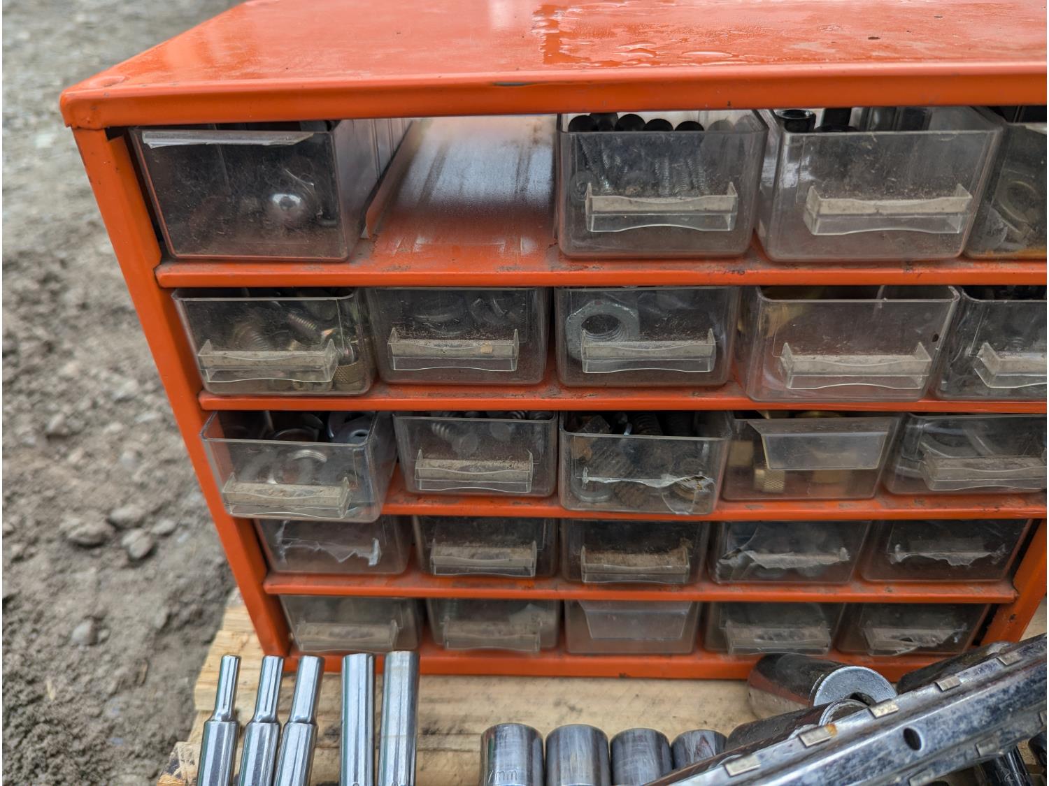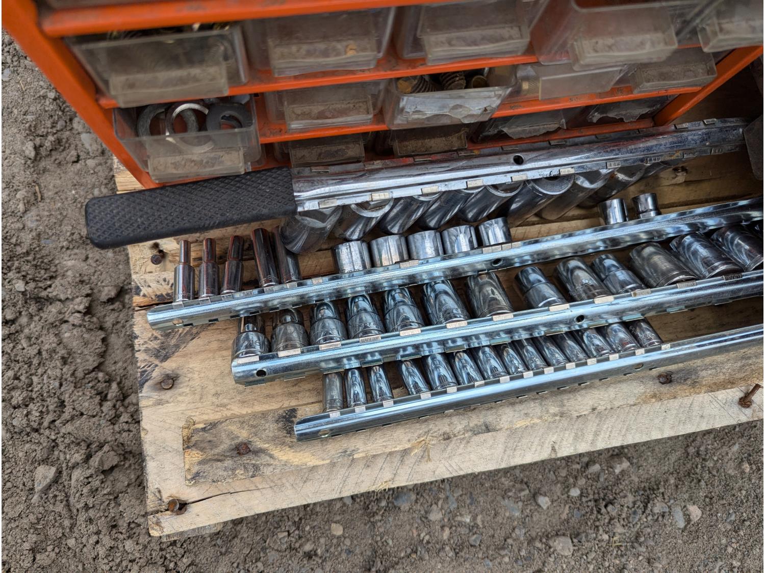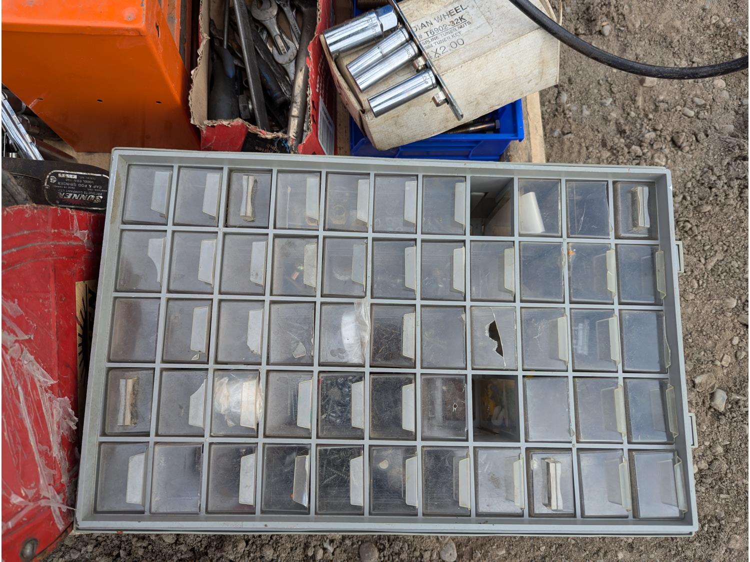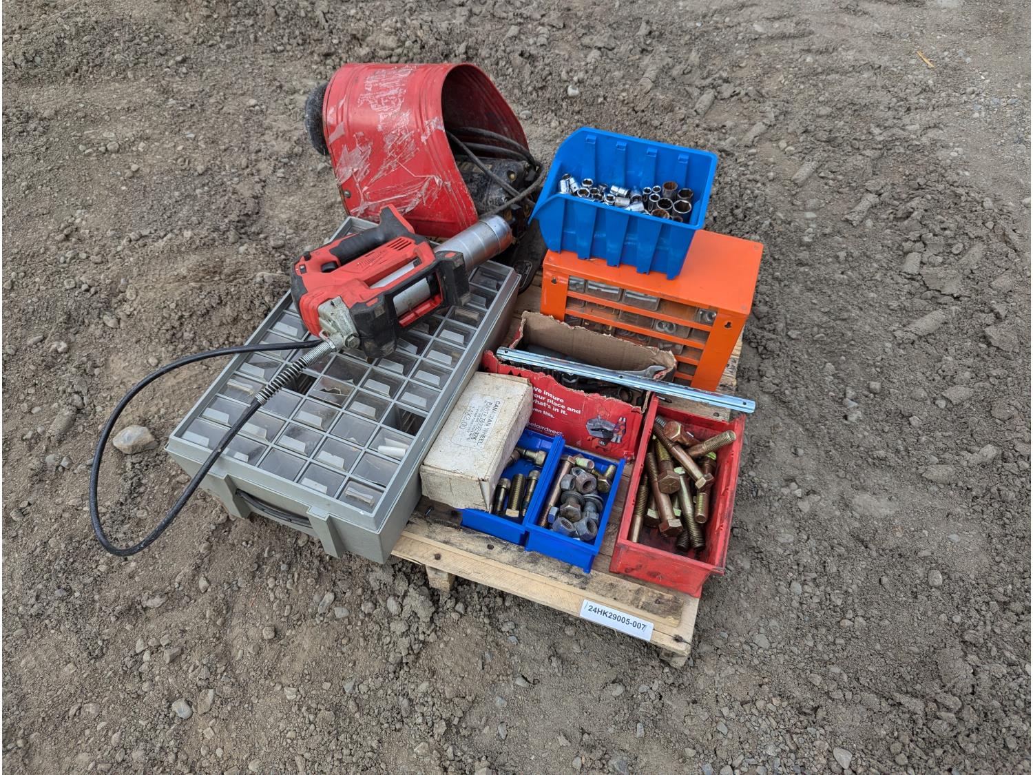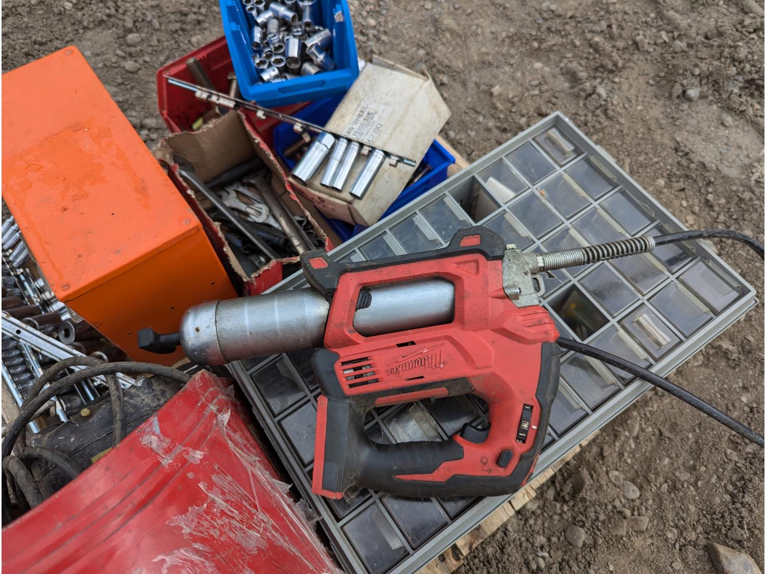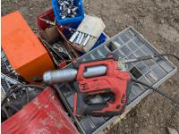 135 Milwaukee Cordless Grease Gun, Grinder, Tools, Parts Bins W/Contents