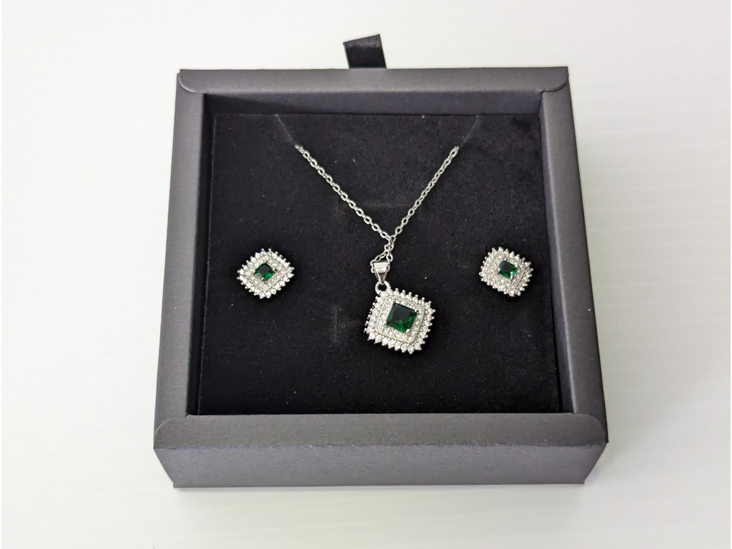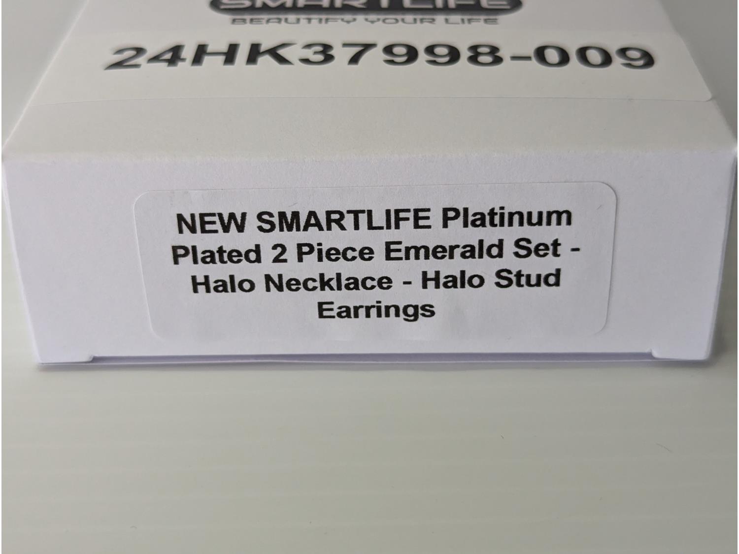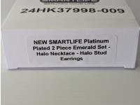 108 Smartlife Platinum Plated Emerald Halo Necklace & Stud Earrings C4 (Unused)