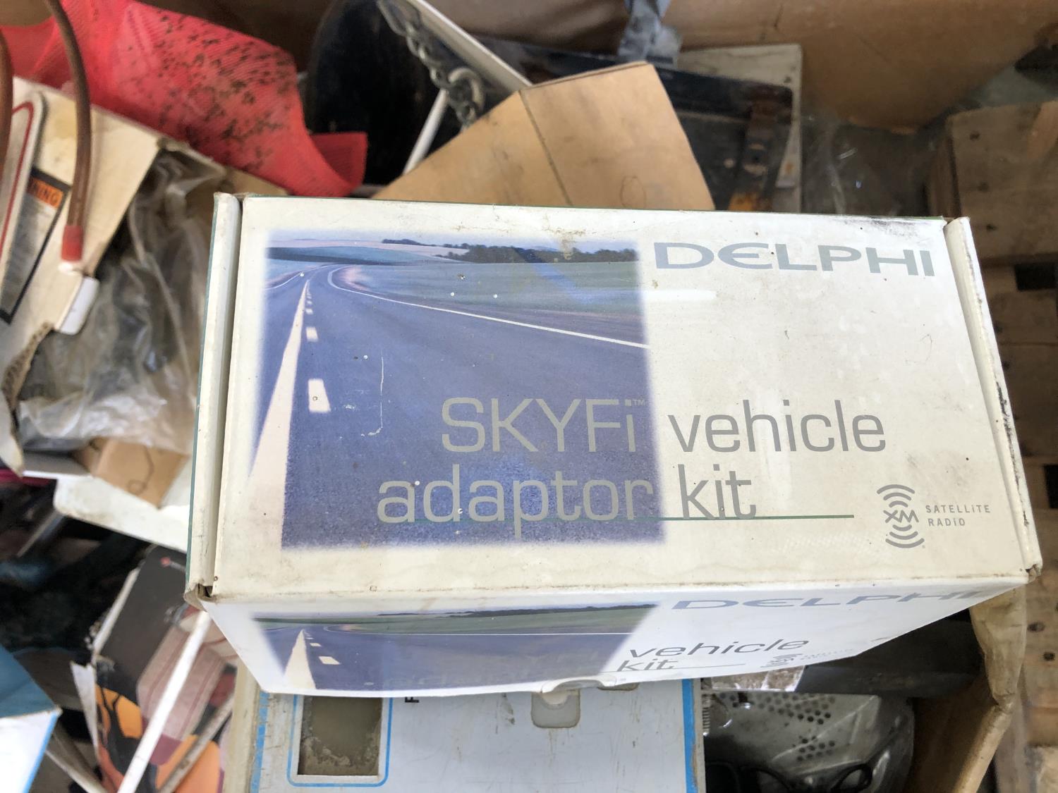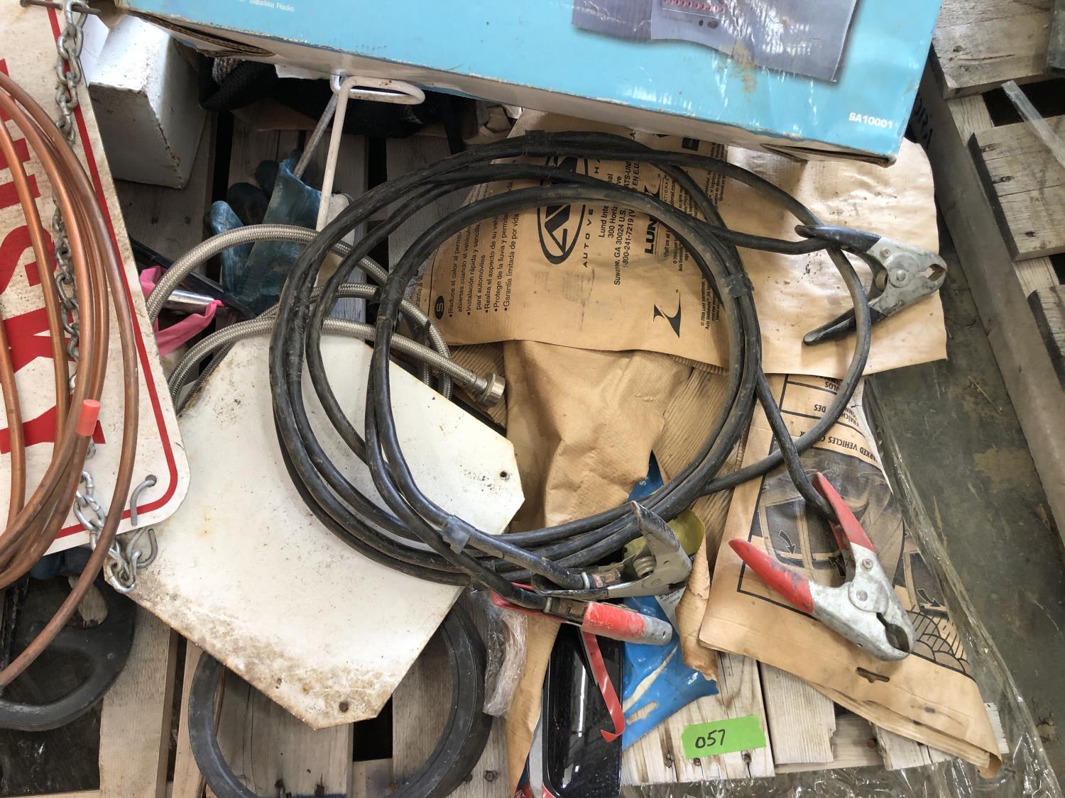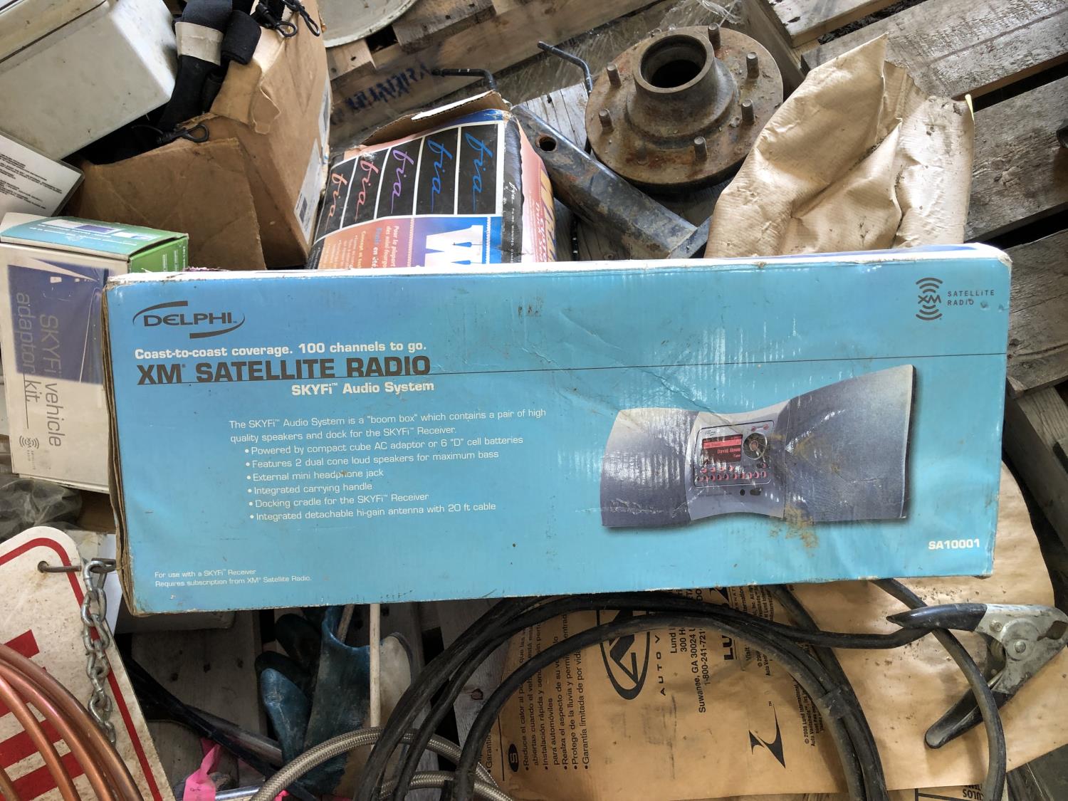 Booster cables, Delphi SKYFi vehicle audio system, Delco XM satellite radio (unused), vehicle conversion kit, 1 inch x 10 ft roller chain (unused), Wrangler seat covers (unused)