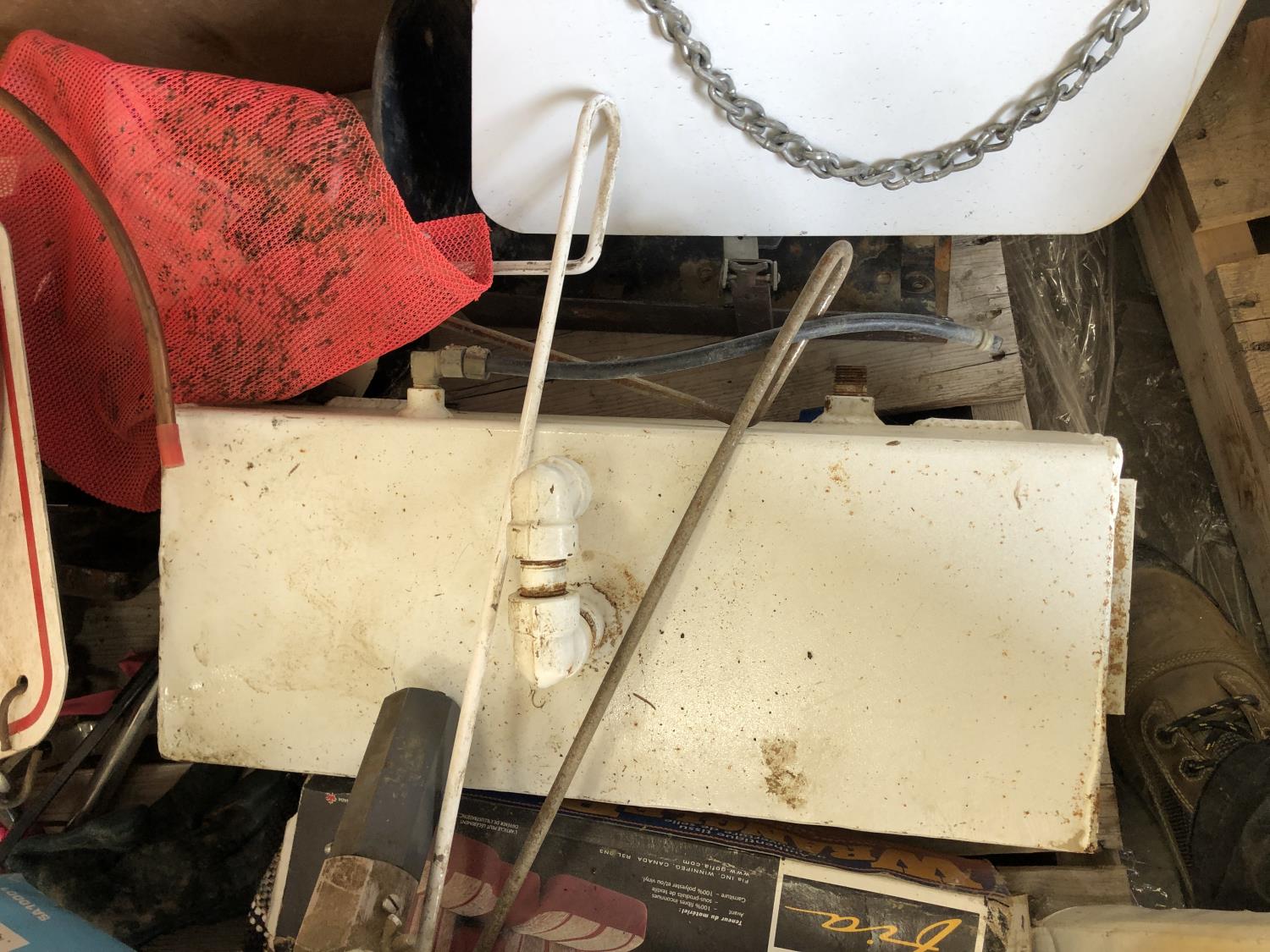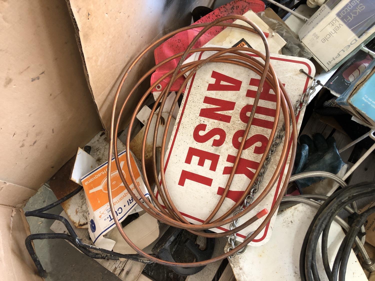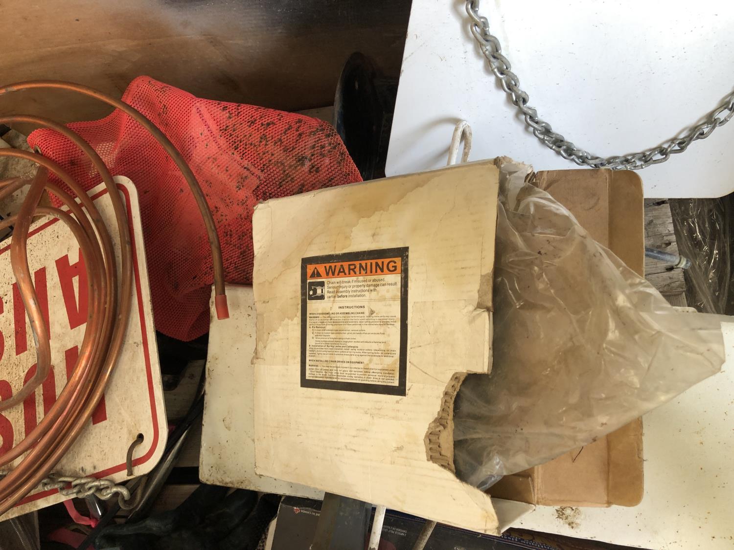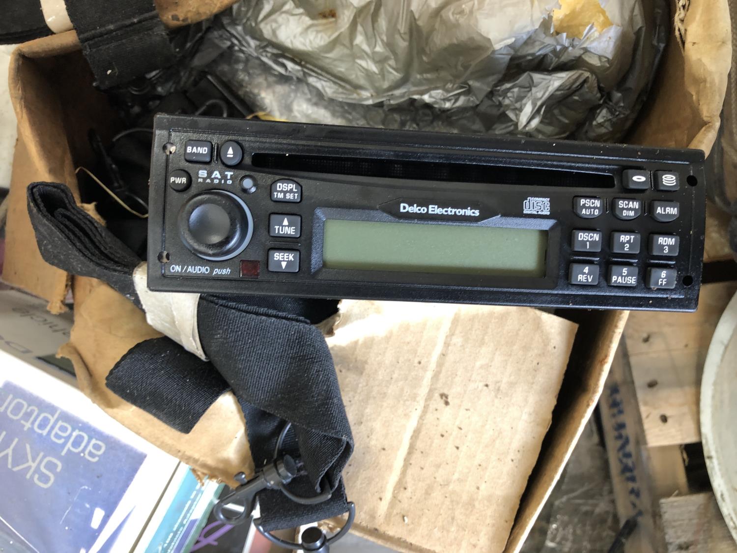 Booster cables, Delphi SKYFi vehicle audio system, Delco XM satellite radio (unused), vehicle conversion kit, 1 inch x 10 ft roller chain (unused), Wrangler seat covers (unused)