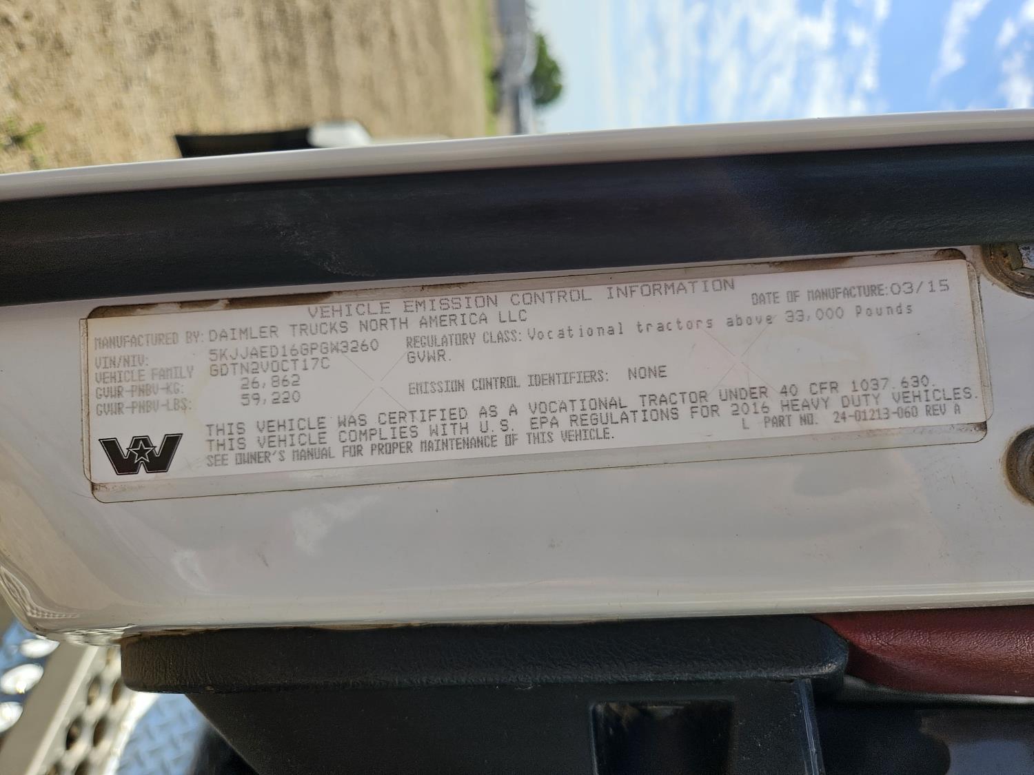 Detroit DD16 15.6 L 6 cylinder 560 HP engine, DEF deleted, Webasto engine heater, engine brake, engine block heater, emissions deleted, Eaton Fuller 18 speed manual transmission, cab heater, mid rise 48 inch sleeper, A/C, cruise control, leather interior, air ride seats, 2-way radio, air ride cab, air ride suspension, 13,200 lb front axle, 46,000 lb rear axles, full lockers, 3.91 ratio, 244 inch WB, single frame, all aluminum wheels, 11R24.5 tires