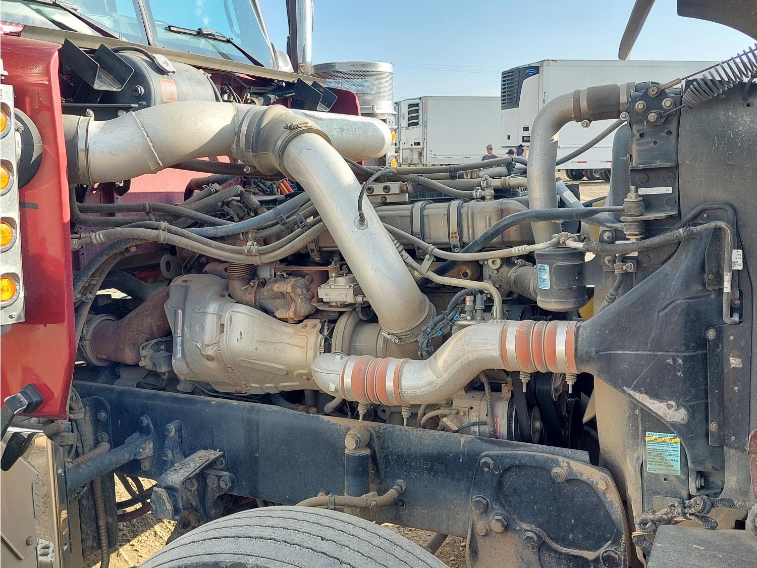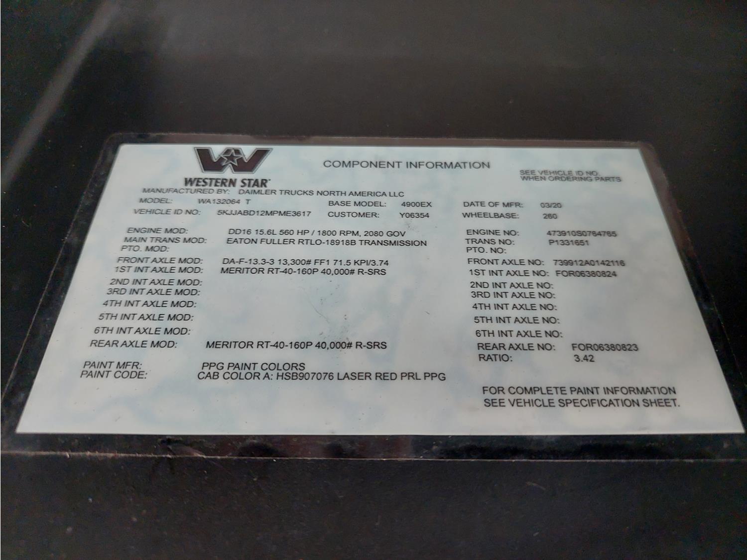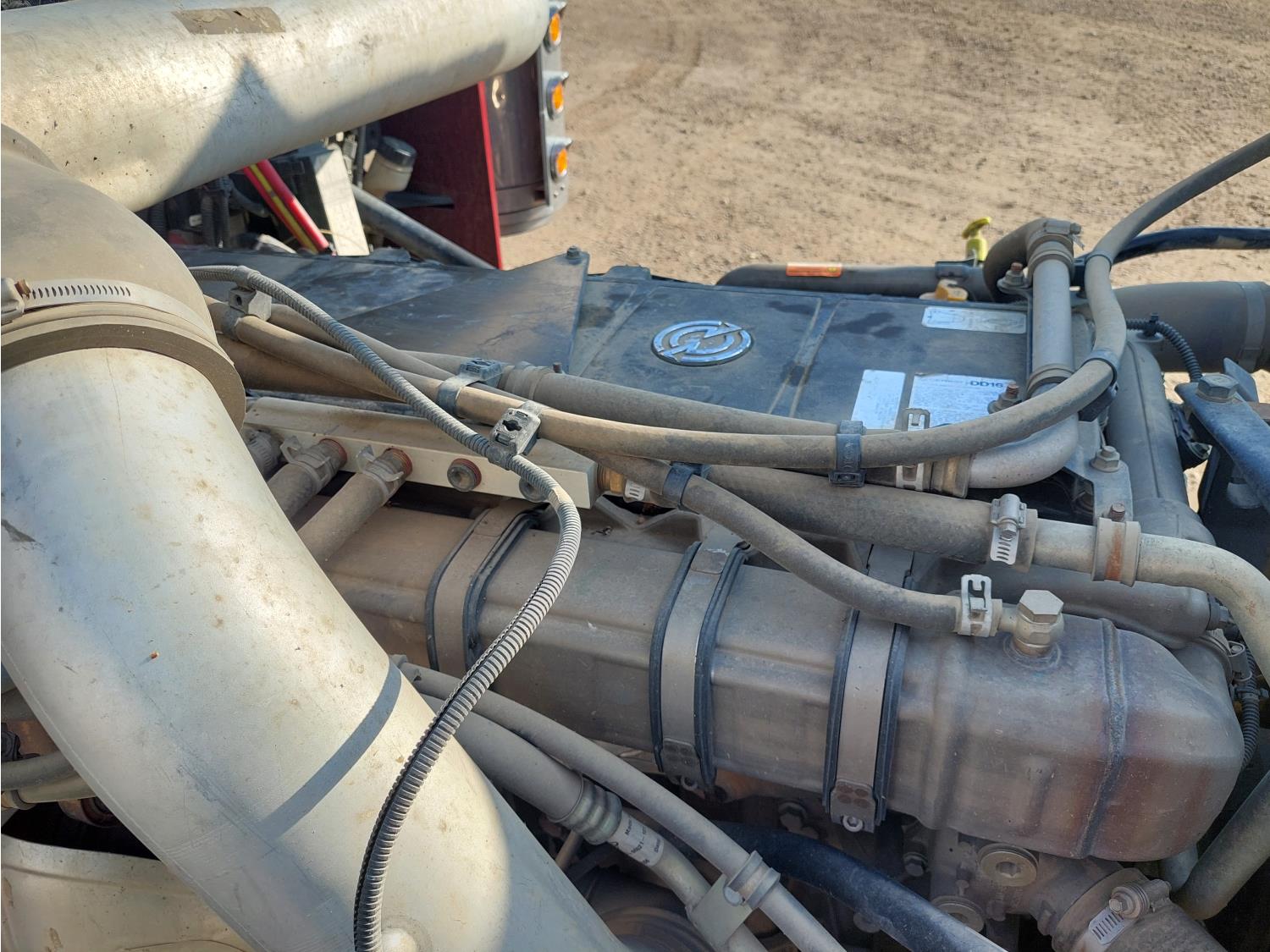 Detroit DD16 15.6 L 6 cylinder 560 HP engine, DEF required, engine heater, engine brake, engine block heater, Eaton Fuller 18 speed manual transmission, cab heater, mid rise 72 inch sleeper, fridge, A/C, cruise control, leather interior, air ride seats, 2-way radio, air ride cab, Air Liner air ride suspension, 13,200 lb front axle, 40,000 lb rear axles, full lockers, 3.42 ratio, 260 inch WB, single frame, all aluminum wheels, 11R22.5 tires