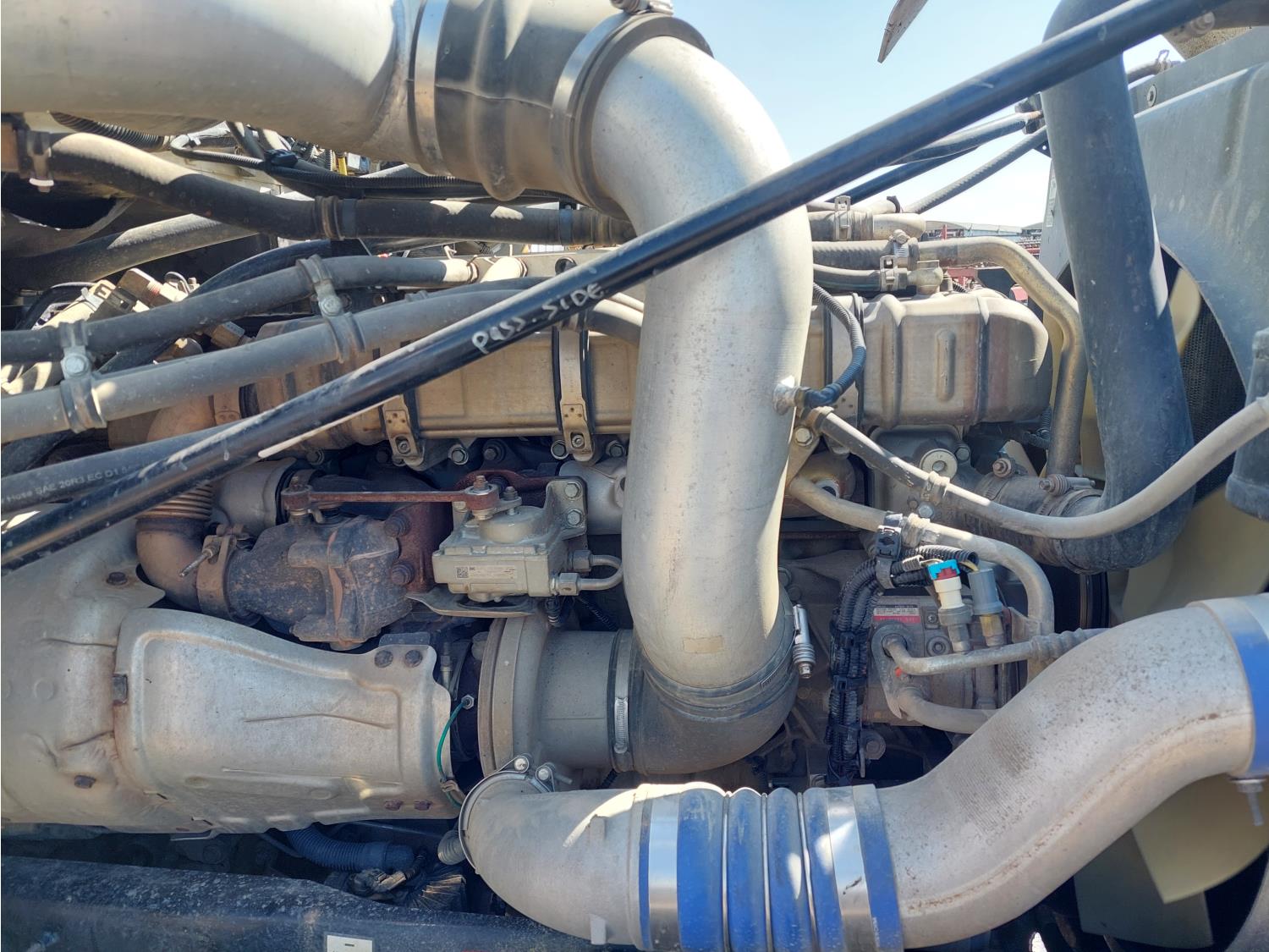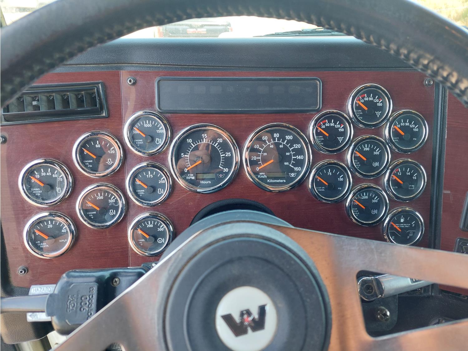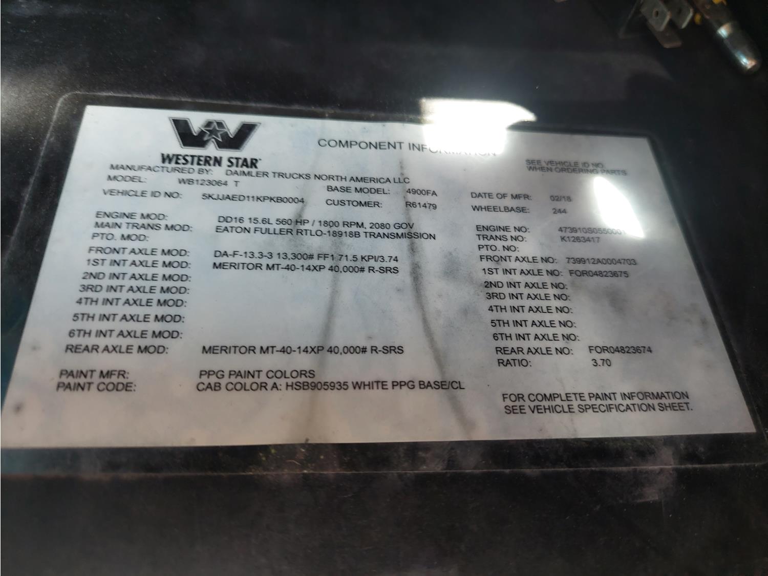 Detroit DD16 15.6 L 6 cylinder 560 HP engine, DEF deleted, engine heater, engine brake, emissions deleted, Eaton Fuller 18 speed manual transmission, mid rise 60 inch sleeper, fridge, A/C, cruise control, leather interior, air ride seats, 2-way radio, air ride cab, power inverter, Air Liner air ride suspension, 13,200 lb front axle, 40,000 lb rear axles, full lockers, 3.70 ratio, 244 inch WB, single frame, all aluminum wheels, 11R24.5 tires