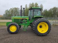 John Deere 6.6 L 6 cylinder engine, 150 PTO HP, 8 speed power shift transmission, hydraulic assist front wheel drive, cab, A/C, radio, 1000 PTO, Q/A 3 point hitch, 3 rear hydraulic outlets, 14.69-24 front tires, 18.4-38 rear tires, factory duals, front weight box