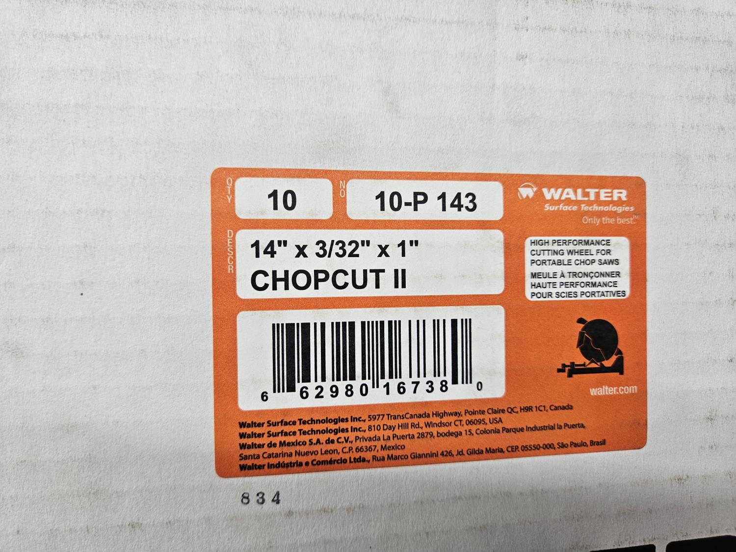 540 (10) Walter 10-P143 14 Inch X 3/32 Inch X 1 Inch Chopcut Discs (Unused)