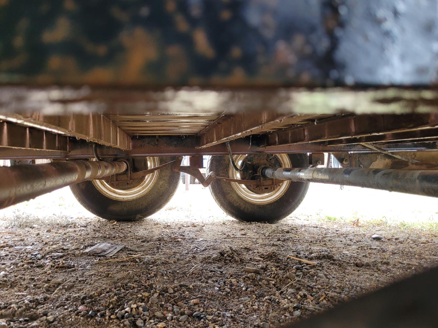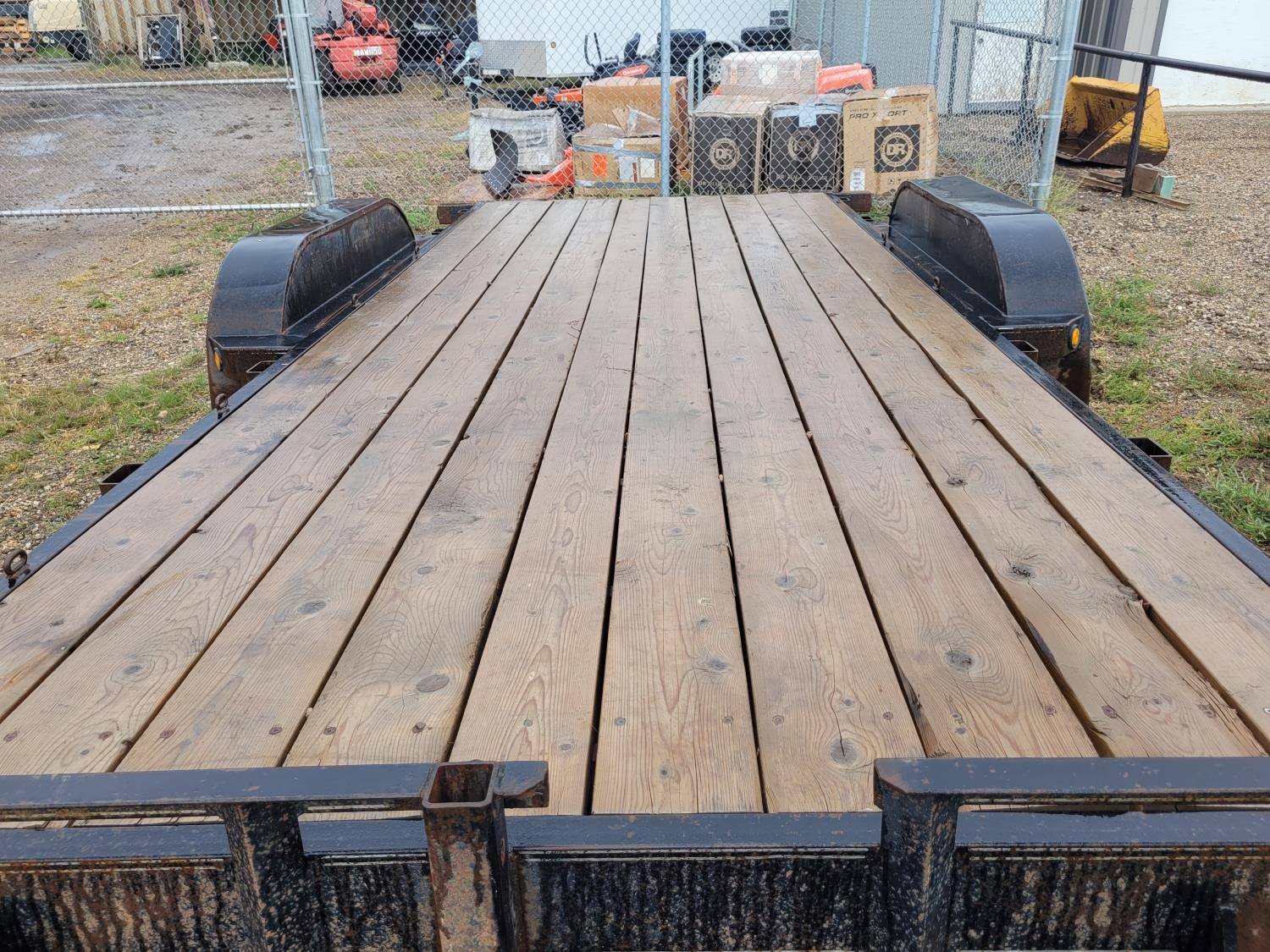 78 inch wide deck, wood deck, spring suspension, ball hitch, stake pockets, 3500 lb axles, 205/75R15 tires