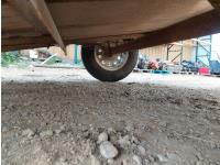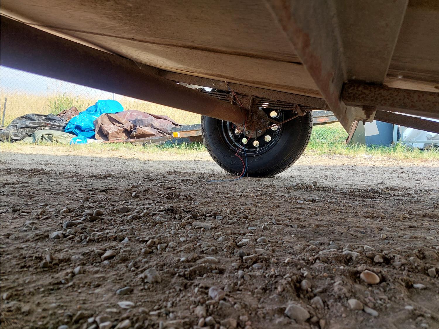 58 inch wide deck, wood deck, spring suspension, ball hitch, plywood sides, 51 inch neck, 3000 lb axles, 175/80D13 tires