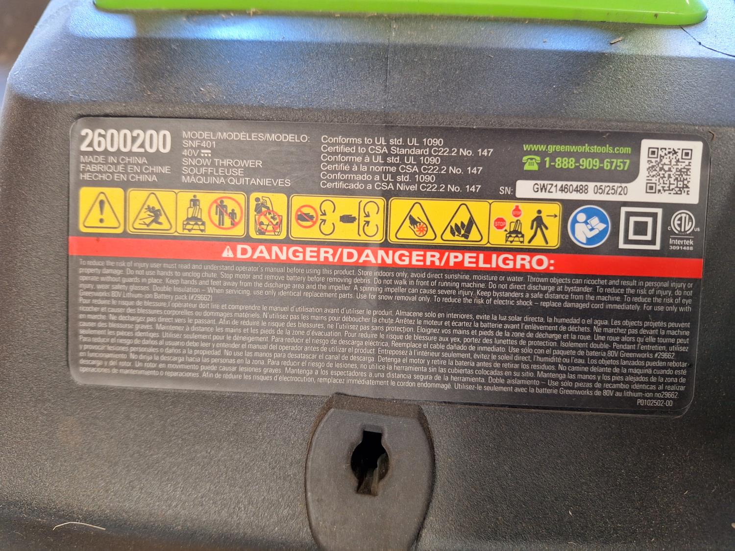 459 Greenworks 2600200 20 Inch Cordless Snow Thrower