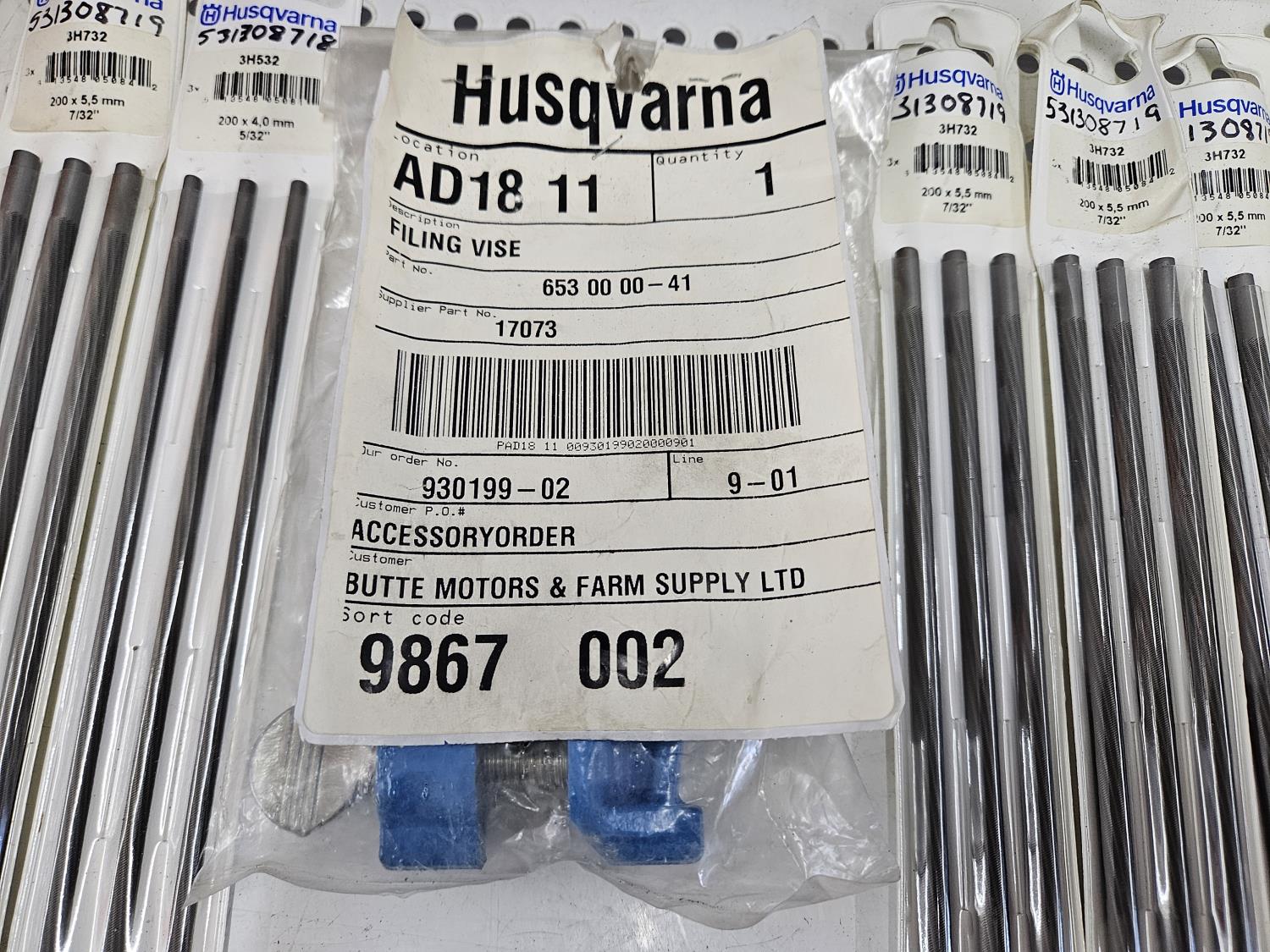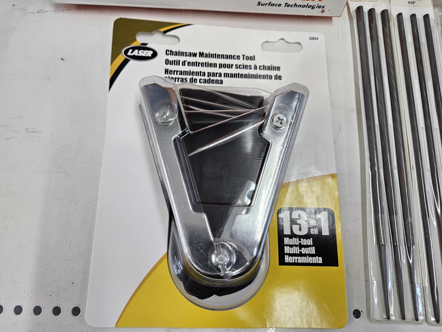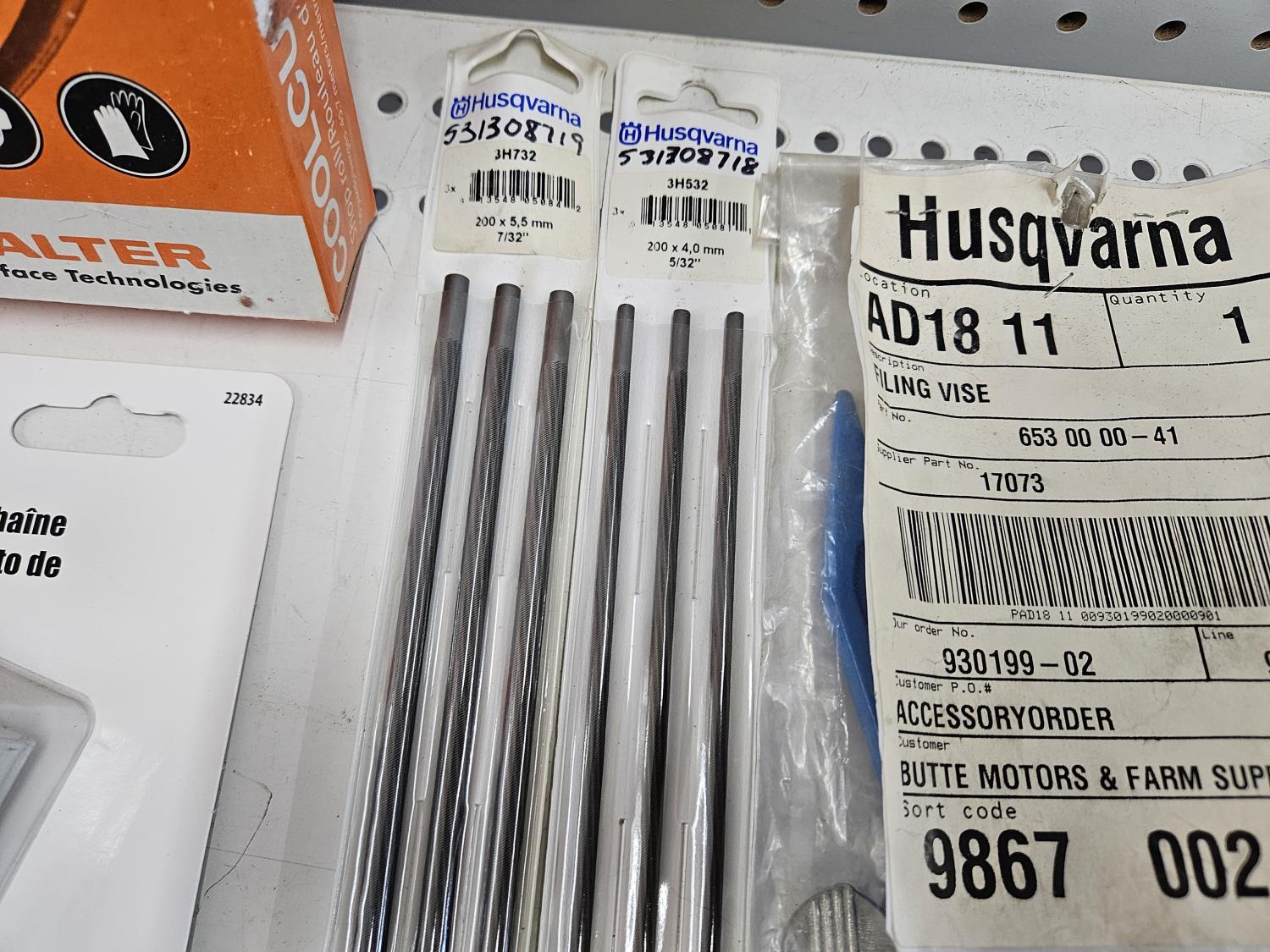 Chainsaw maintenance tool, filing vise, Coolcut shop roll, gloves