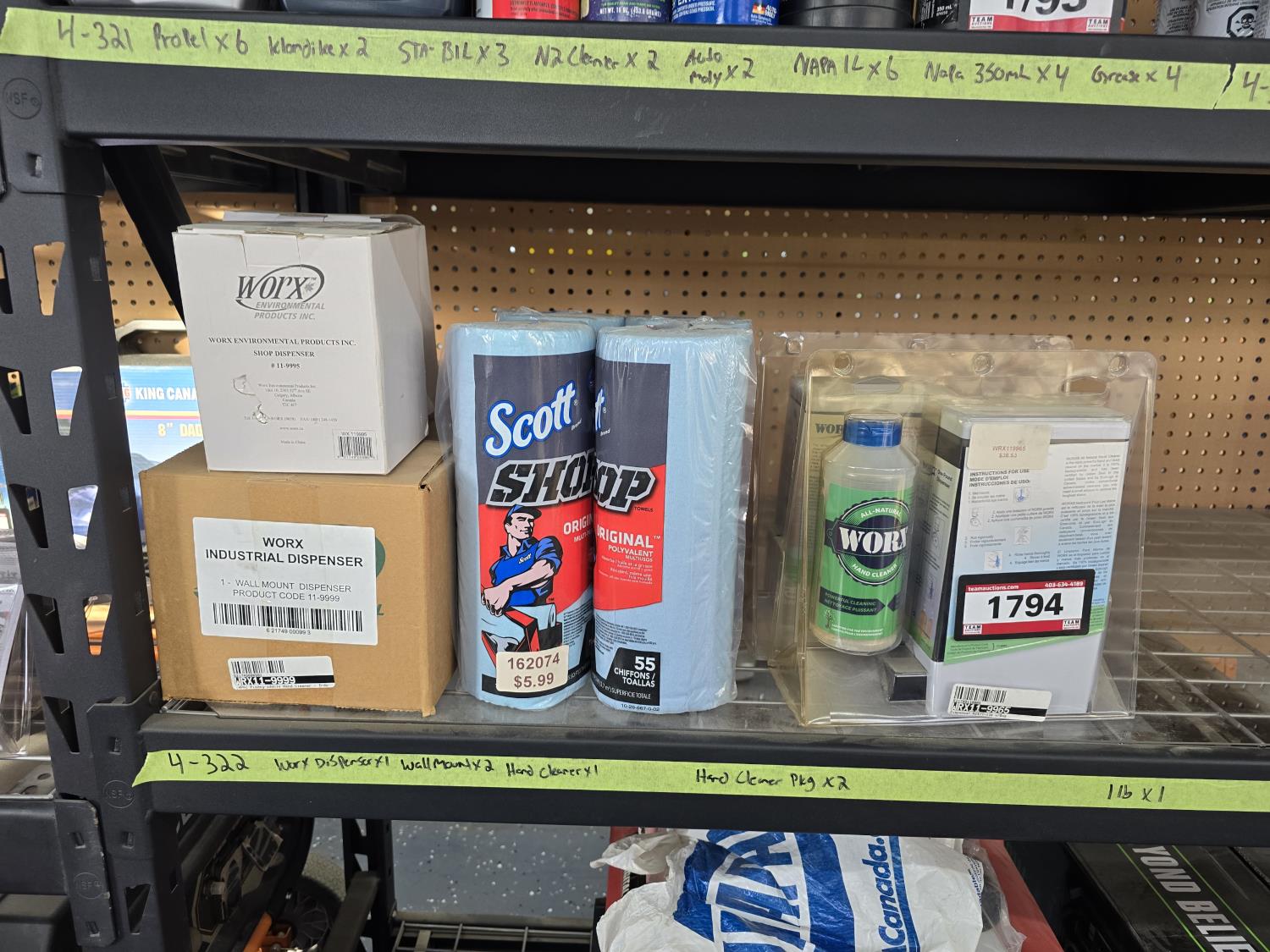 (1) Worx dispenser, (2) Worx wall mount dispensers, hand cleaner, (4) Scott shop towels