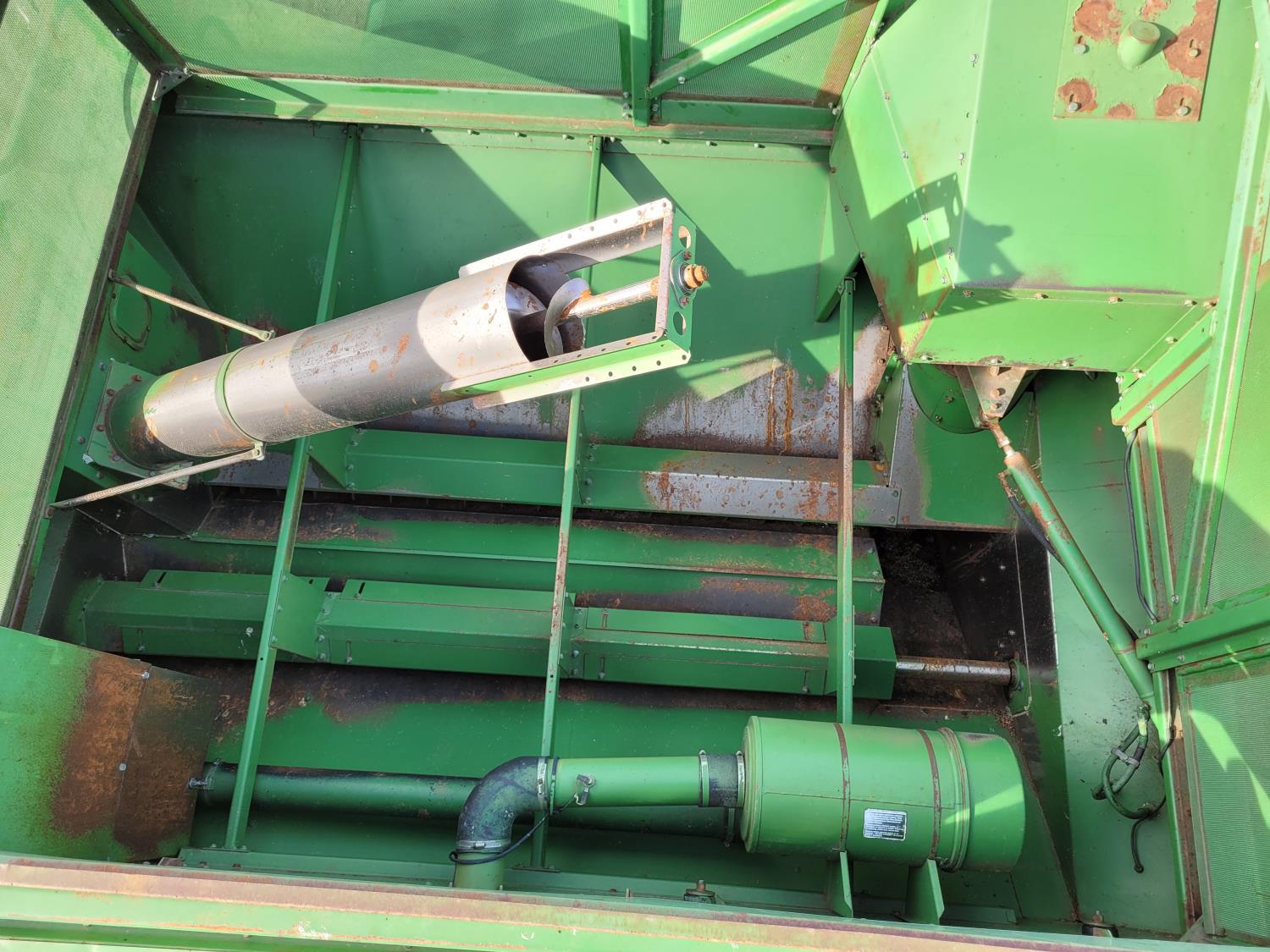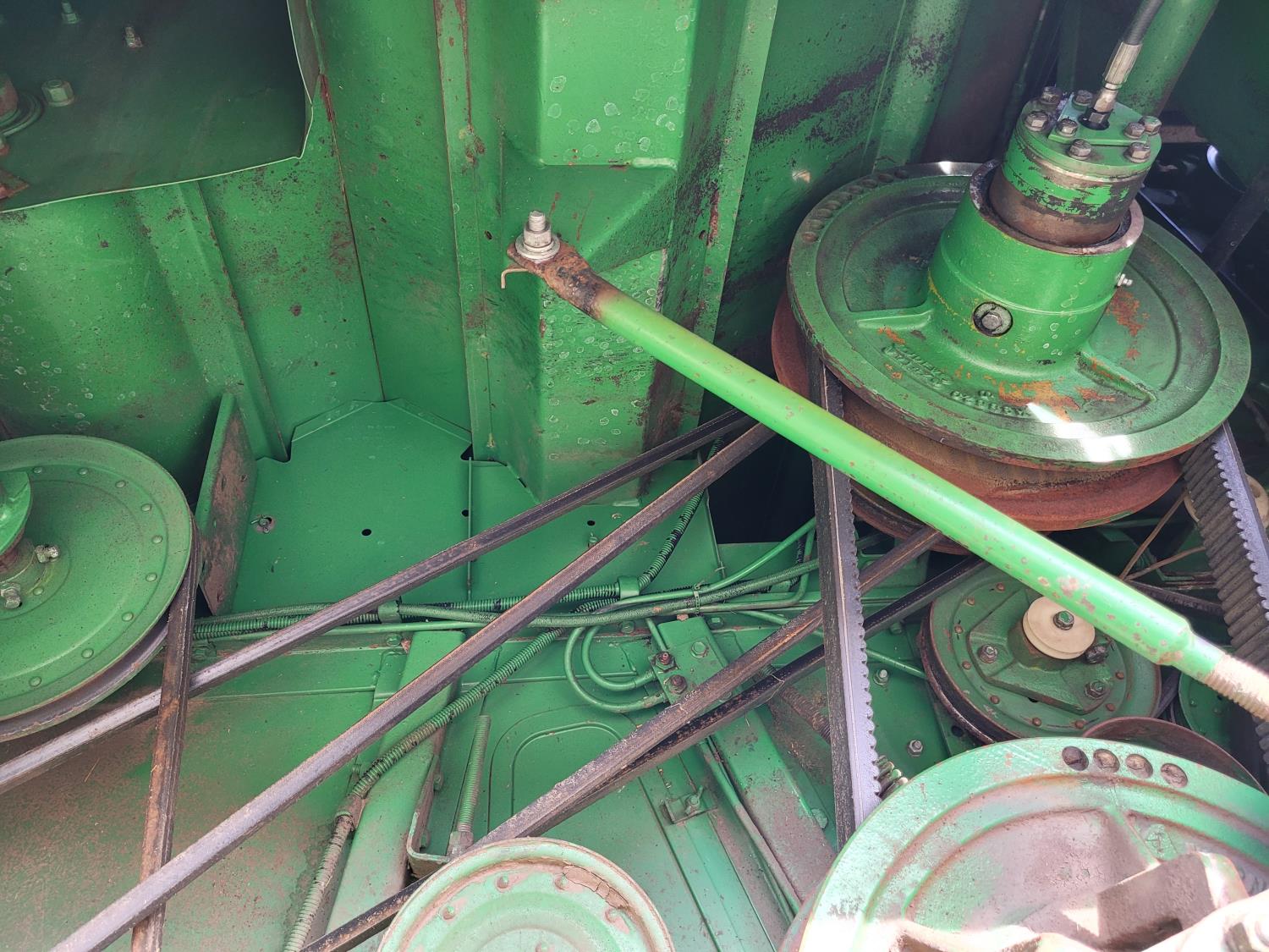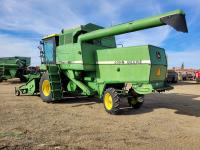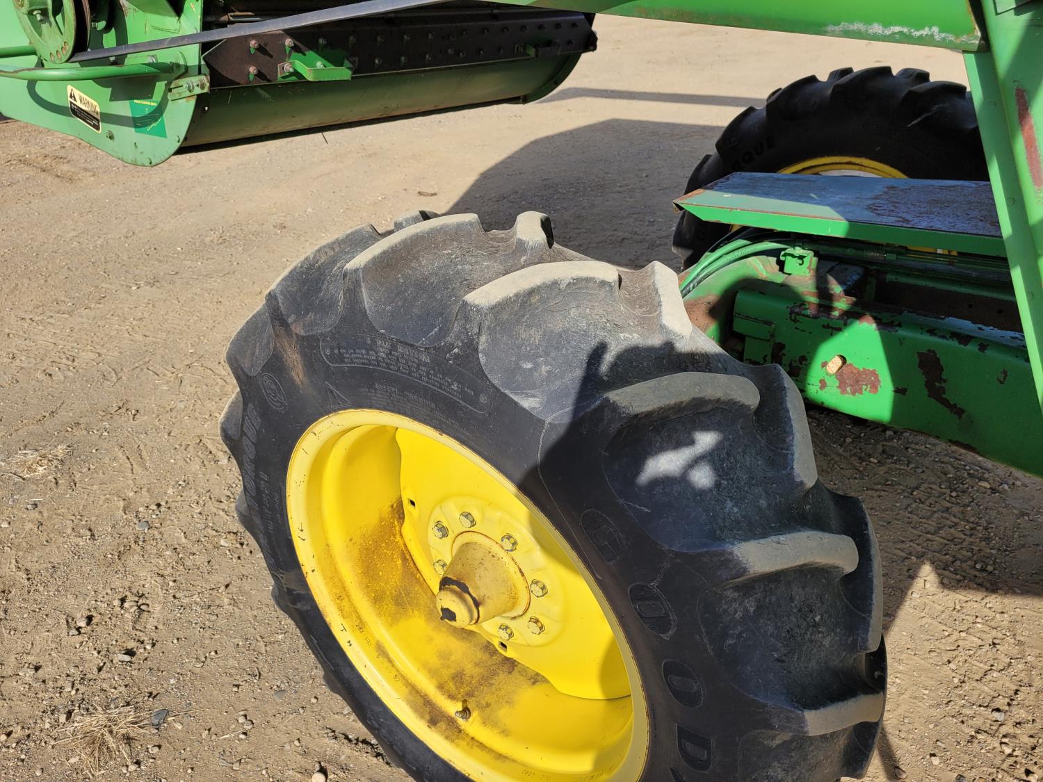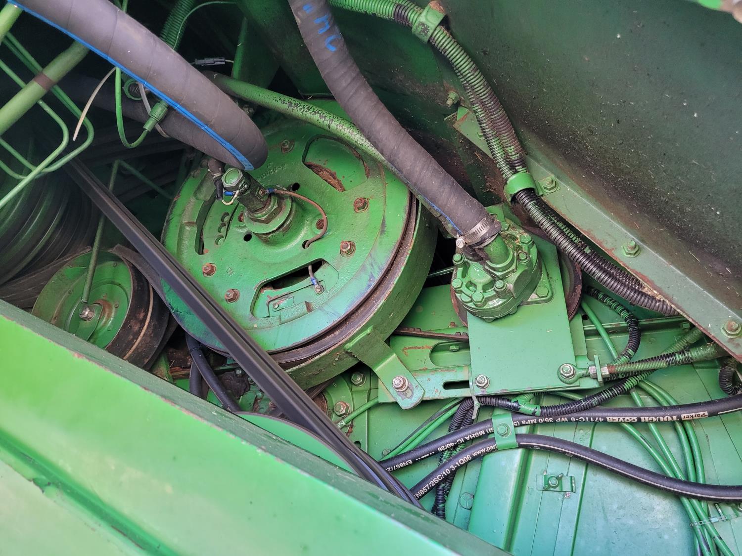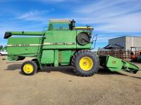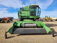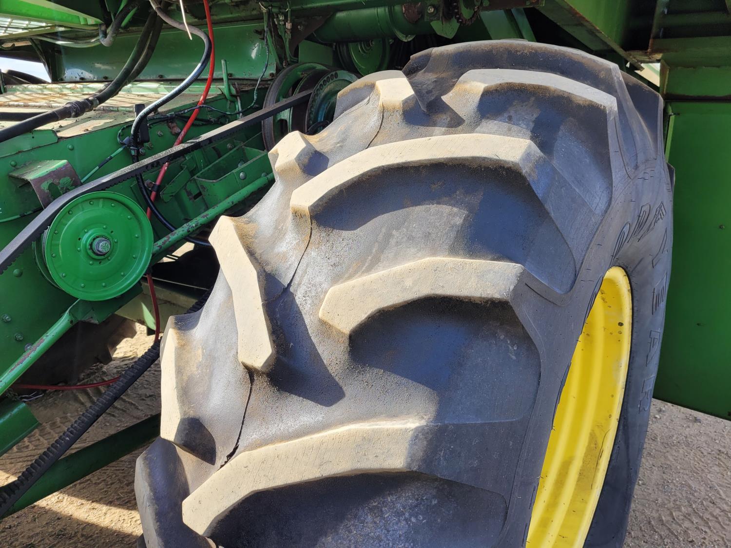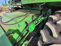 John Deere pick-up header, variable speed reel, rock trap, yield & moisture, chopper, grain tank extensions, A/C, radio, 24.5-32 front tires, 11.2-24 rear tires