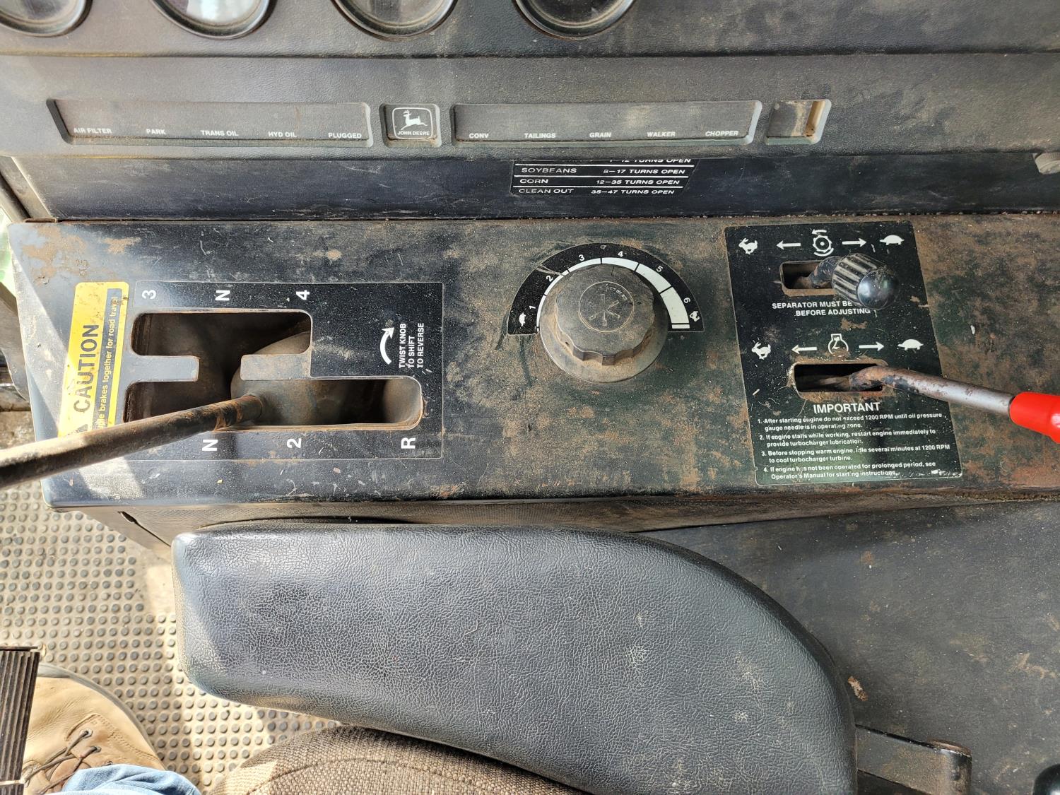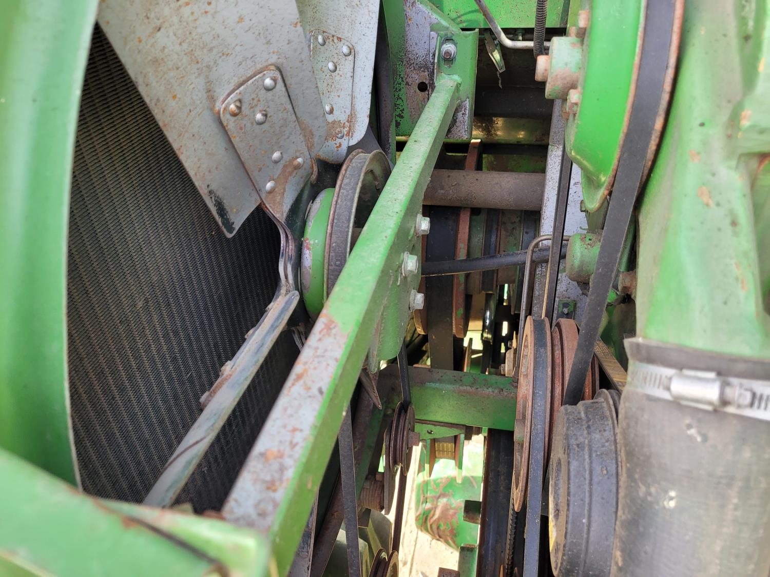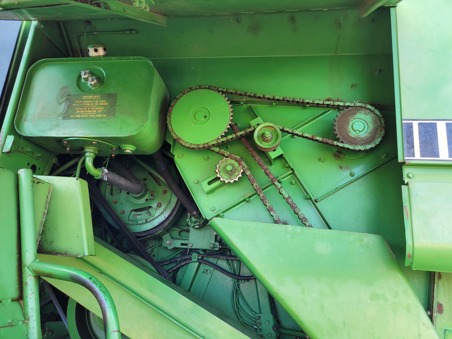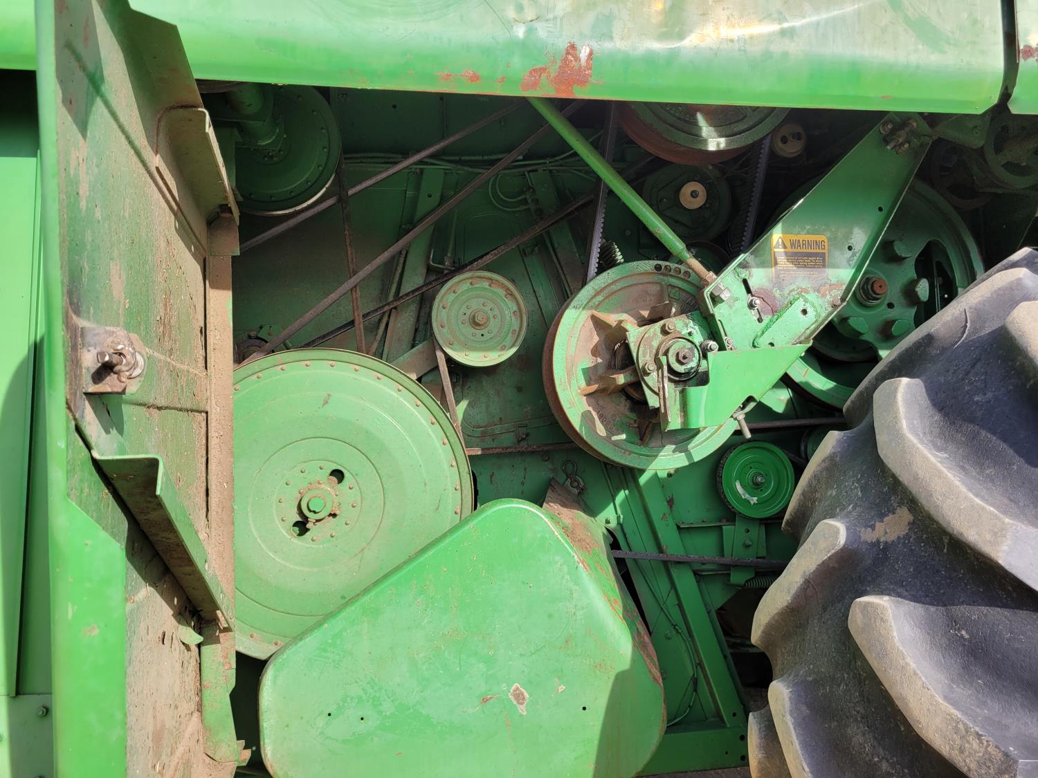 John Deere pick-up header, variable speed reel, rock trap, yield & moisture, chopper, grain tank extensions, A/C, radio, 24.5-32 front tires, 11.2-24 rear tires