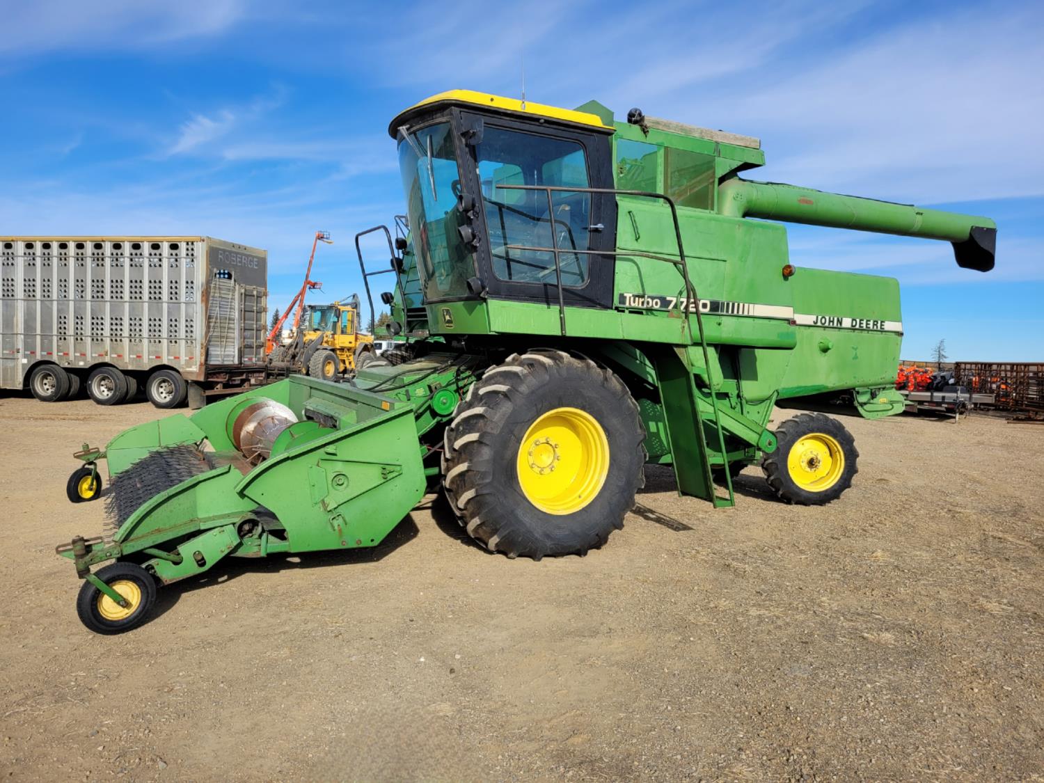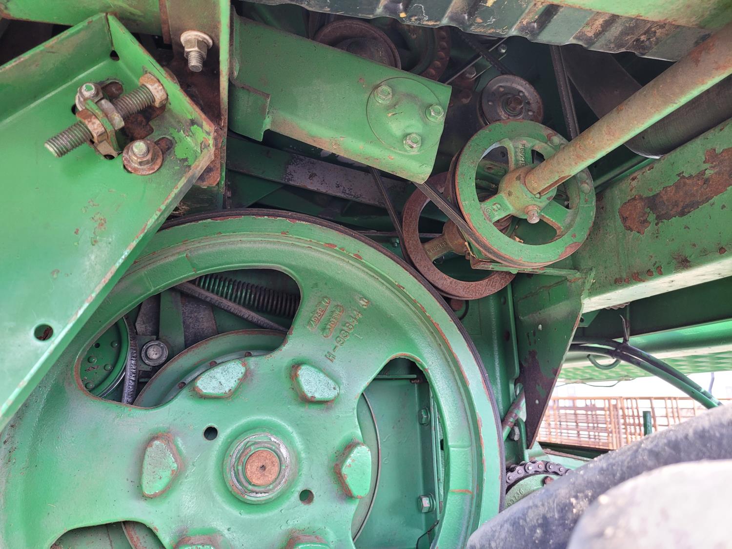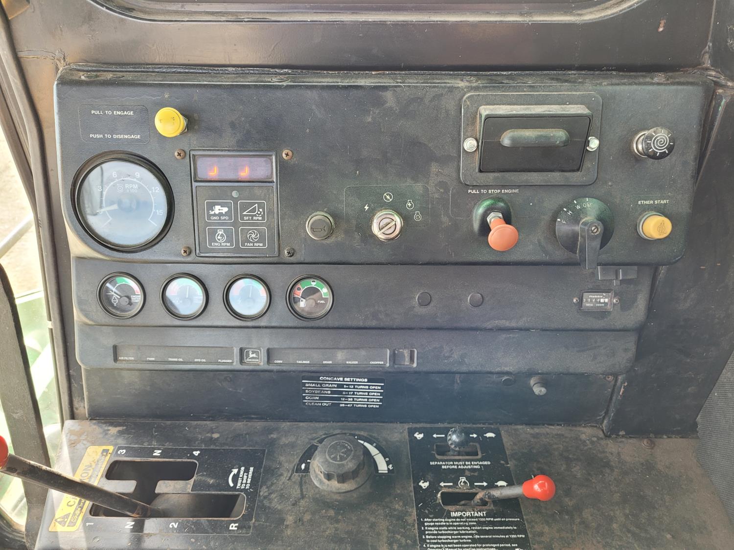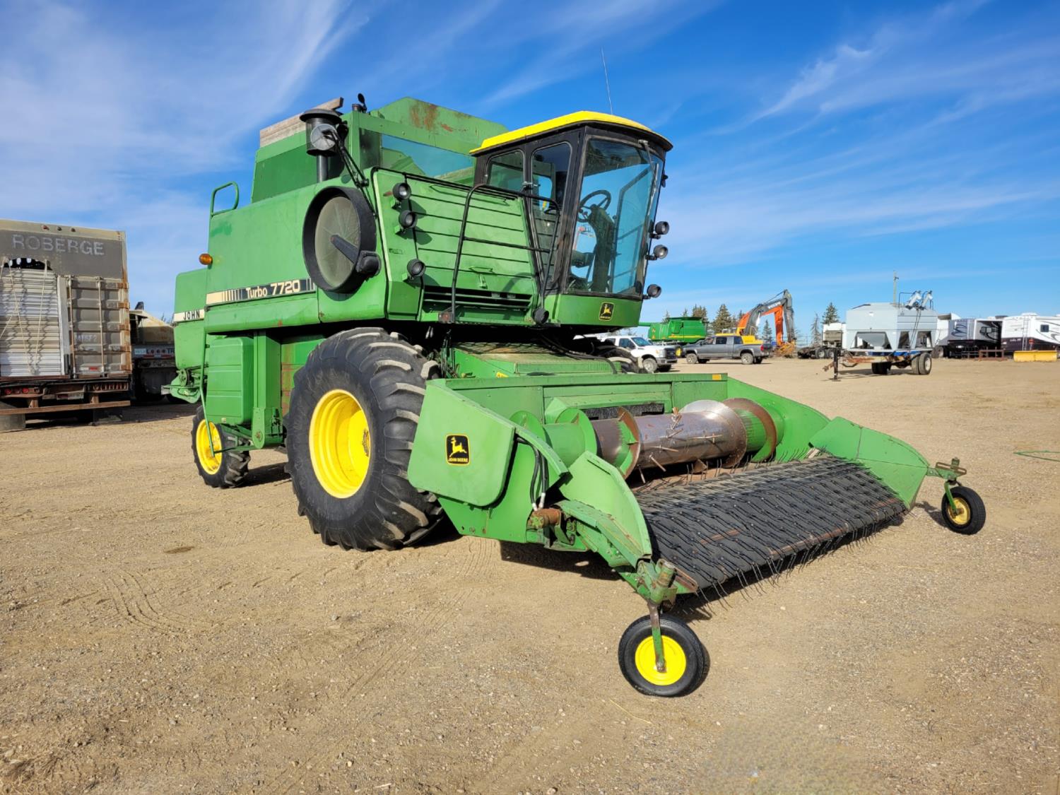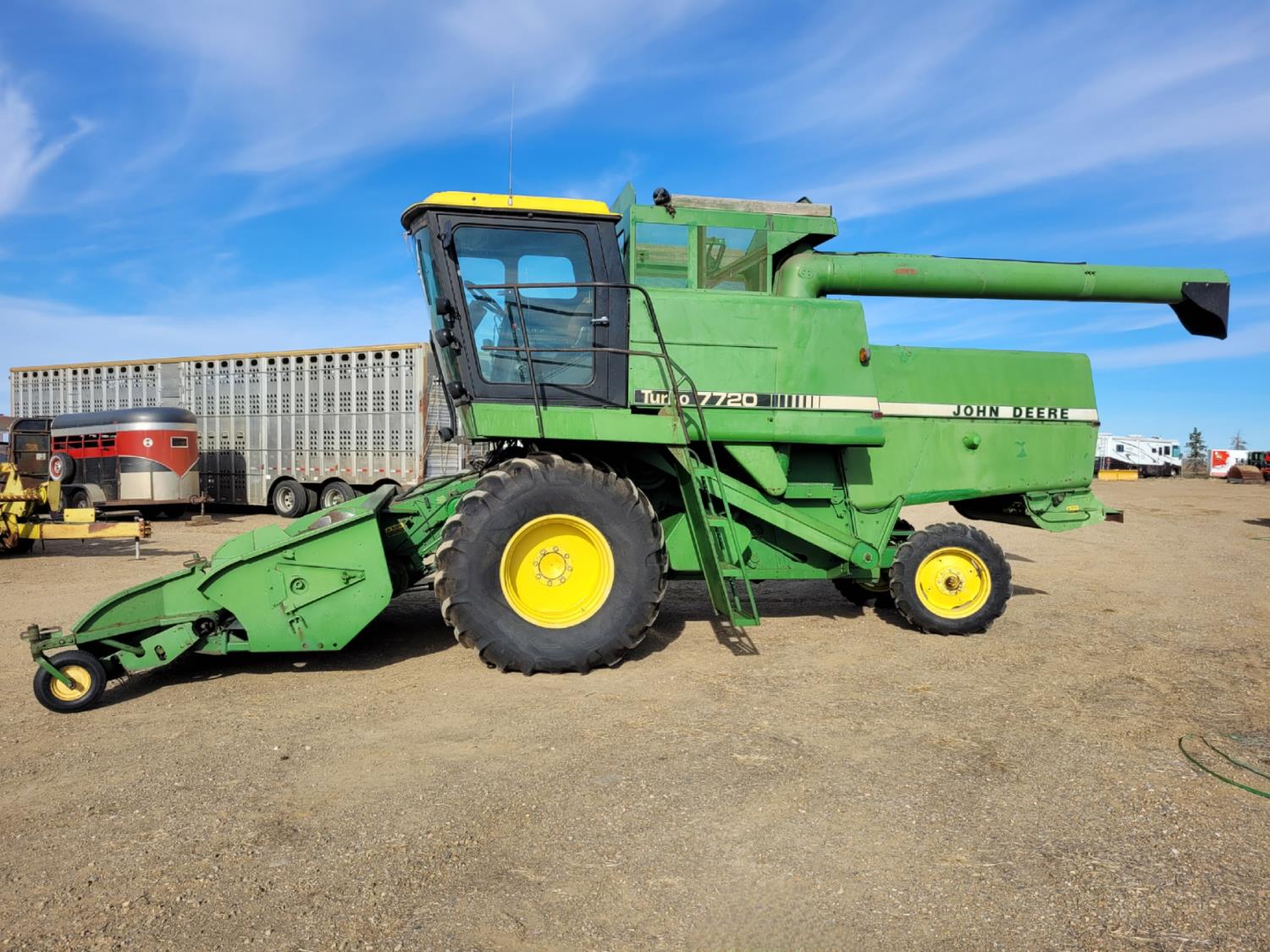 John Deere pick-up header, variable speed reel, rock trap, yield & moisture, chopper, grain tank extensions, A/C, radio, 24.5-32 front tires, 11.2-24 rear tires