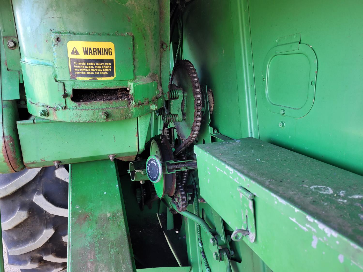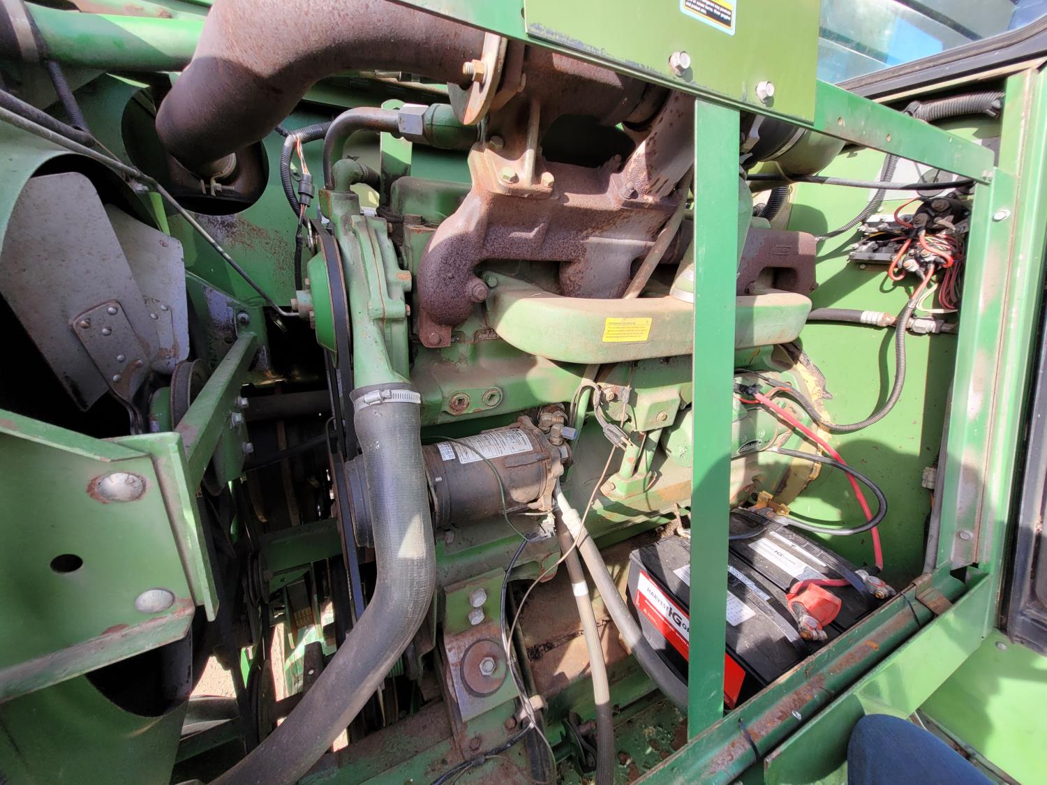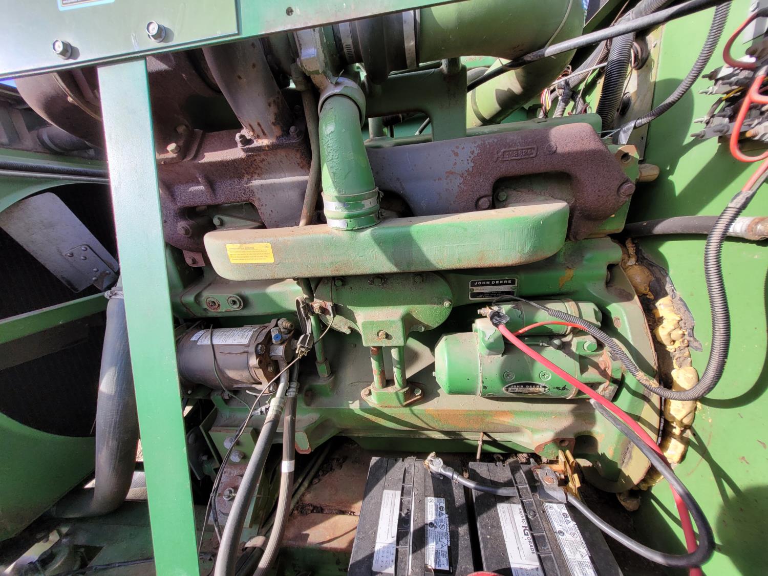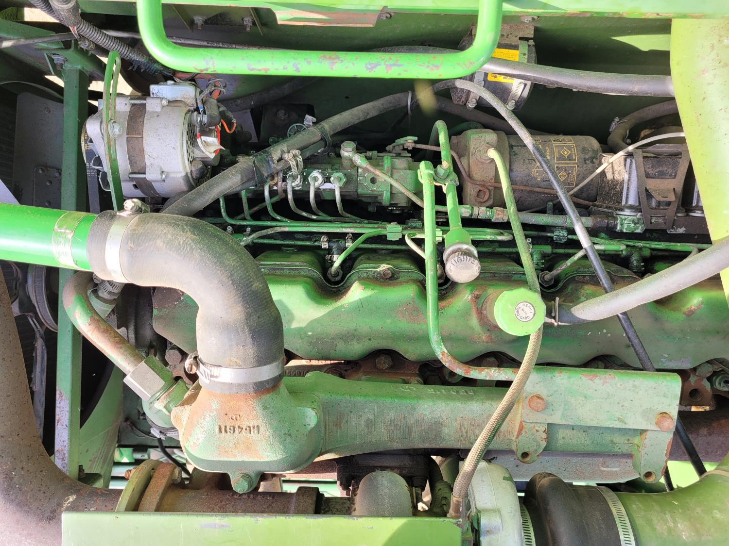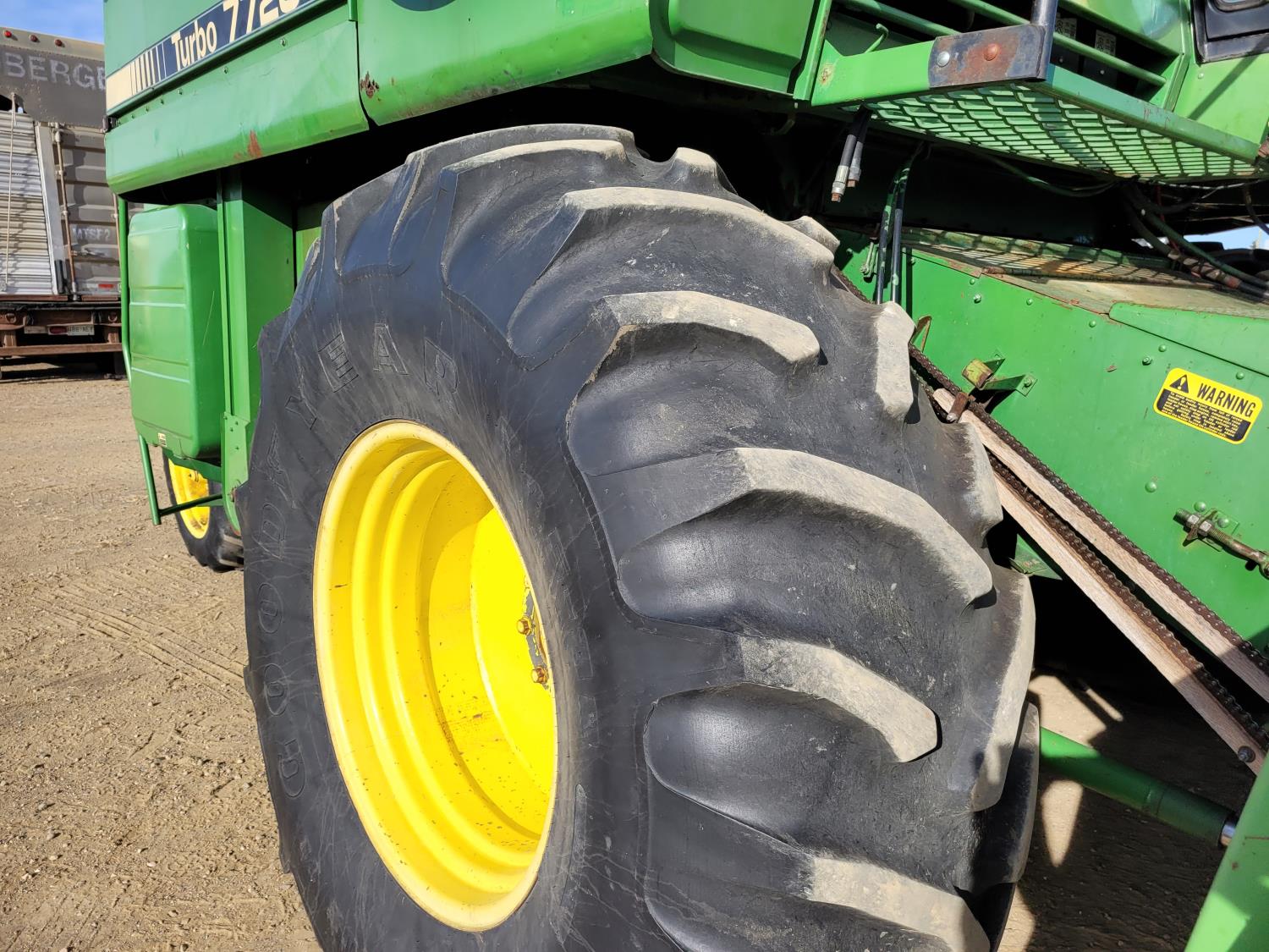 John Deere pick-up header, variable speed reel, rock trap, yield & moisture, chopper, grain tank extensions, A/C, radio, 24.5-32 front tires, 11.2-24 rear tires