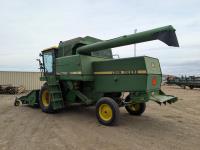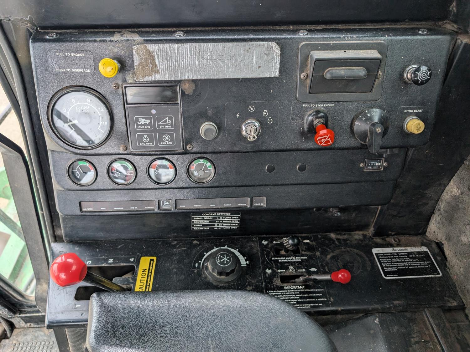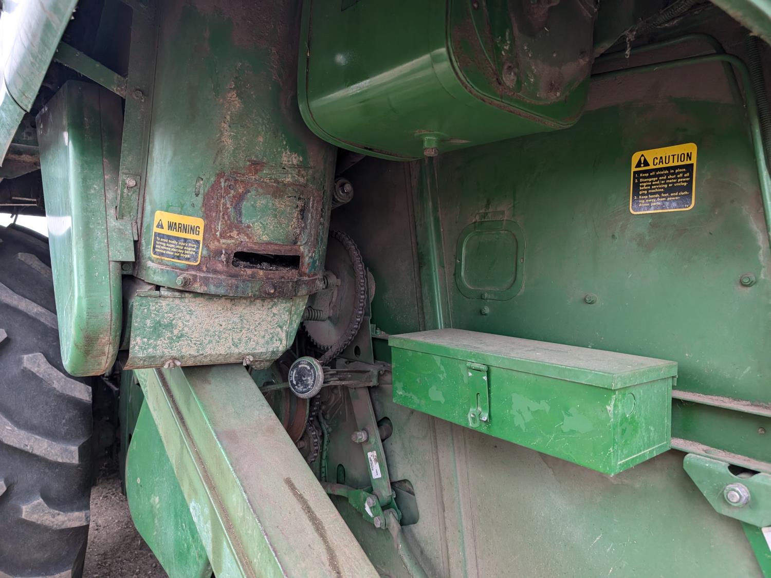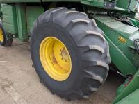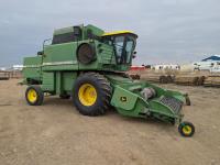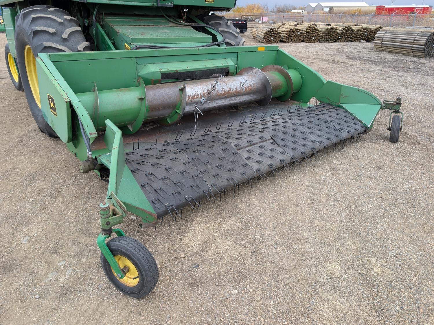 John Deere pick-up header, variable speed reel, rock trap, yield & moisture, chopper, grain tank extensions, hydrostatic drive, A/C, radio, 24.5-32 front tires, 11.25-24 rear tires