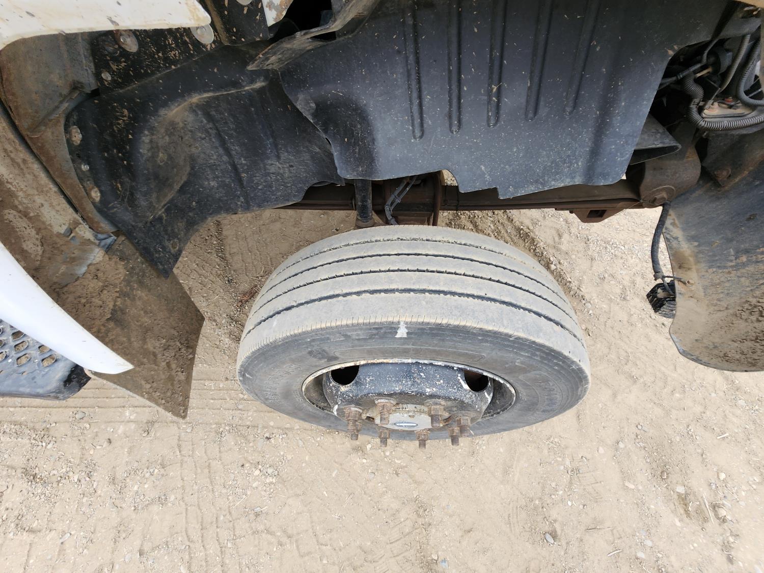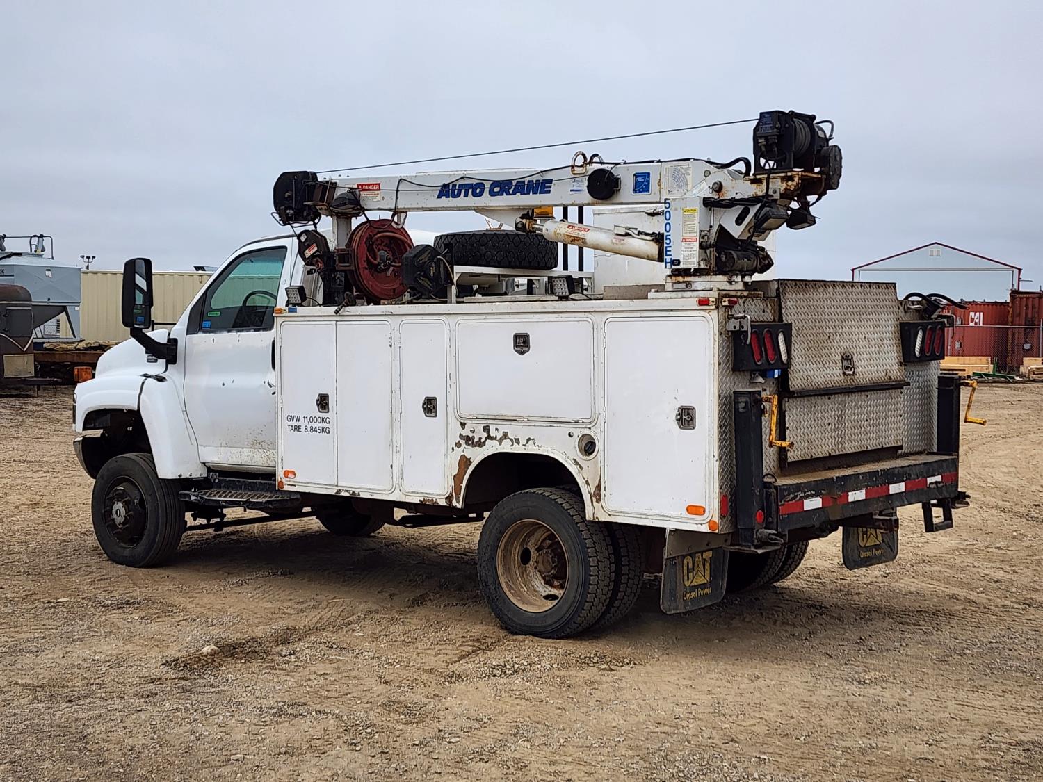 Duramax 6.6 L V8 diesel engine, Allison automatic transmission, Auto Crane 5005EH straight boom crane, Western Truck body, hydraulic air compressor, spring suspension, 8,000 lb front axle, 13,500 lb rear axles, 245/70R19.5 tires