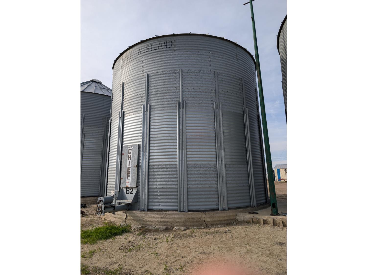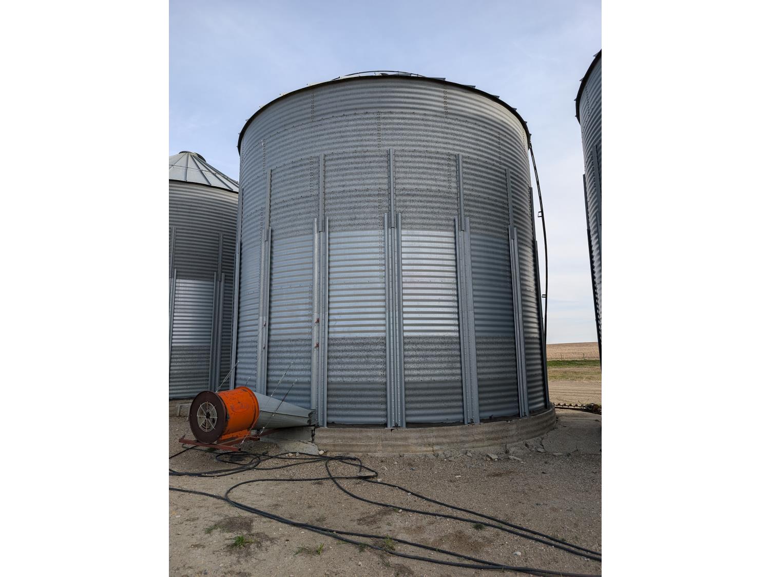 15,000± bu capacity, concrete floor, wall stiffeners, Sudenga unloading auger, floor aeration, Caldwell 10.5 HP 230 single phase aeration fan
