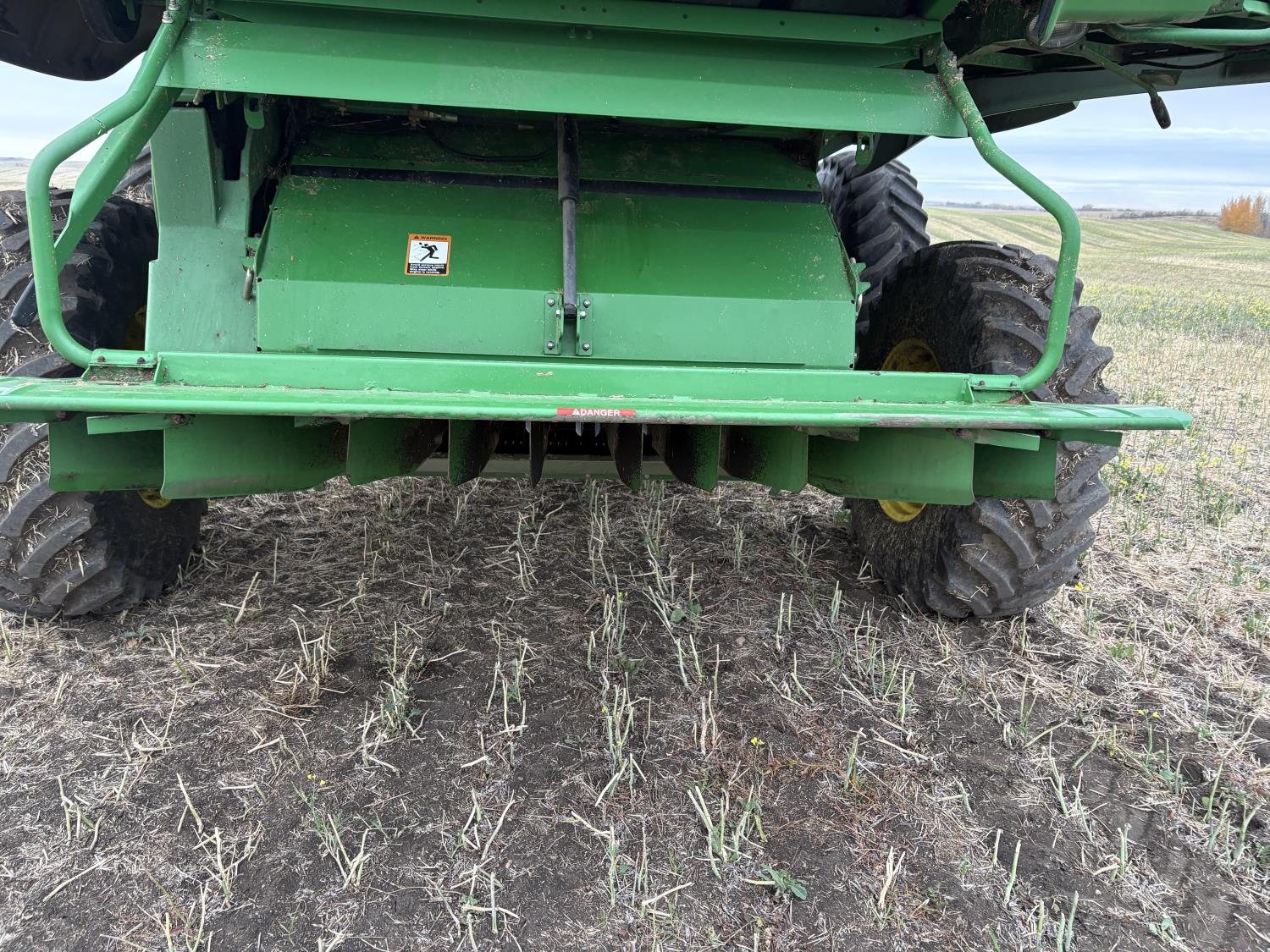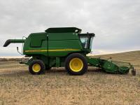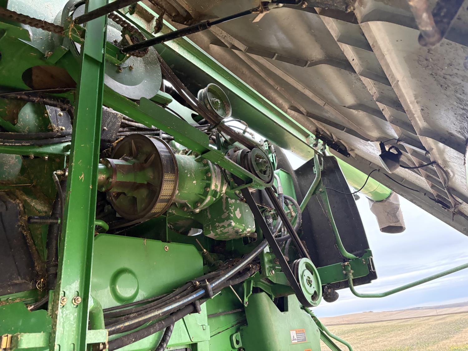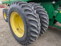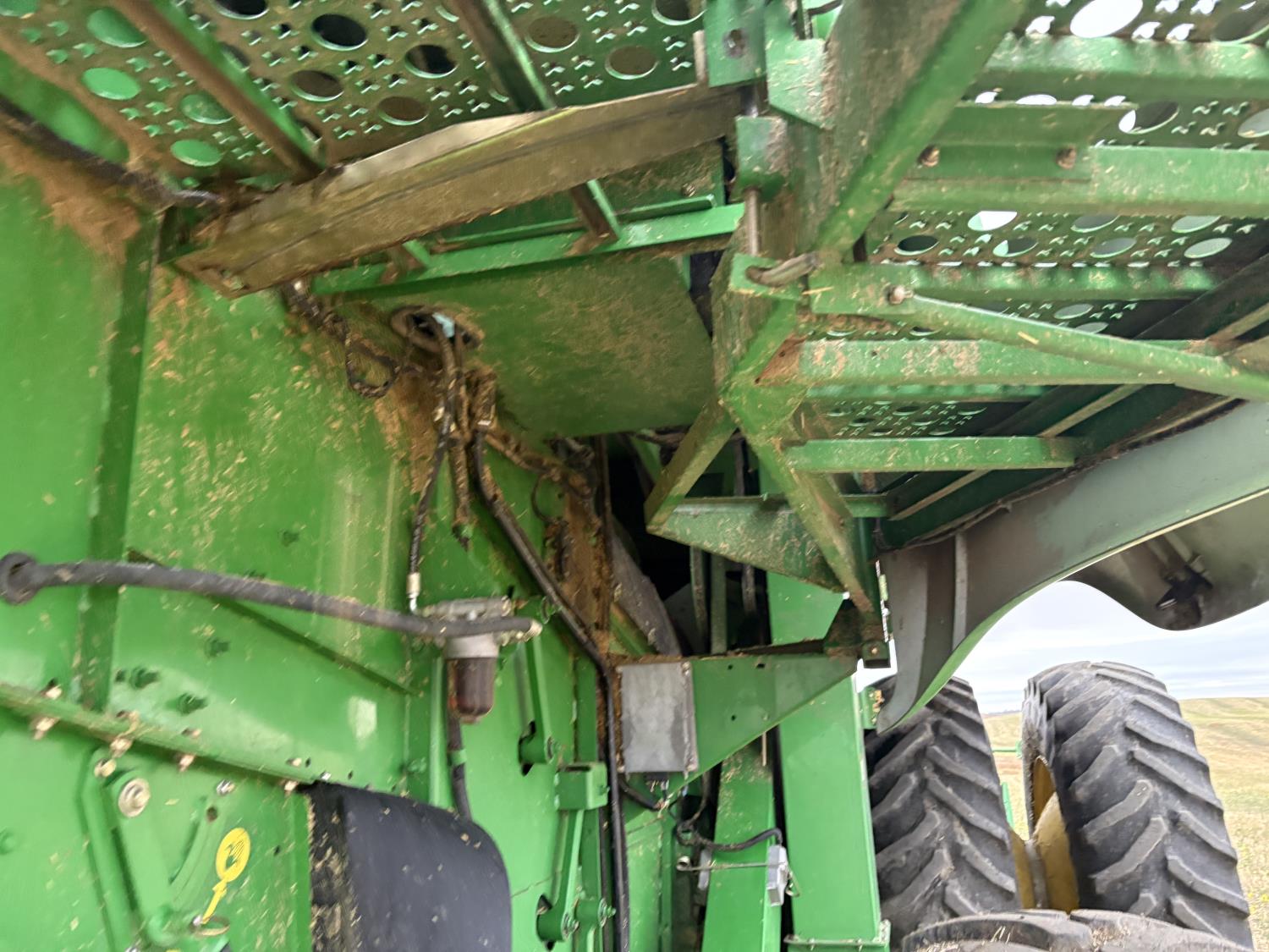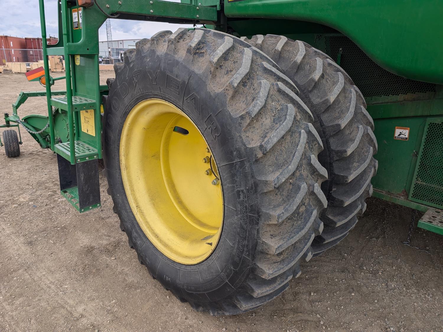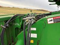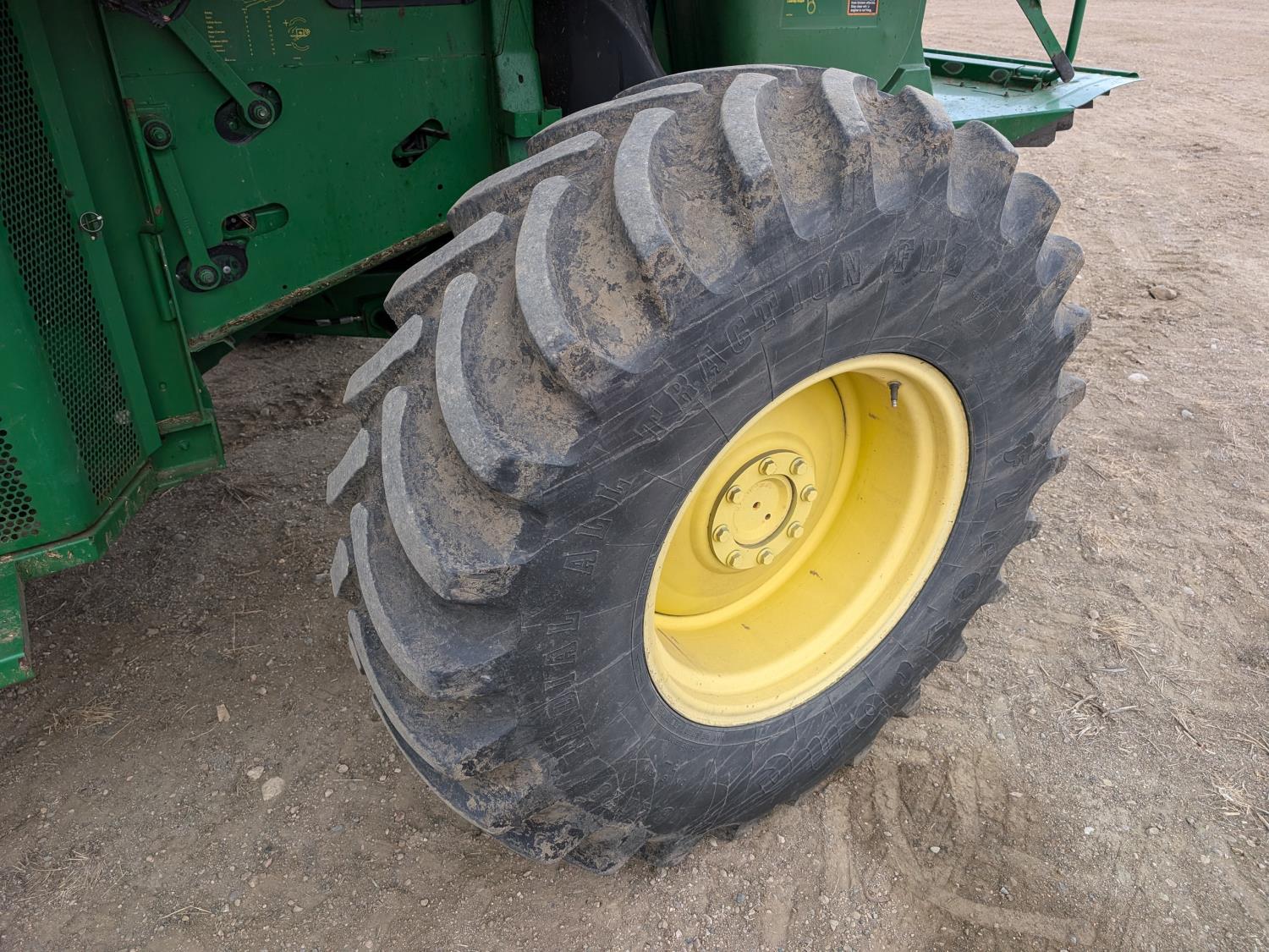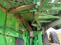 1999 John Deere 914P 14 ft pick-up header, variable speed reel, auto header height, fore & aft, reverser, lateral tilt, rock trap, yield & moisture, chopper, grain tank extensions, A/C, radio, air ride seat, buddy seat, Autotrac universal 300 steering wheel, mount & wiring for monitor, 520/85R42 front tires, duals, 18.4R26 rear tires