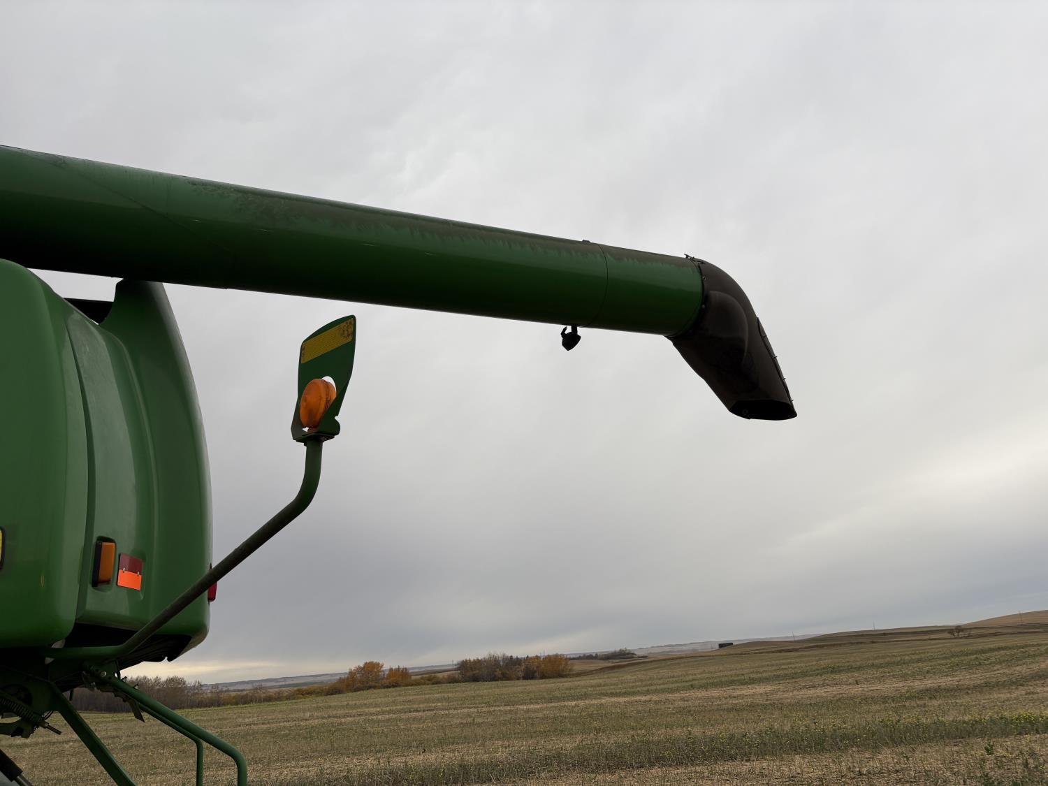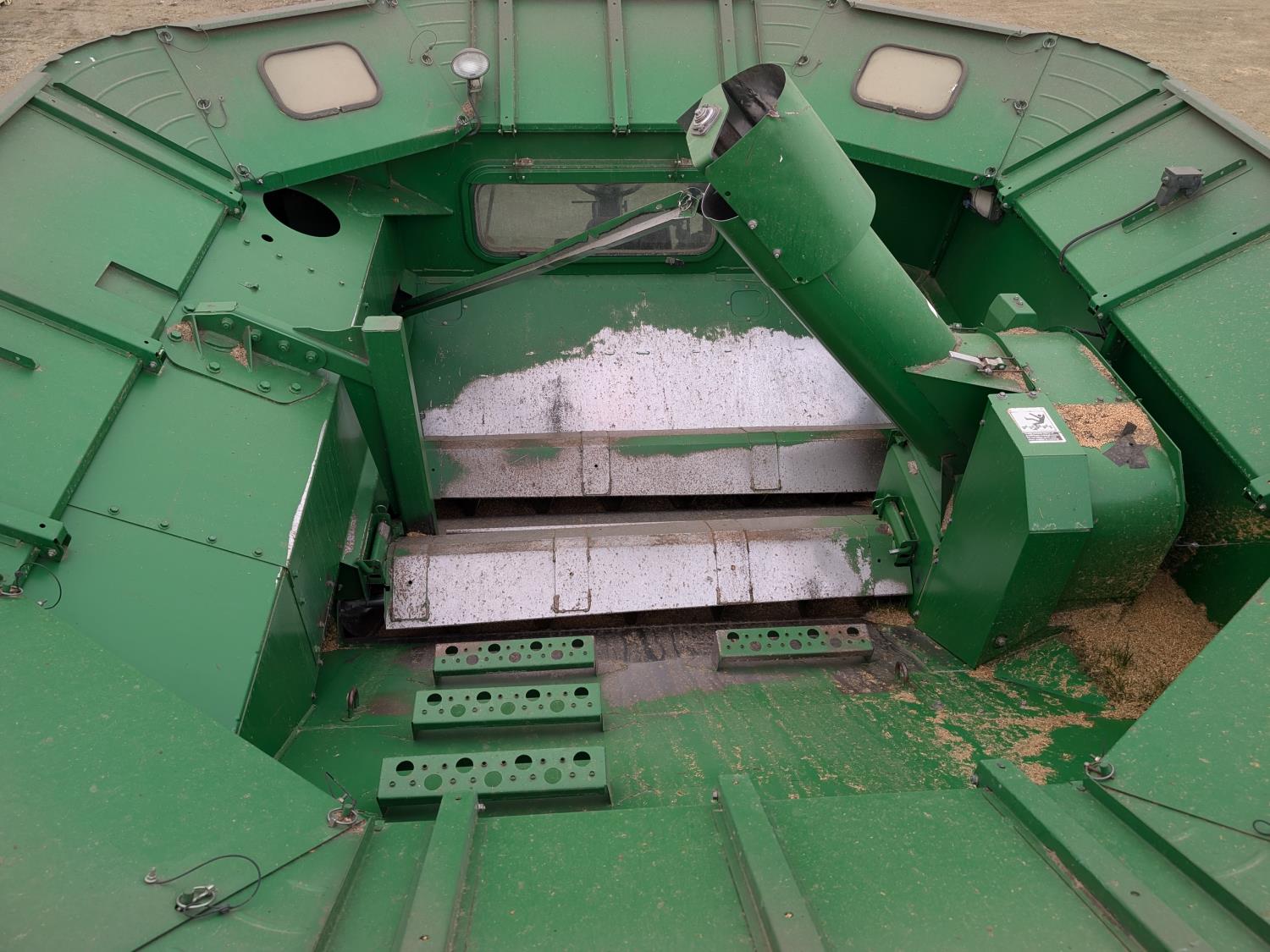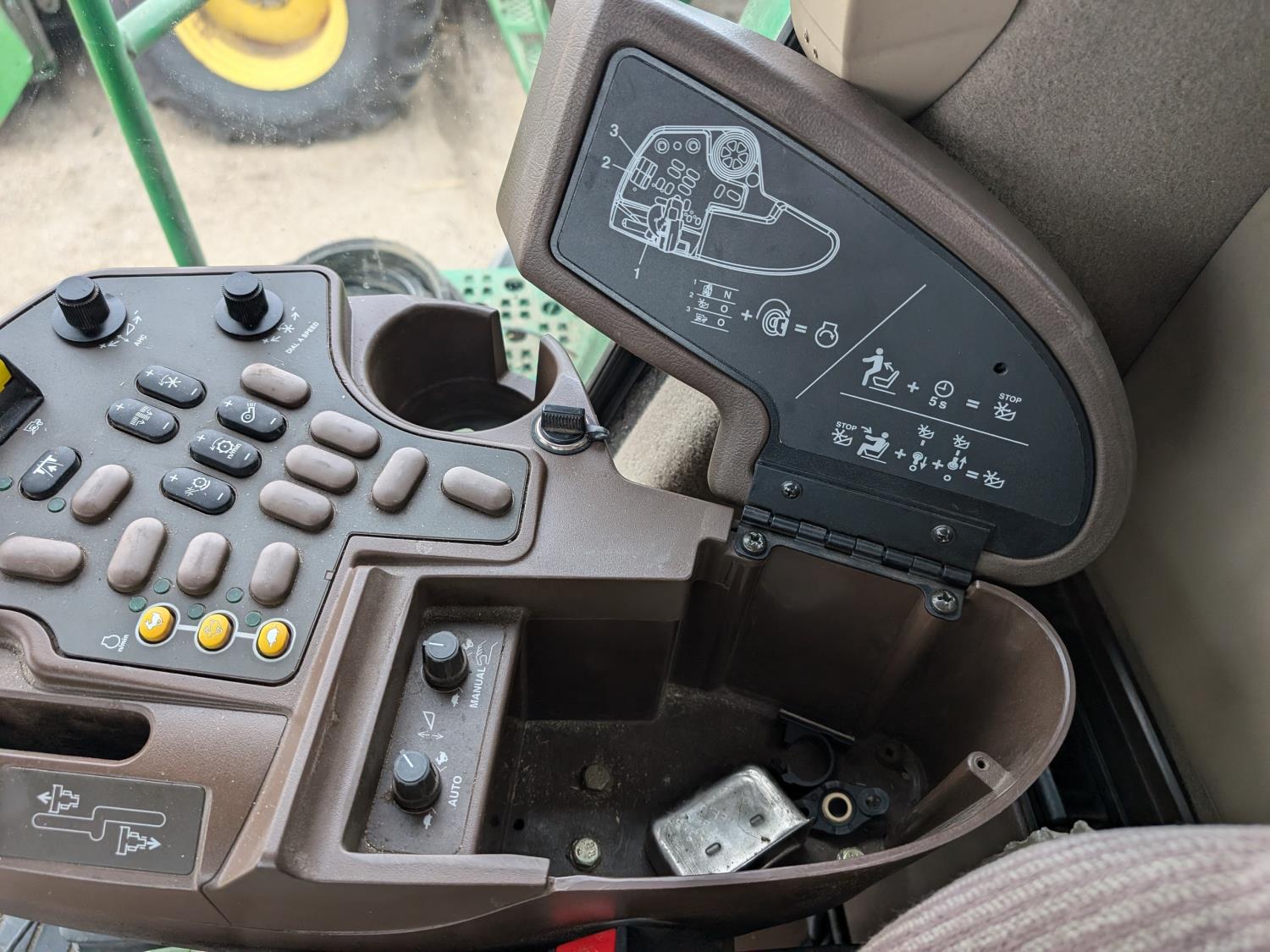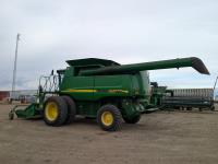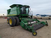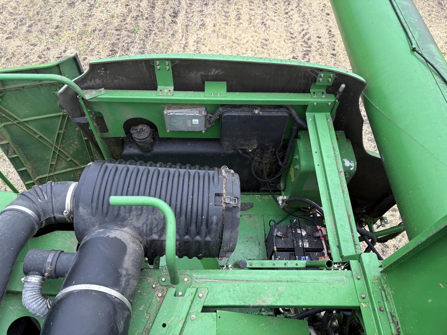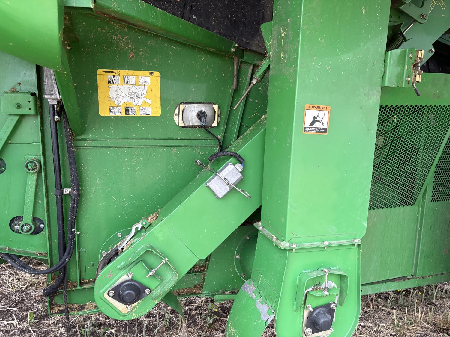 1999 John Deere 914P 14 ft pick-up header, variable speed reel, auto header height, fore & aft, reverser, lateral tilt, rock trap, yield & moisture, chopper, grain tank extensions, A/C, radio, air ride seat, buddy seat, Autotrac universal 300 steering wheel, mount & wiring for monitor, 520/85R42 front tires, duals, 18.4R26 rear tires