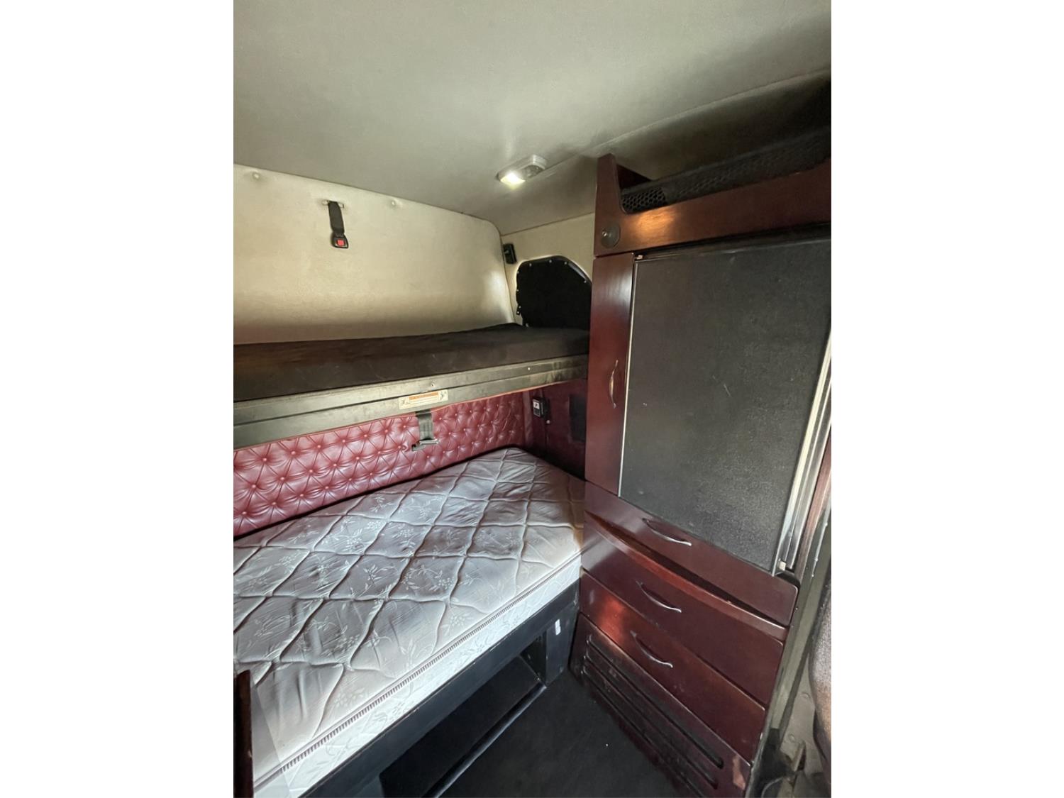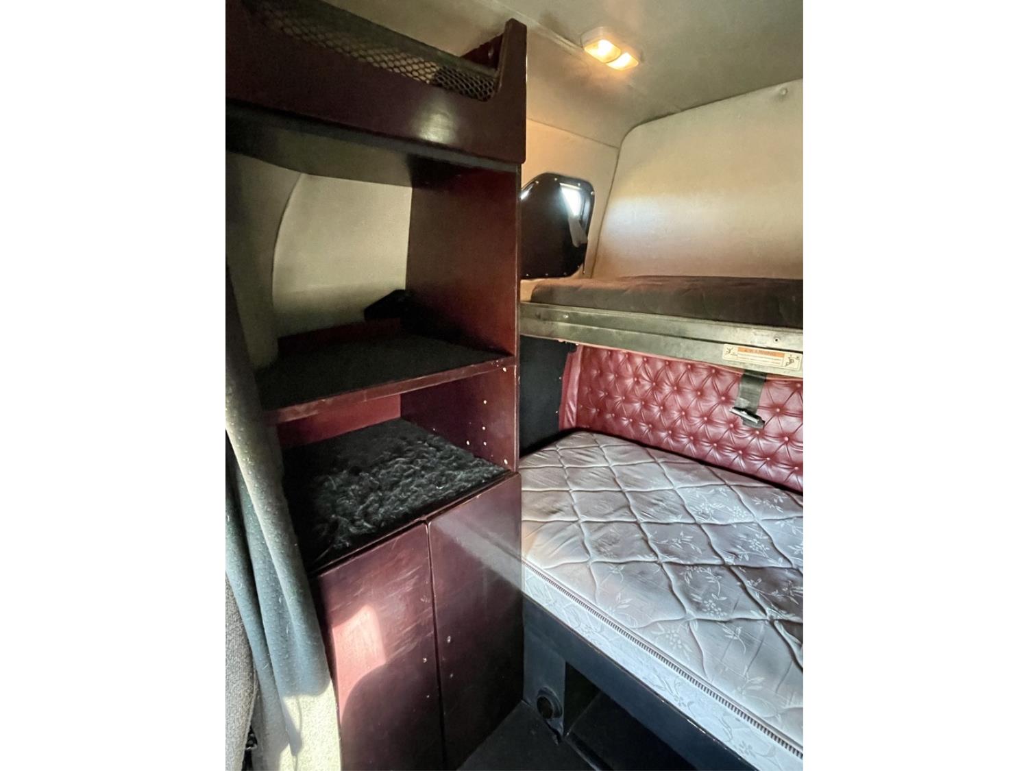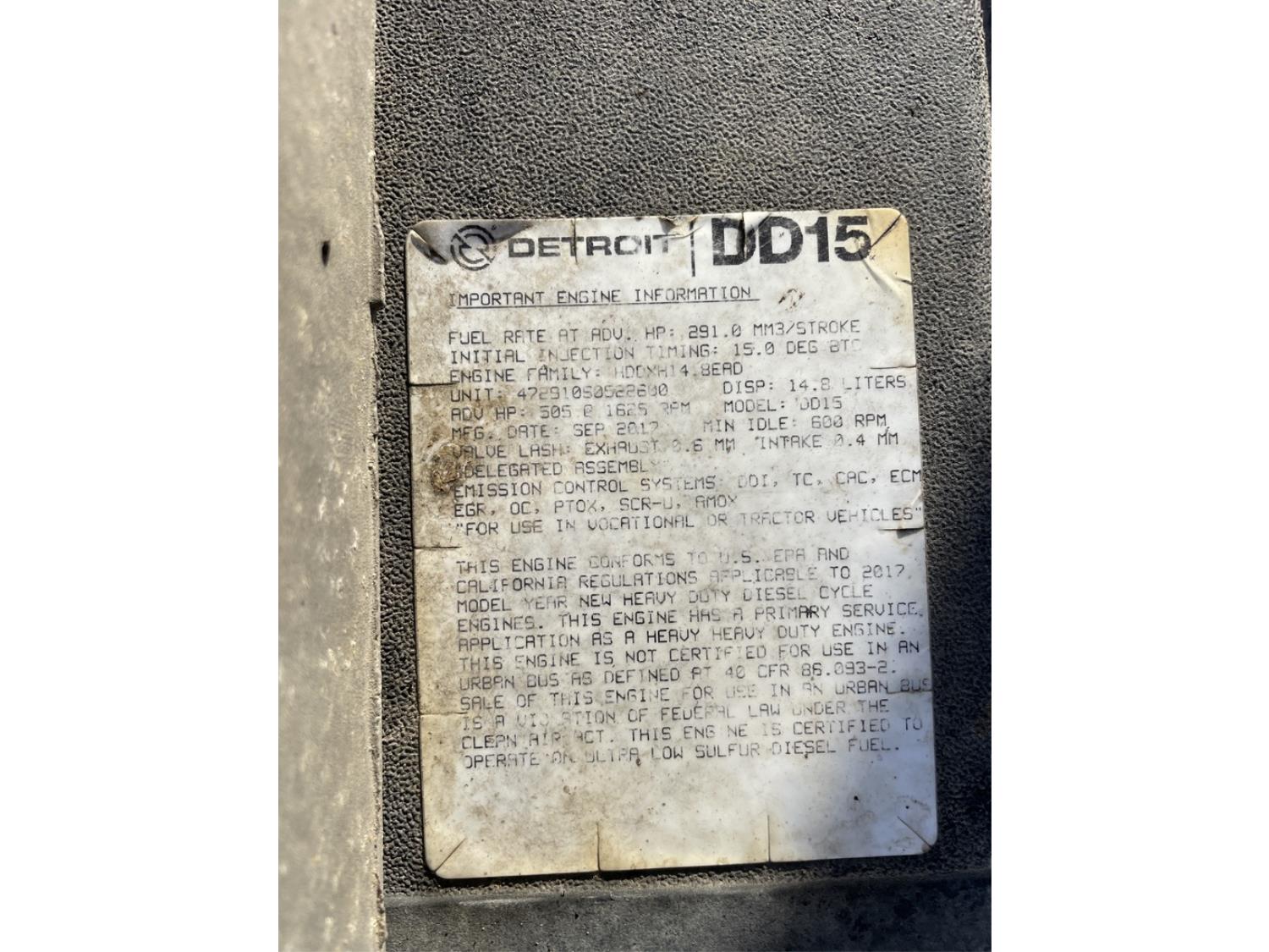 Detroit DD15 14.8 L 6 cylinder 505 HP diesel engine, engine brake, DT121750OH1HD 12 speed auto shift transmission, Webasto cab heater, high rise 60 inch sleeper, fridge, A/C, cruise control, leather interior, navigation system, air ride seats, radio, CB radio, Herd aluminum moose bumper, Airliner air ride suspension, 12,500 lb front axle, 40,000 lb rear axles, full lockers, 3.08 ratio, 236 inch WB, Freedom HF invertor, all aluminum wheels, 11R22.5 tires