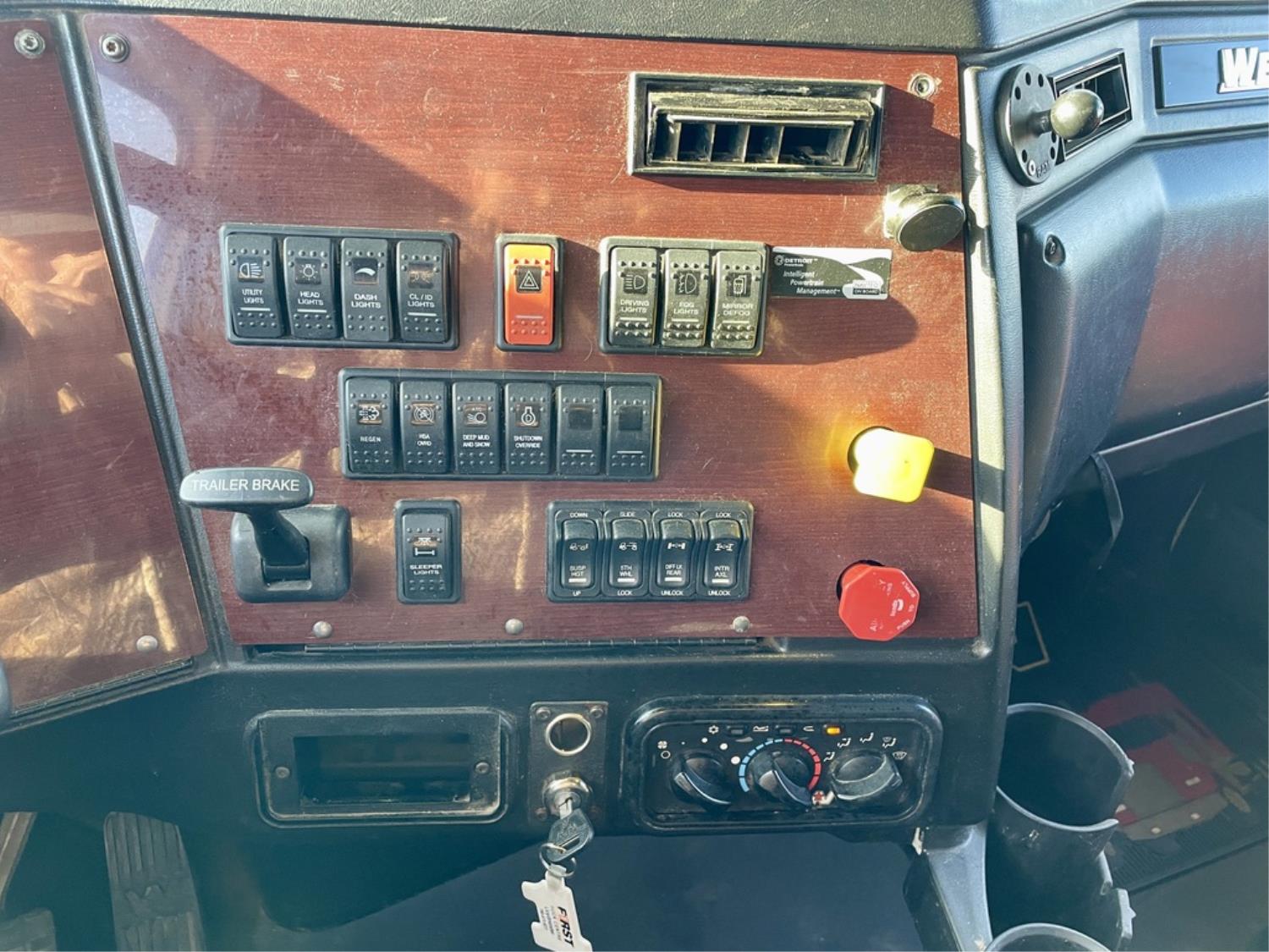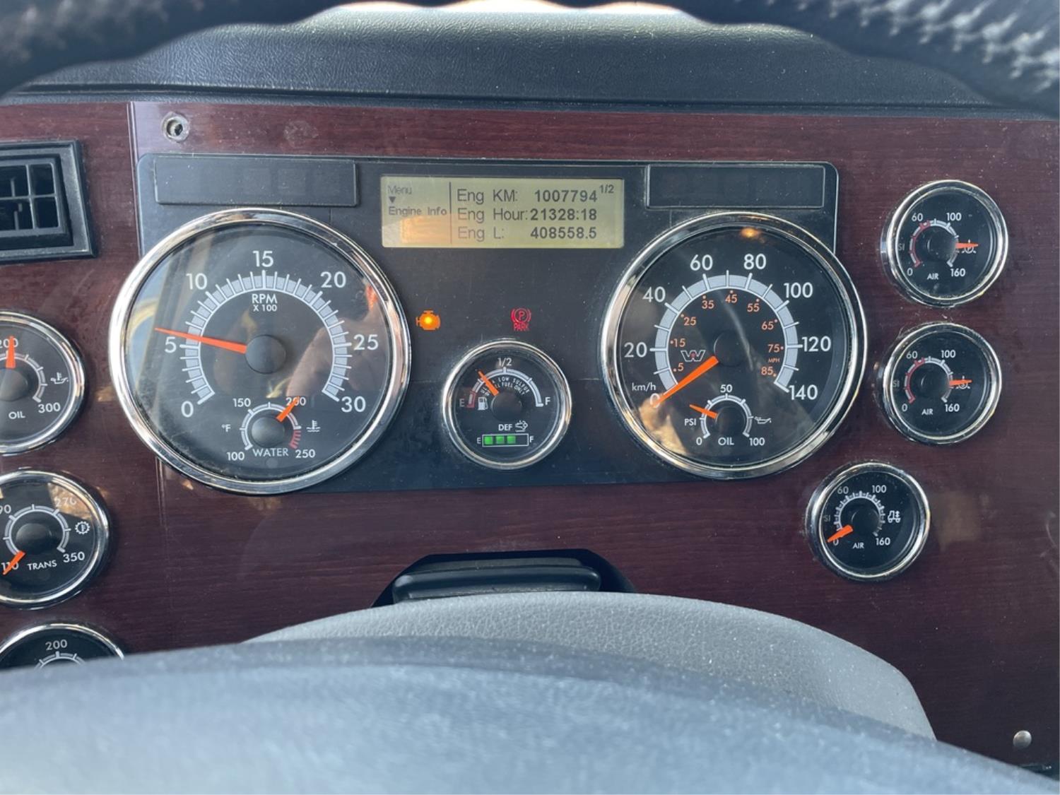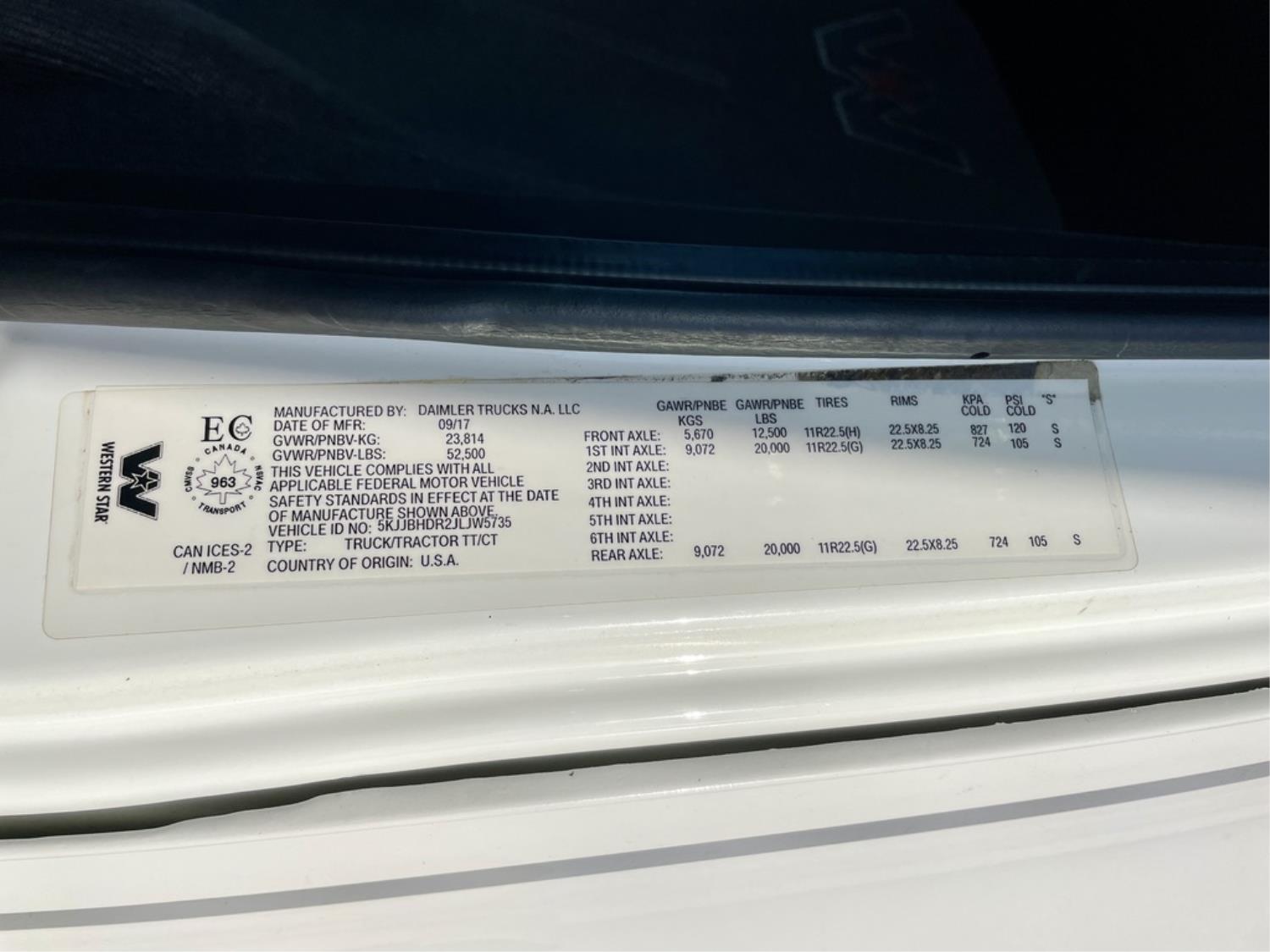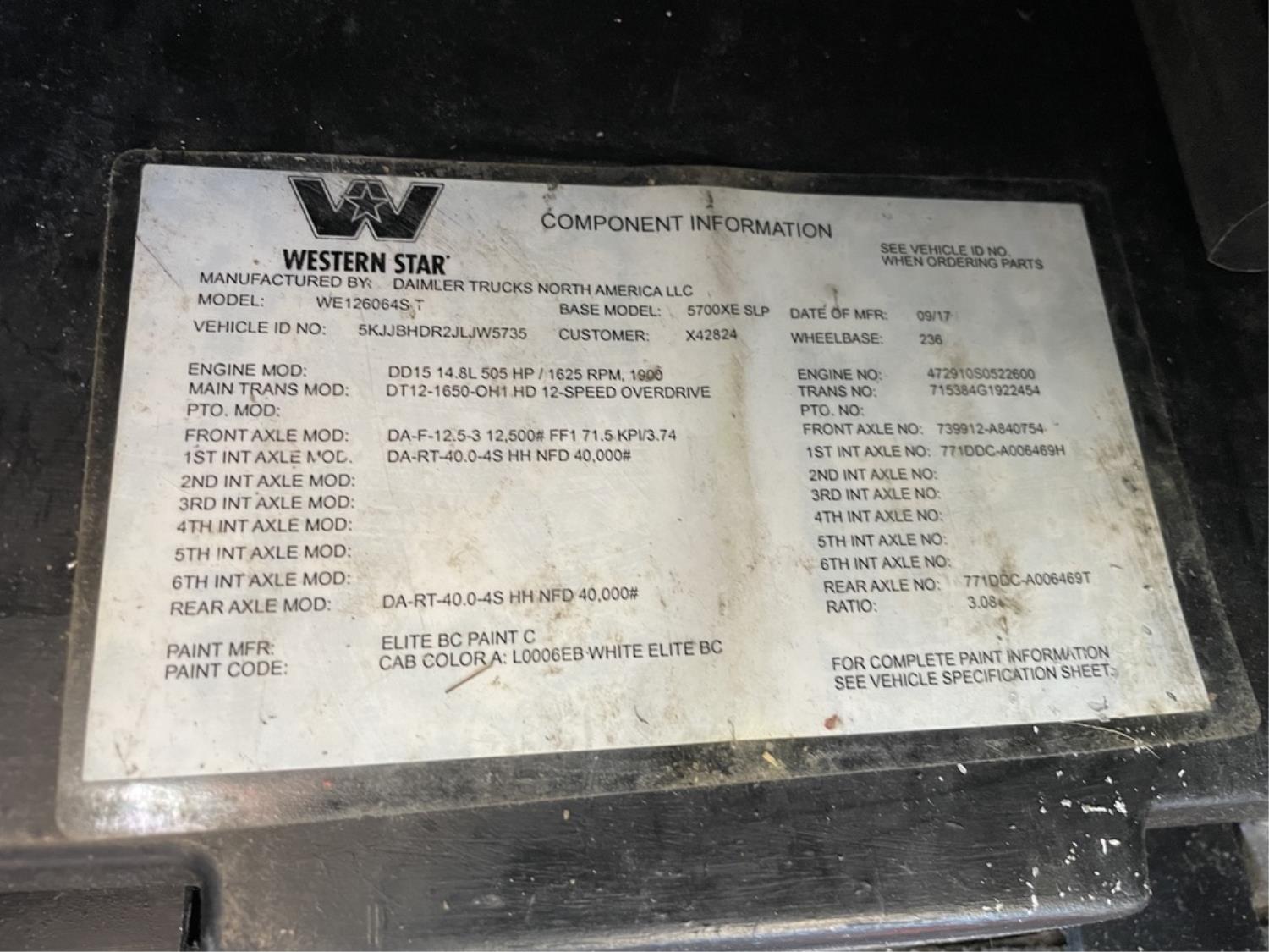 Detroit DD15 14.8 L 6 cylinder 505 HP diesel engine, engine brake, DT121750OH1HD 12 speed auto shift transmission, Webasto cab heater, high rise 60 inch sleeper, fridge, A/C, cruise control, leather interior, navigation system, air ride seats, radio, CB radio, Herd aluminum moose bumper, Airliner air ride suspension, 12,500 lb front axle, 40,000 lb rear axles, full lockers, 3.08 ratio, 236 inch WB, Freedom HF invertor, all aluminum wheels, 11R22.5 tires