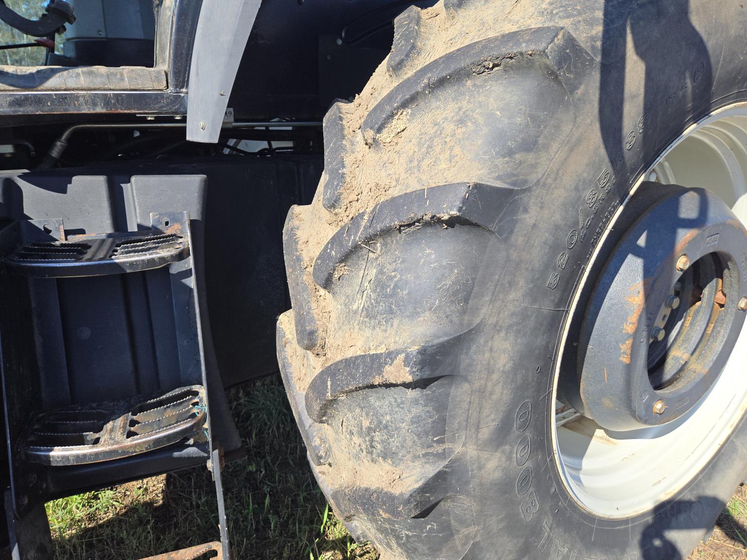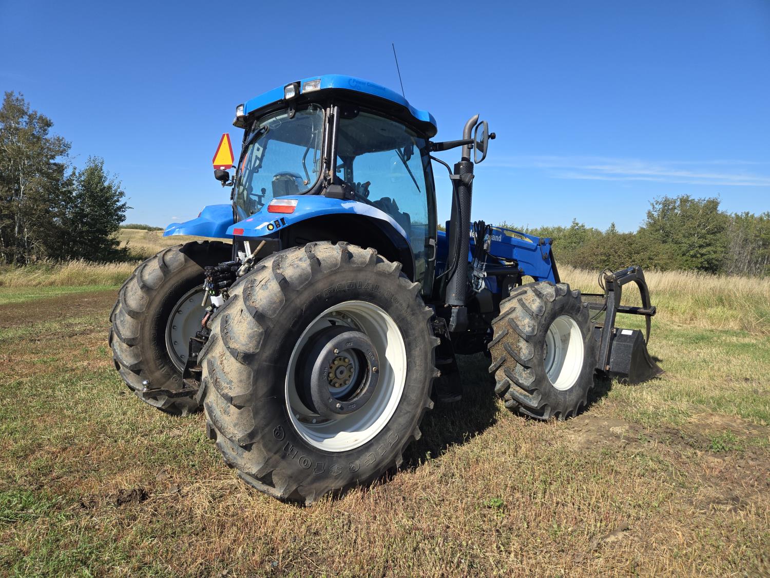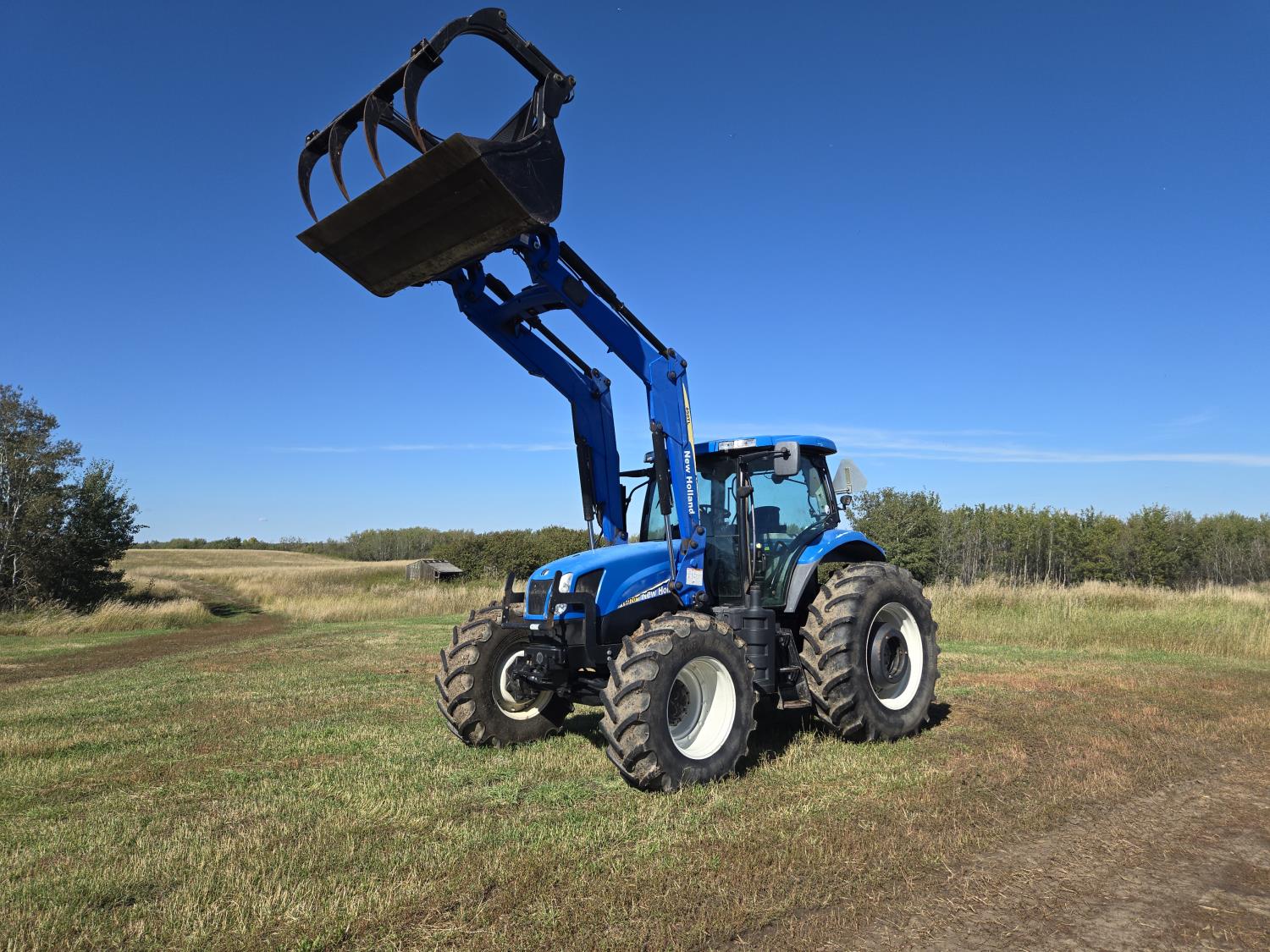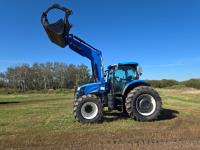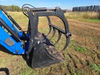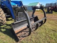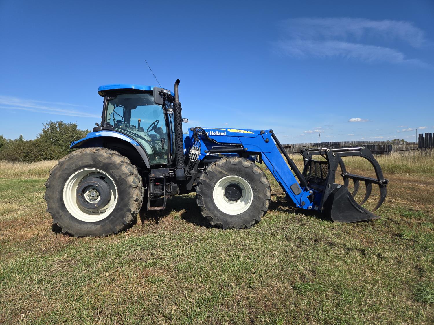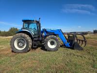 New Holland 850TL loader, Q/A, 91 inch bucket, grapple, mid mount hydraulic connection, FPT 6.7 6 cylinder 140 HP, engine, 120 PTO HP, 18 speed power shift transmission, cab, left hand reverser, joystick, A/C, radio, buddy seat, 540/1000 PTO, 4 rear hydraulic outlets, rear wheel weights, 420/85R28 front tires, 520/85R38 rear tires, NO 3 PTH Arms