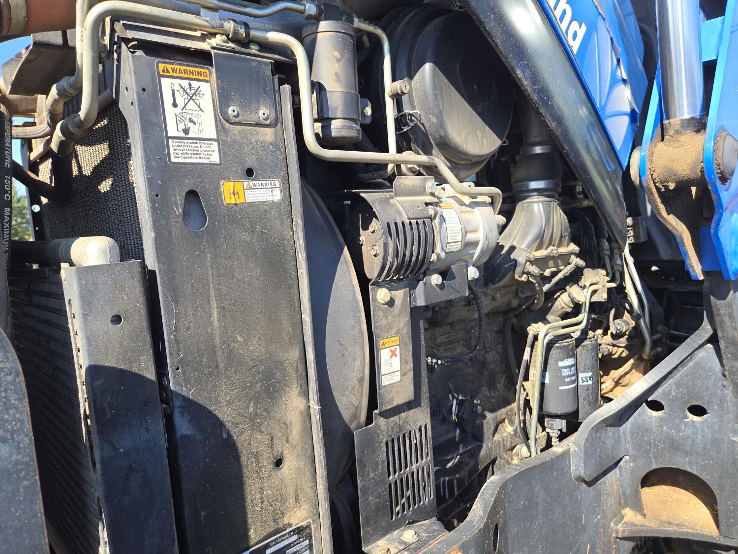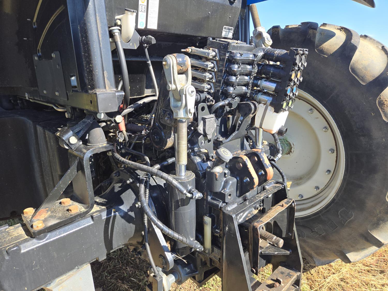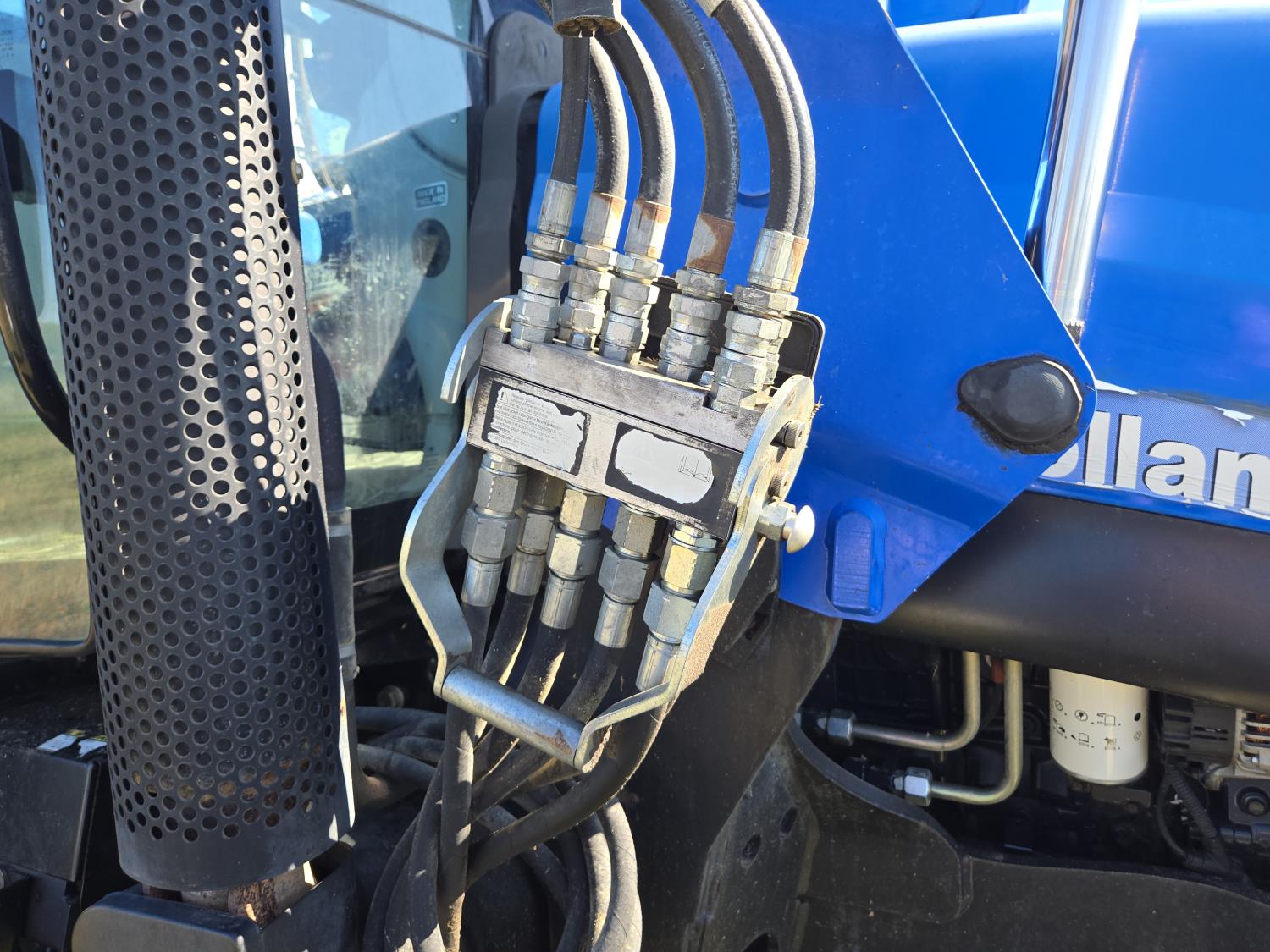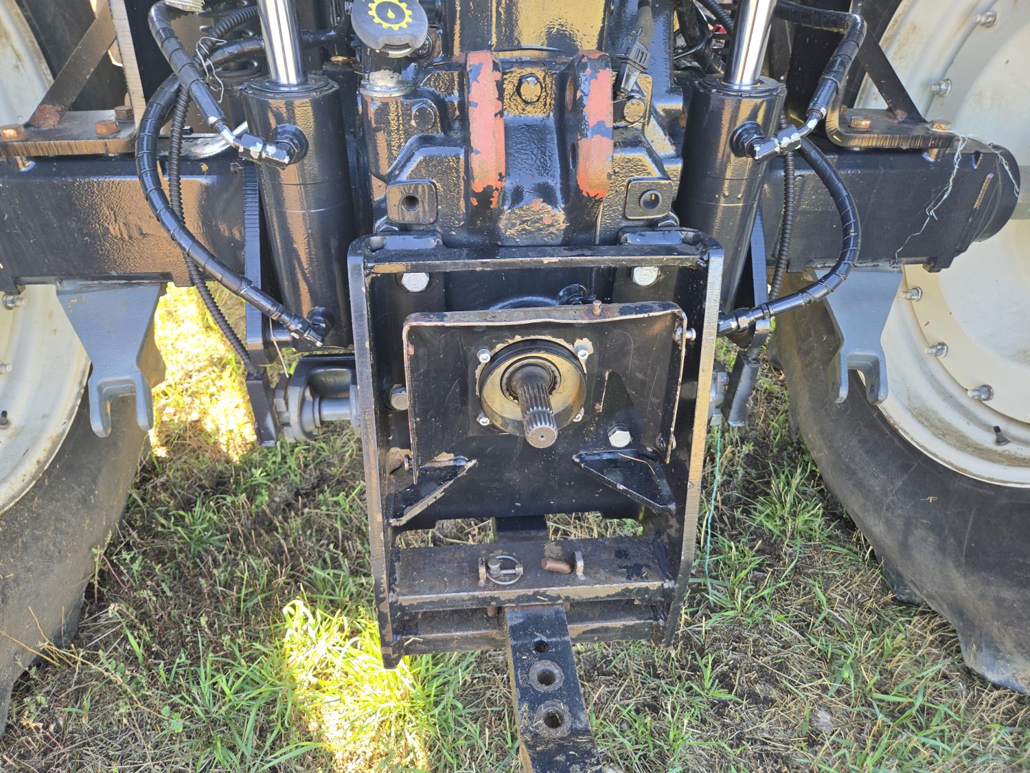 New Holland 850TL loader, Q/A, 91 inch bucket, grapple, mid mount hydraulic connection, FPT 6.7 6 cylinder 140 HP, engine, 120 PTO HP, 18 speed power shift transmission, cab, left hand reverser, joystick, A/C, radio, buddy seat, 540/1000 PTO, 4 rear hydraulic outlets, rear wheel weights, 420/85R28 front tires, 520/85R38 rear tires, NO 3 PTH Arms