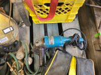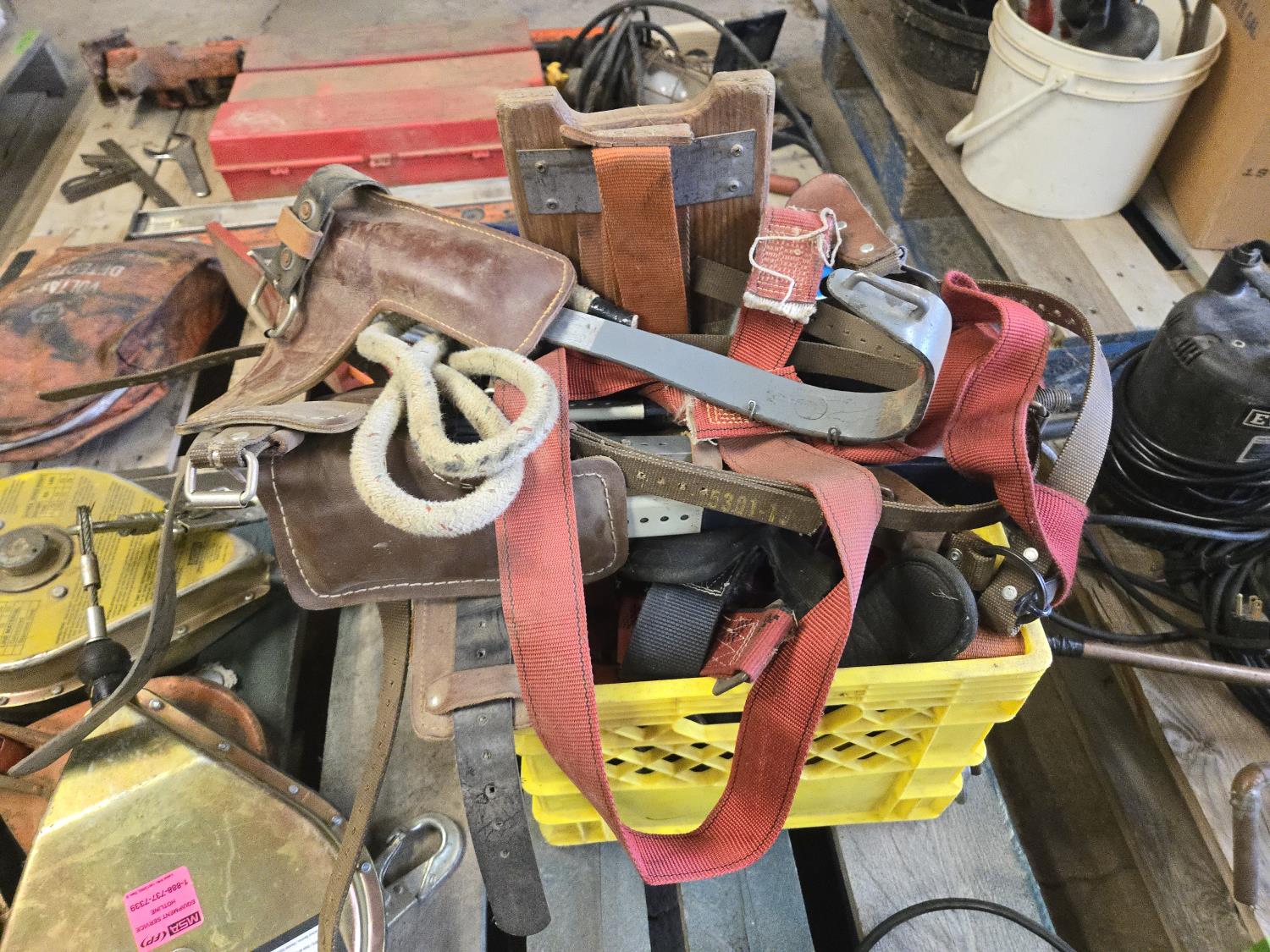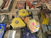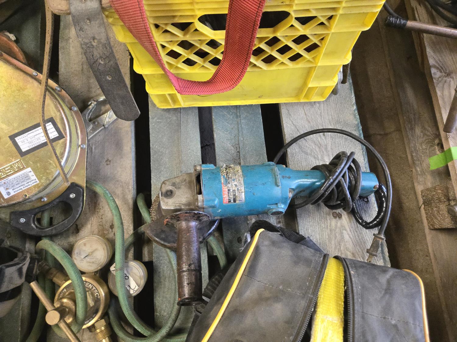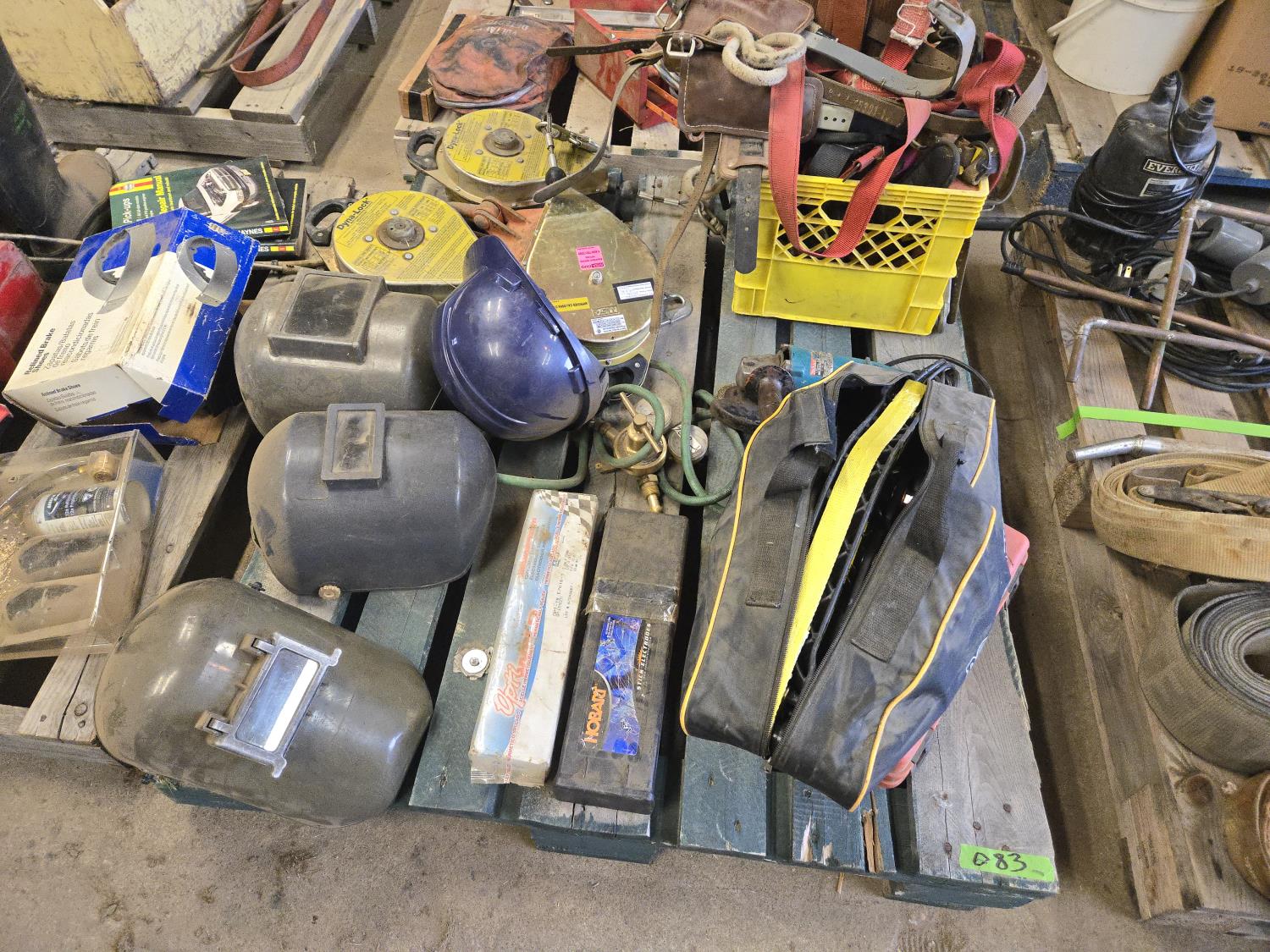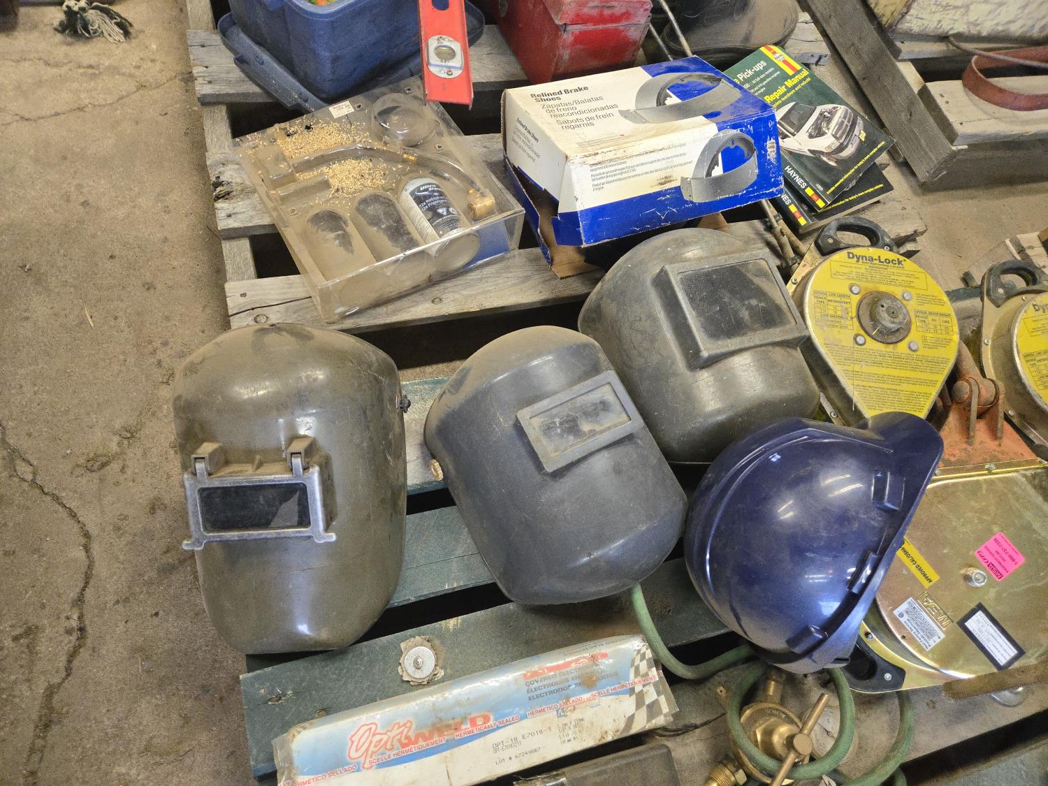 (3) Welding Helmets, (2) boxes of welding rods unopened, Bosch cordless drill with charger, (3) 30 ft Dyna Lock self retracting lanyards, Makita corded angle grinder, welding gauges, miscellaneous climbing gear