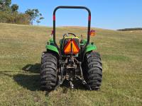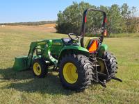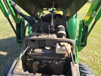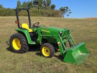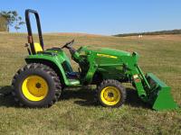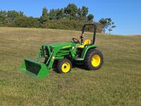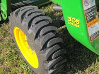 John Deere 305 loader, Q/A, 61 inch bucket, John Deere 1.6 L 3 cylinder 31 HP, diesel engine, 25 PTO HP, hydro 2 range transmission, 540 PTO, 3 point hitch, 25X6.50-14 front tires, 15-19.5- rear tires
