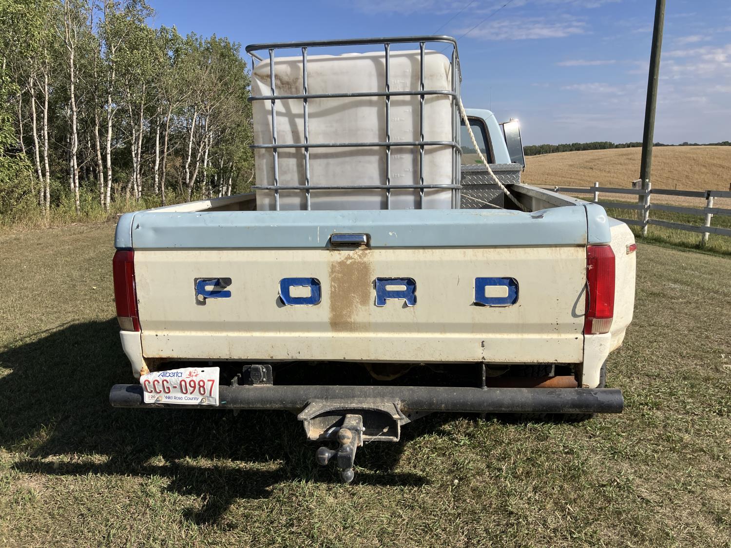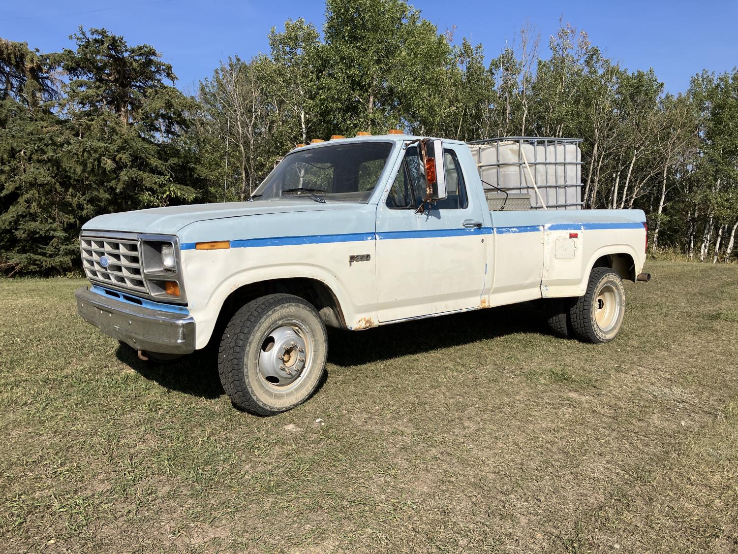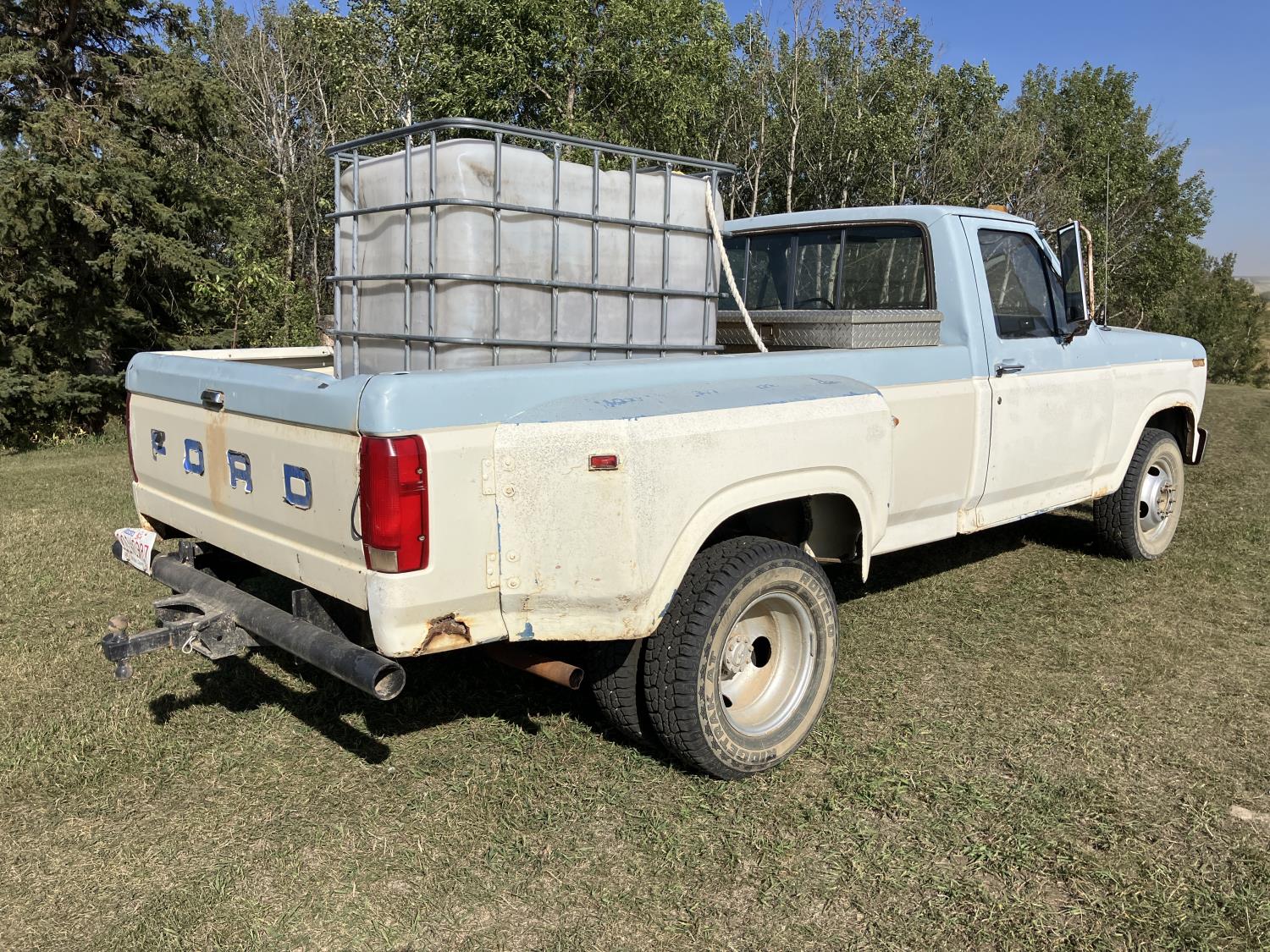 V8, gas, 4 speed manual transmission, 8 ft box, 1000 liter caged poly tank with discharge hose, receiver hitch and ball, dual fuel tanks, 225/75R16 tires