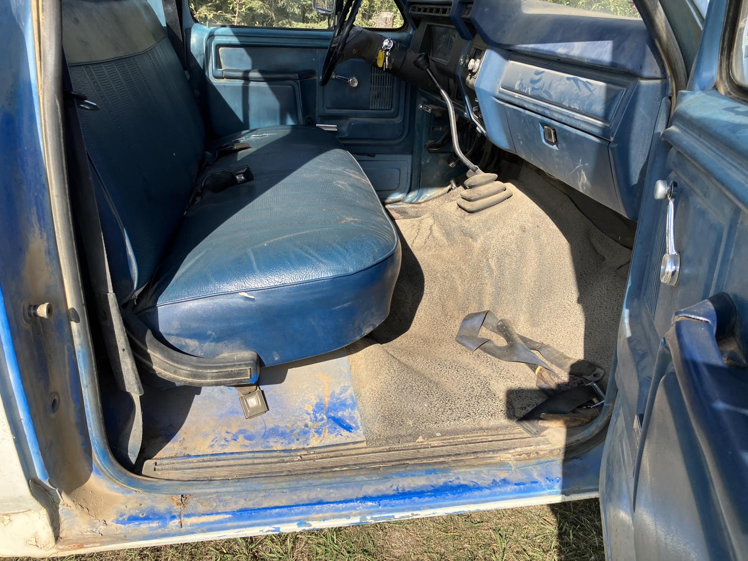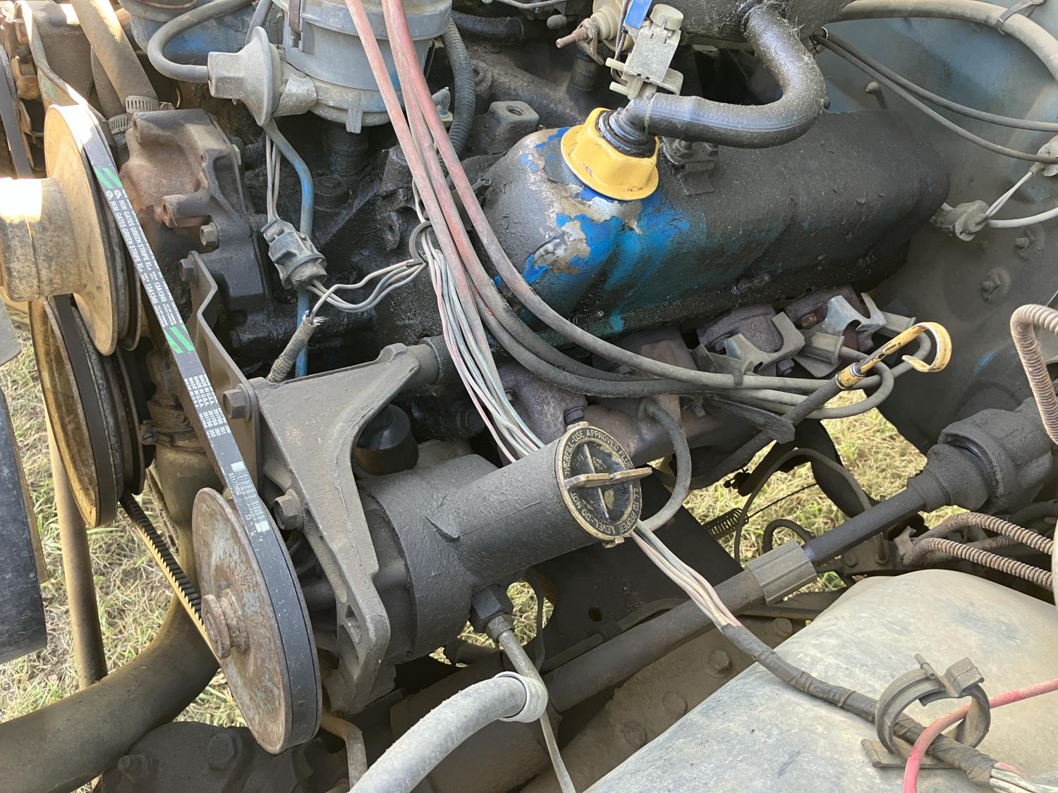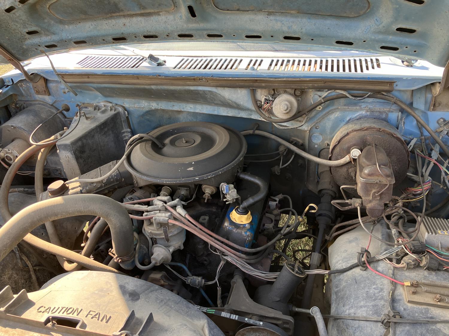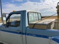 V8, gas, 4 speed manual transmission, 8 ft box, 1000 liter caged poly tank with discharge hose, receiver hitch and ball, dual fuel tanks, 225/75R16 tires