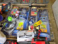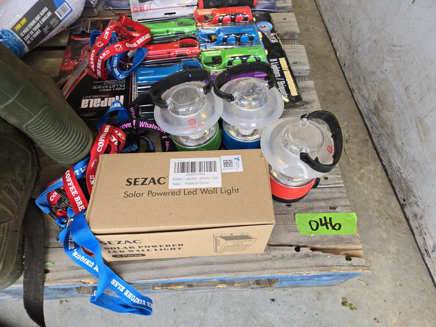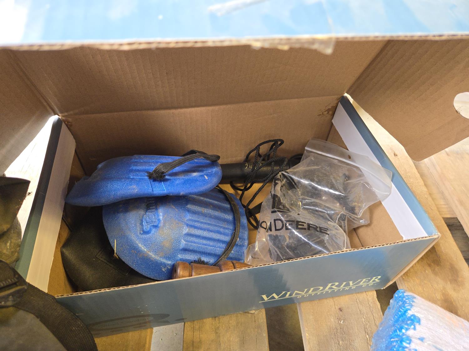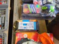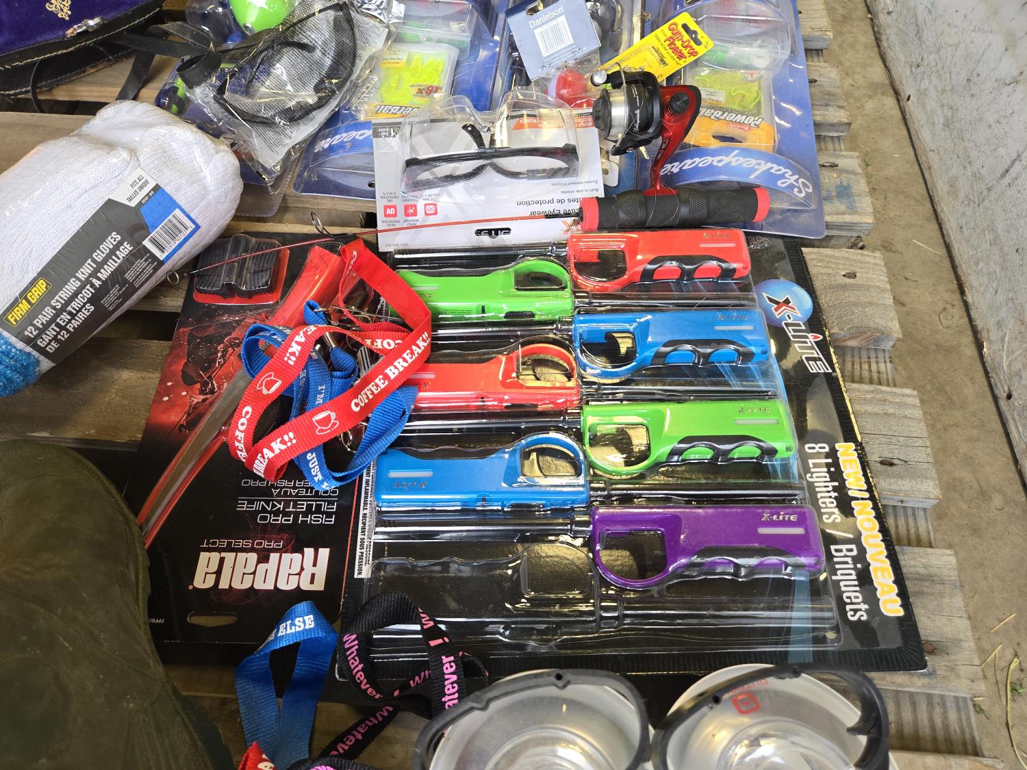 (7) lighters, pair of size 12 waders, Tasco 10X50 binoculars, Rapala fishing knife, (12) string unit gloves, campfire torch, miscellaneous tackle and other items mostly unused