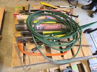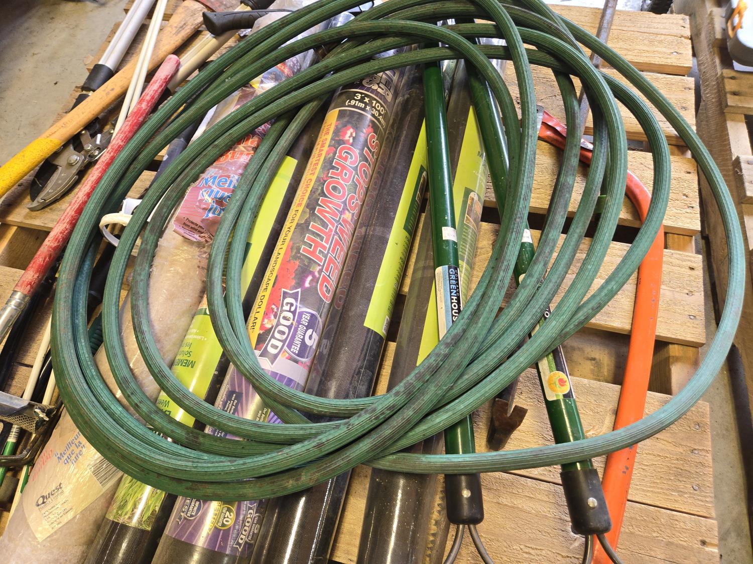 (2) Rakes, bolt cutters, (2) hammers, cross cut saw, heavy duty loopers, qty of unused landscape fabric, misc items