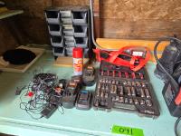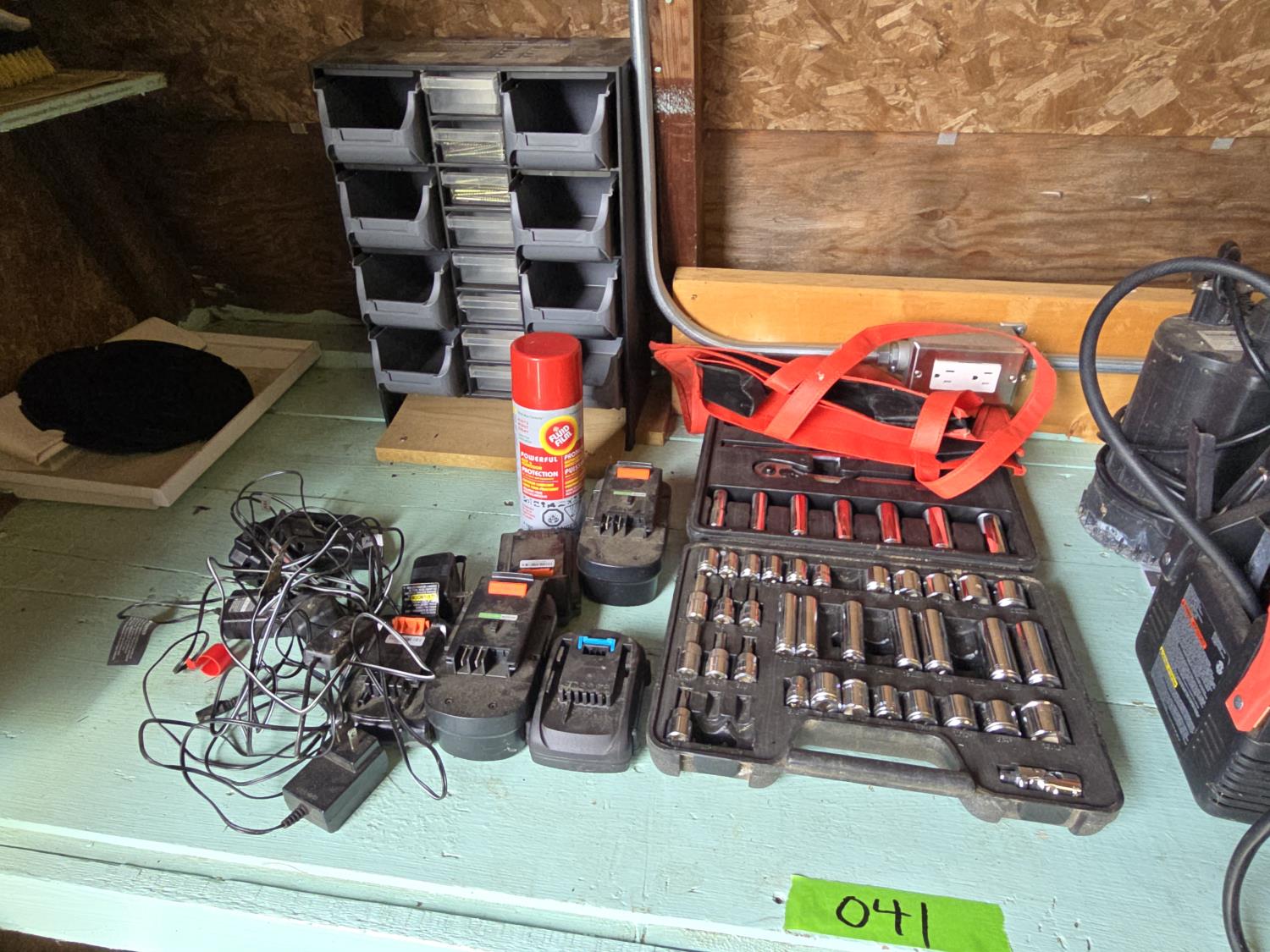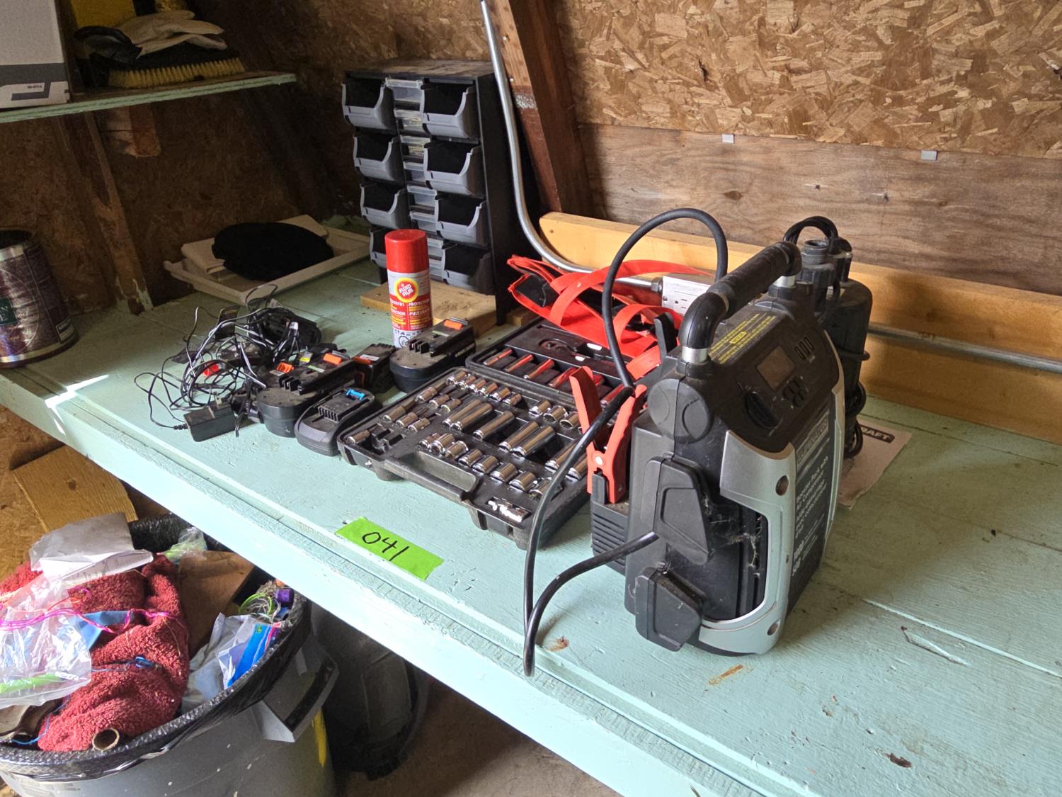 Eliminator booster pack with air compressor, Mastercraft utility pump, socket set, various batteries, storage bin with contents, Black & Decker cordless tools