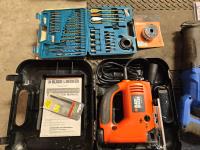 Altrade drill bit set, B&D electric jigsaw, grease gun, (2) Mastercraft reciprocating saws, B&D heat gun, leather tool belt, Mastercraft angle grinder