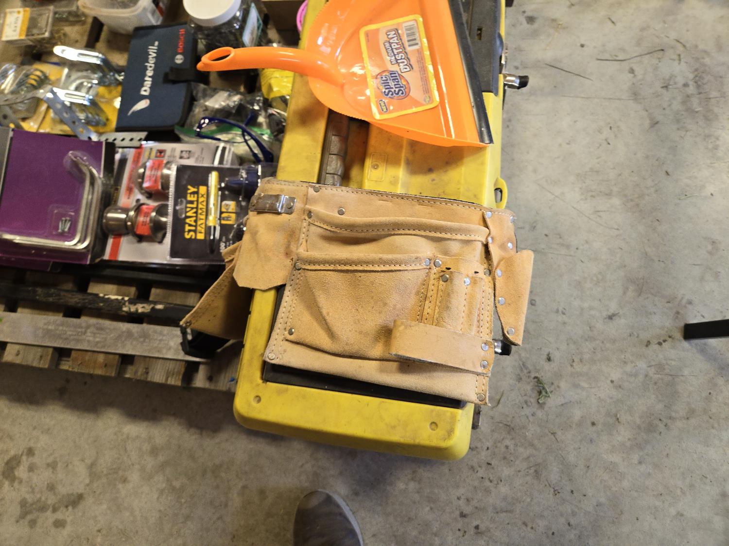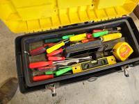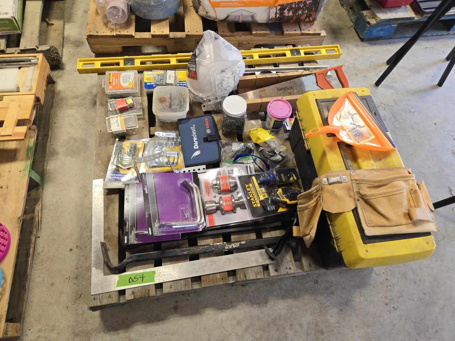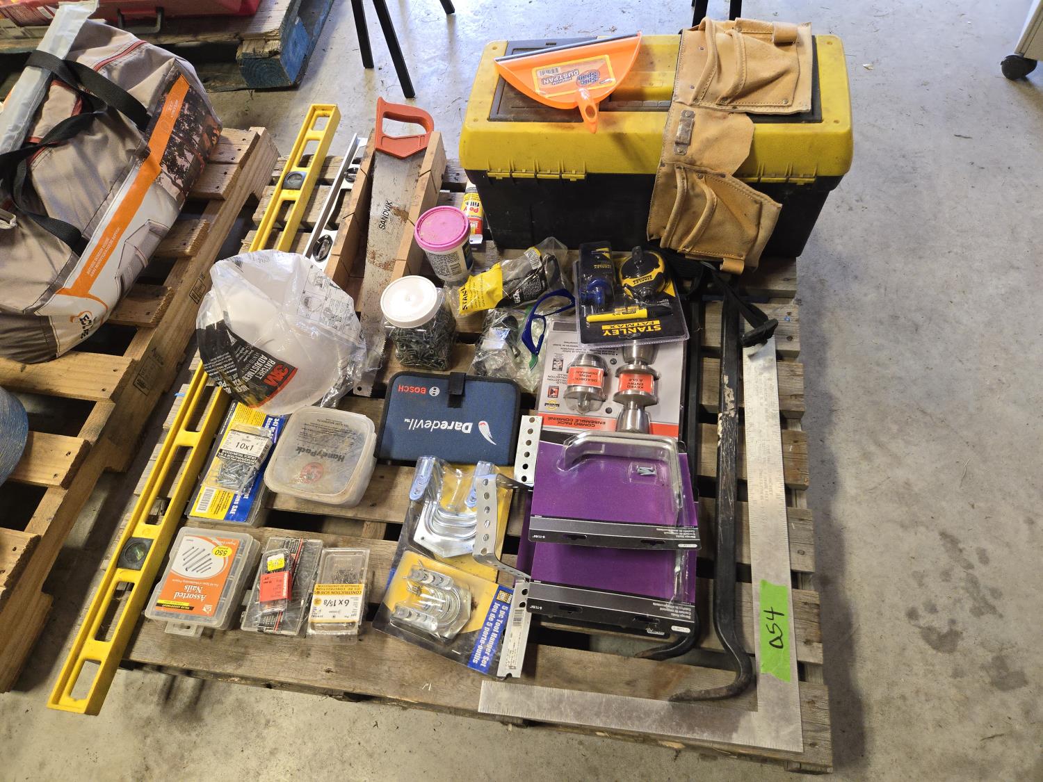 4 ft level, 2 ft level, Unused hard hat, leather tool belt, Bosch wood bit drill set, Stanley layout set Unused, Tool box with contents, miscellaneous items