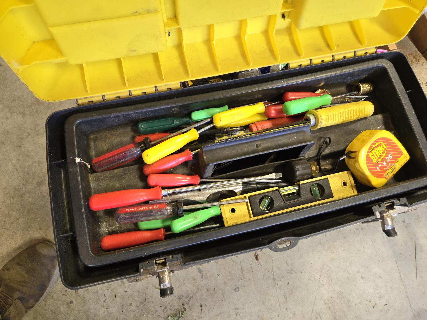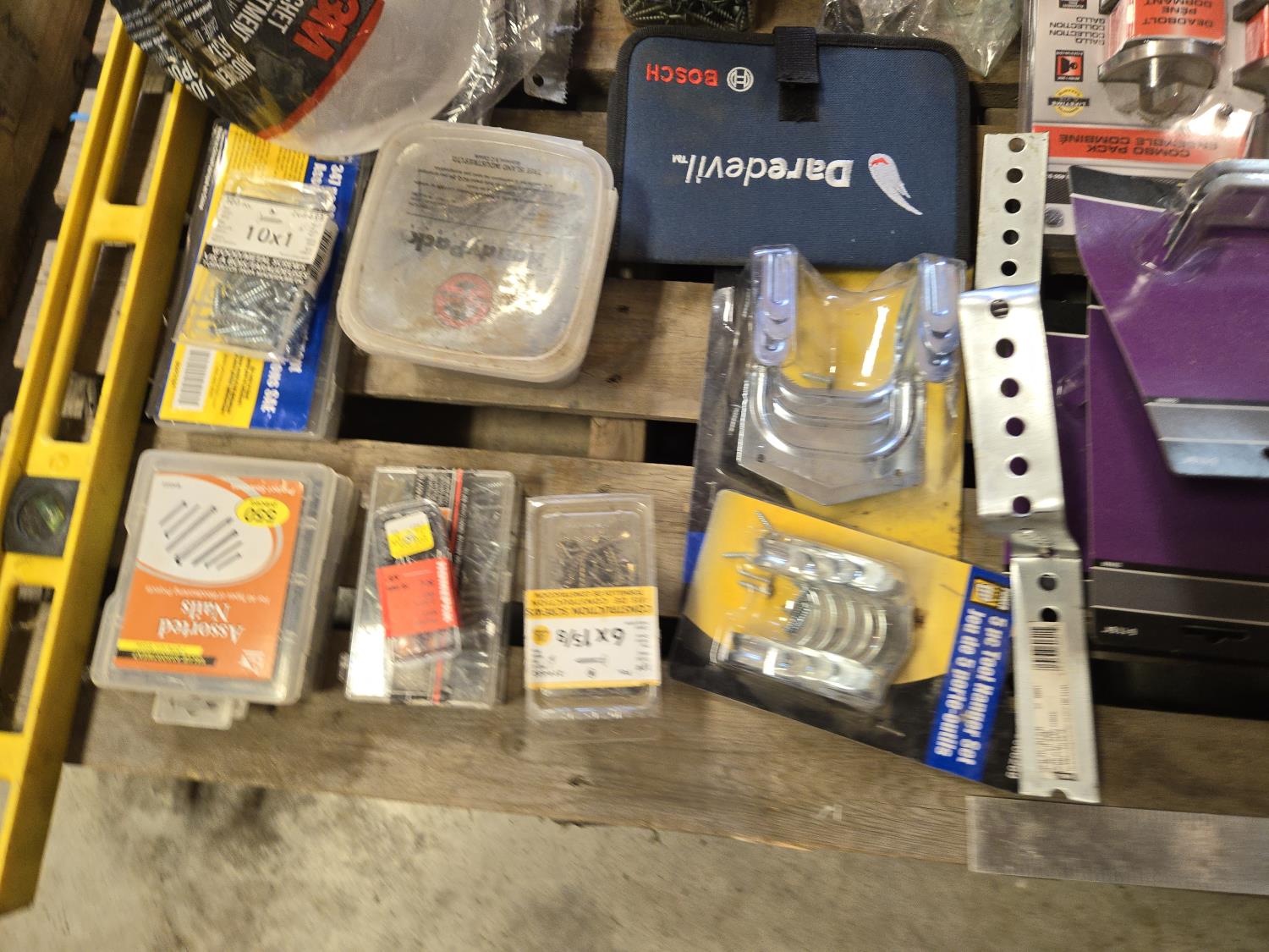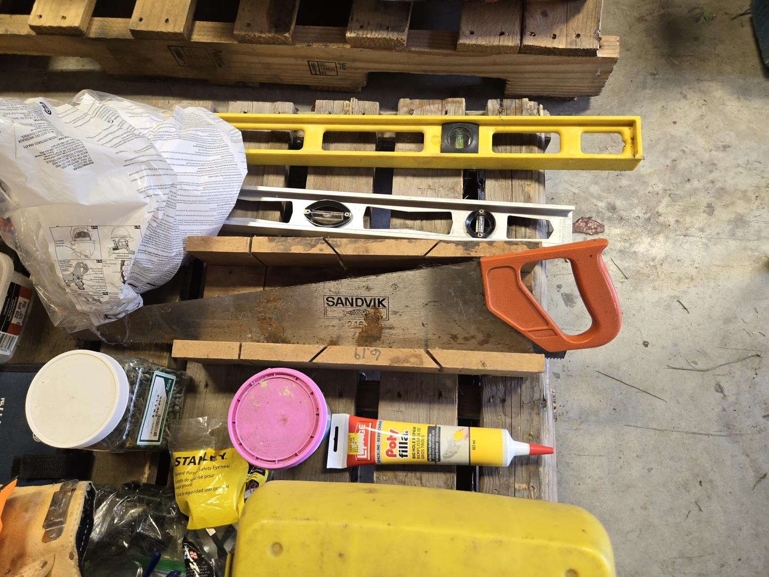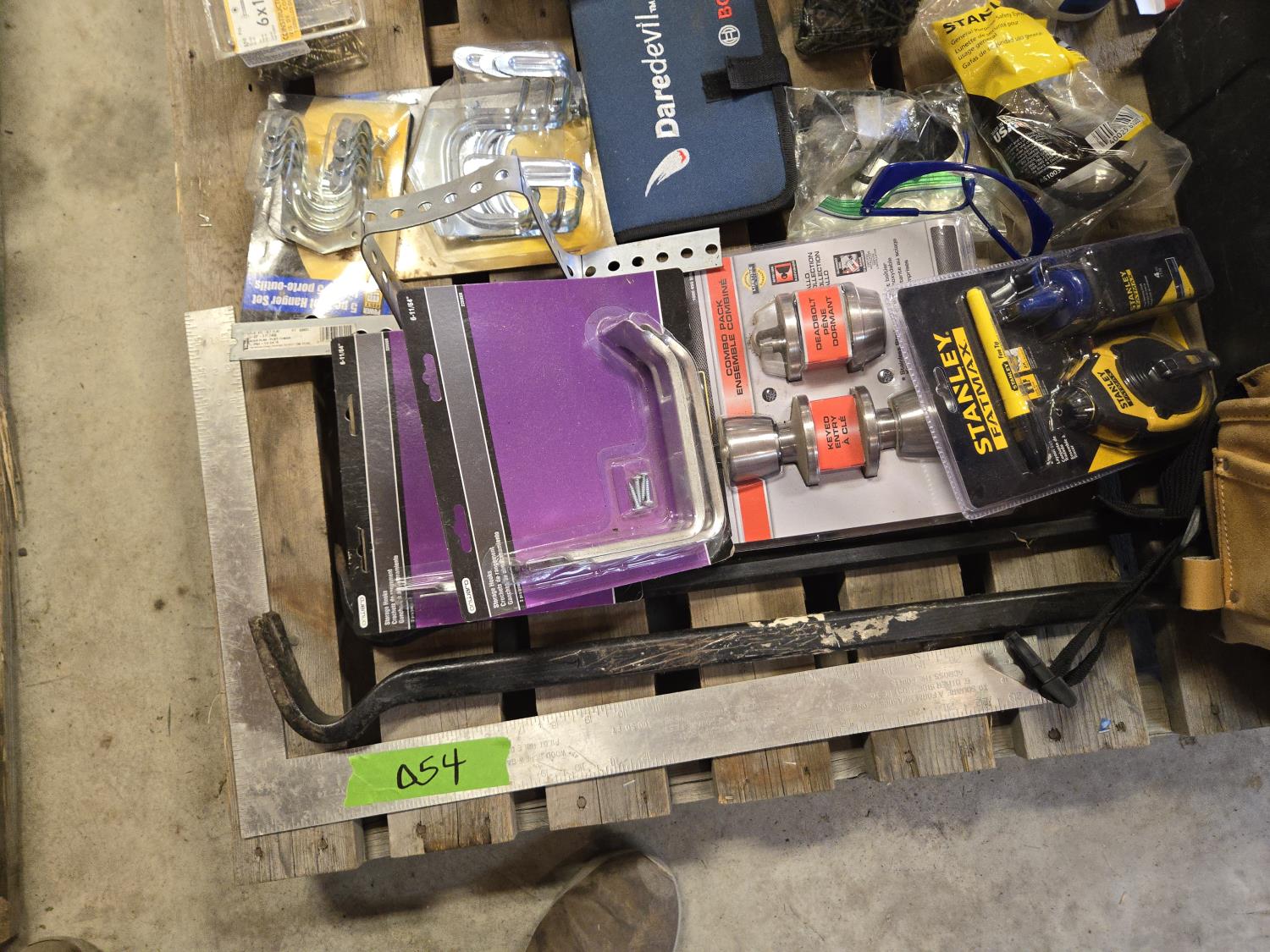 4 ft level, 2 ft level, Unused hard hat, leather tool belt, Bosch wood bit drill set, Stanley layout set Unused, Tool box with contents, miscellaneous items