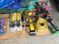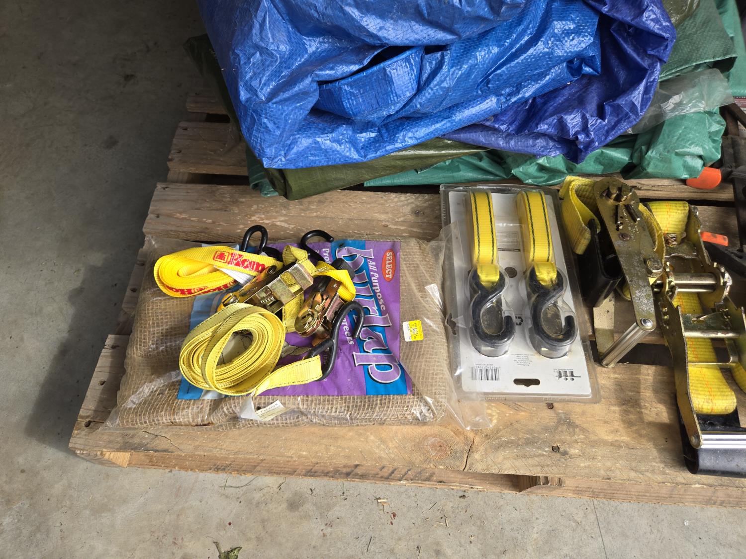 Qty of poly tarps, 40 inch X 9.8 ft Burlap unused, cargo straps, miscellaneous tools