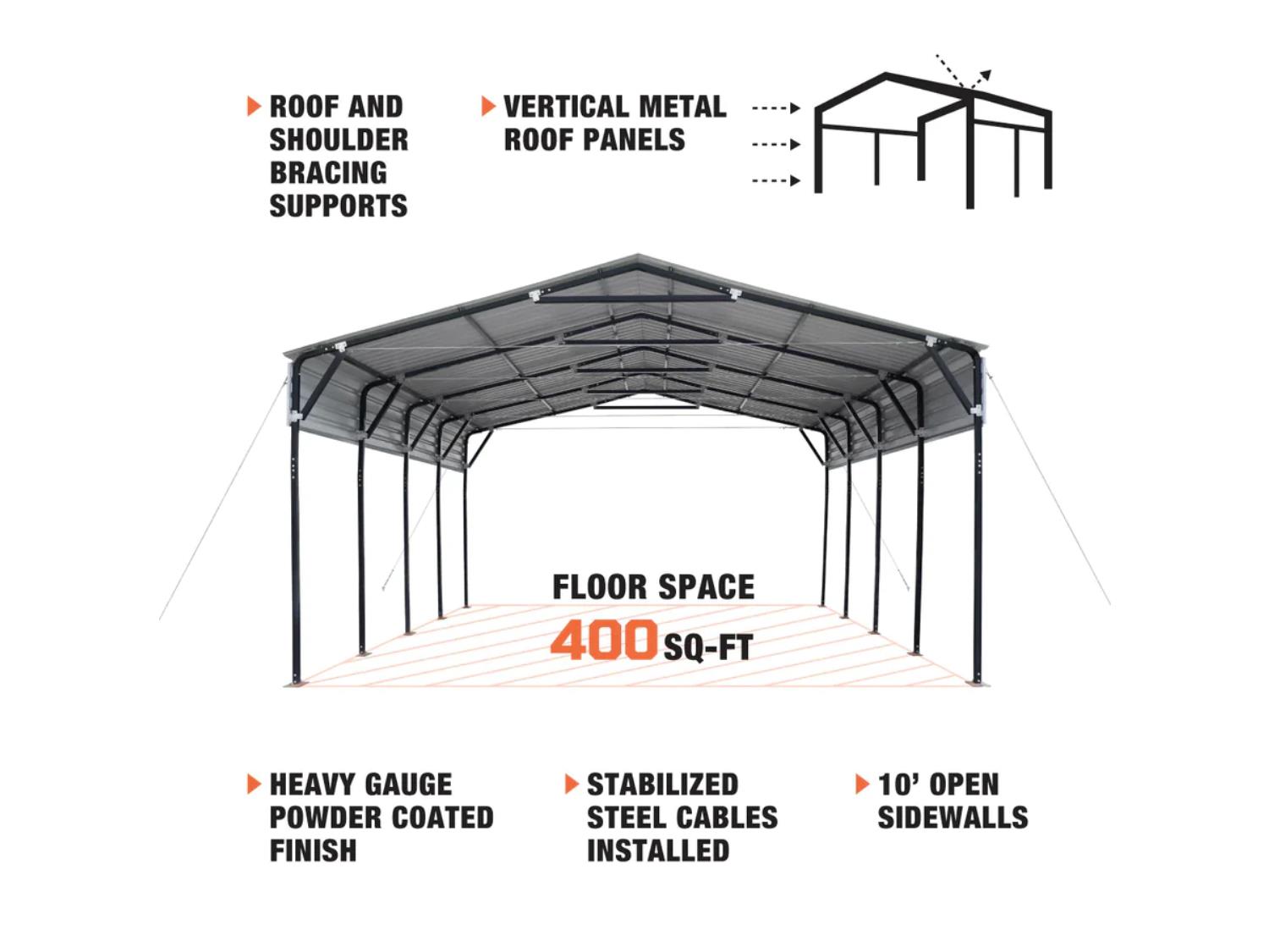 10 ft Open Sidewalls, 400 Sq-Ft, 27 GA Corrugated Panels