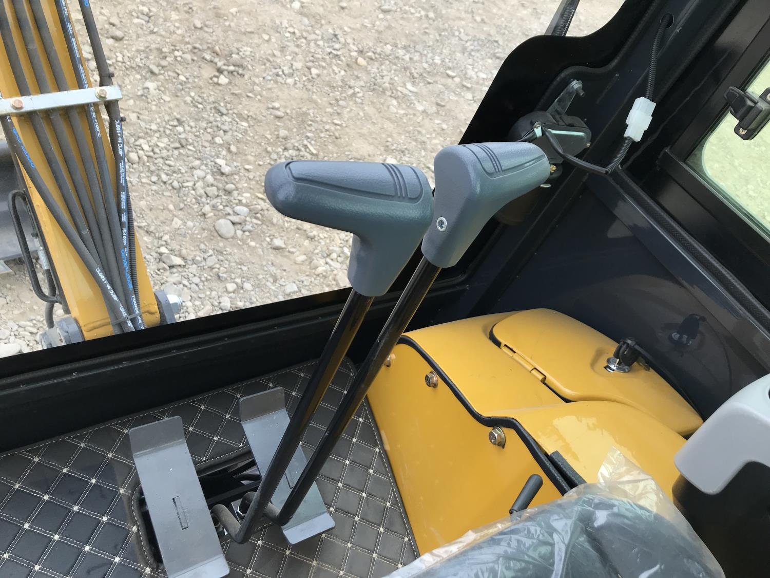 Enclosed cab, A/C, 17 inch dig bucket, manual coupler, hydraulic thumb, 28 inch stick, backfill blade, 7 inch rubber tracks